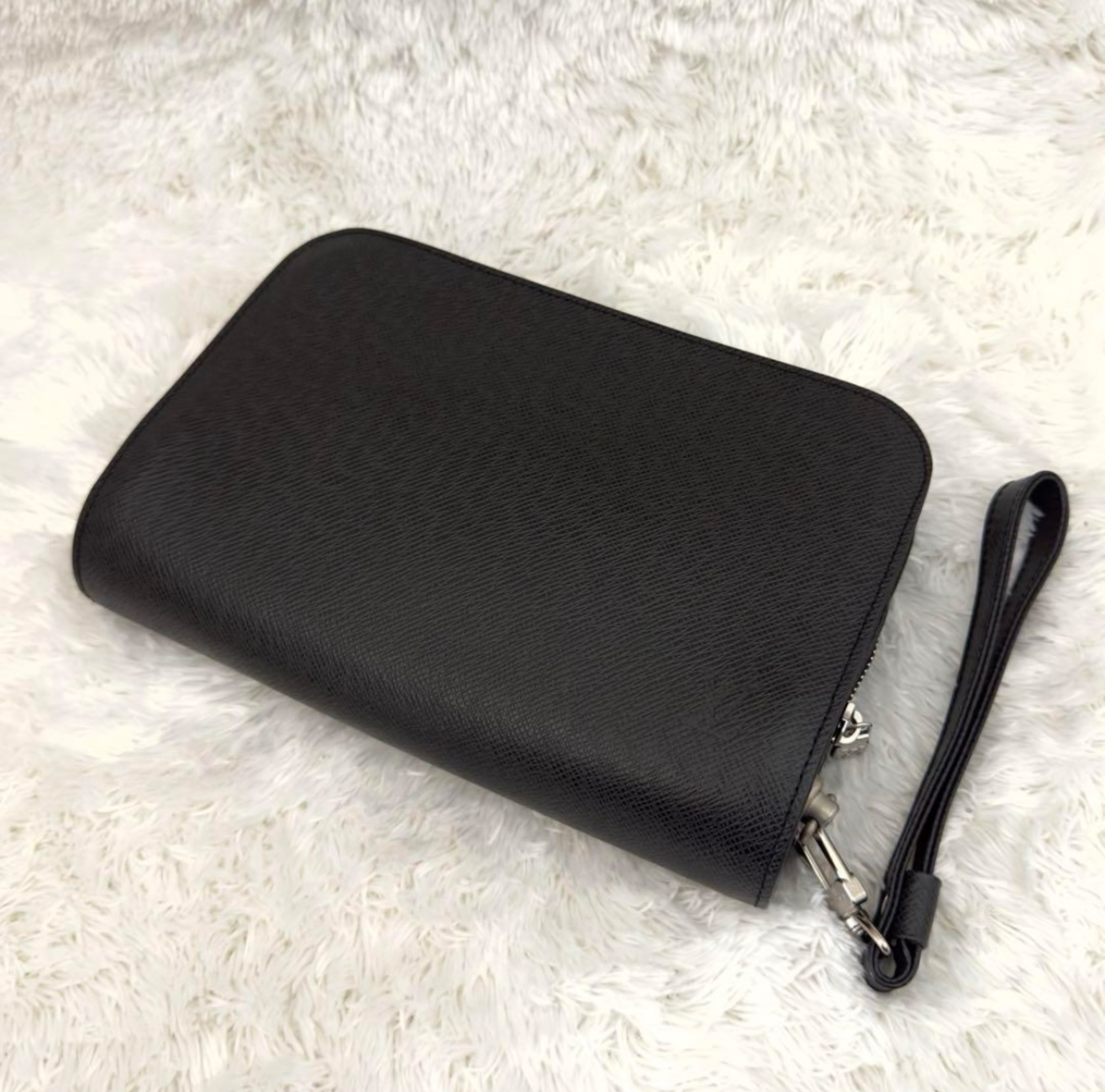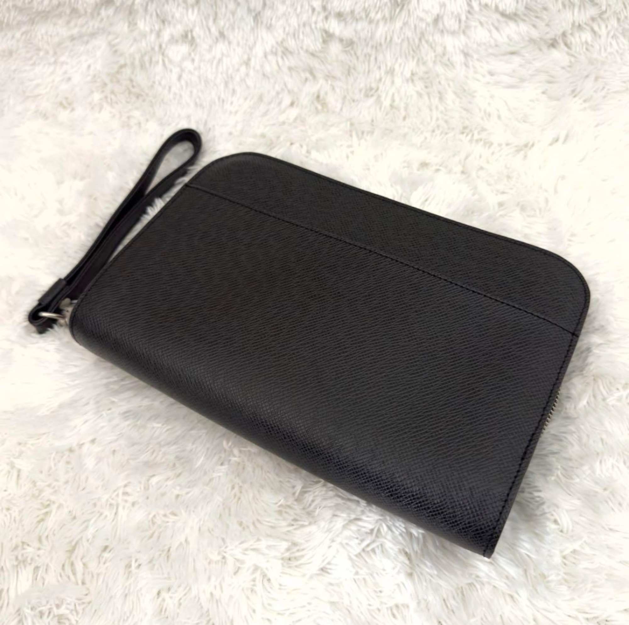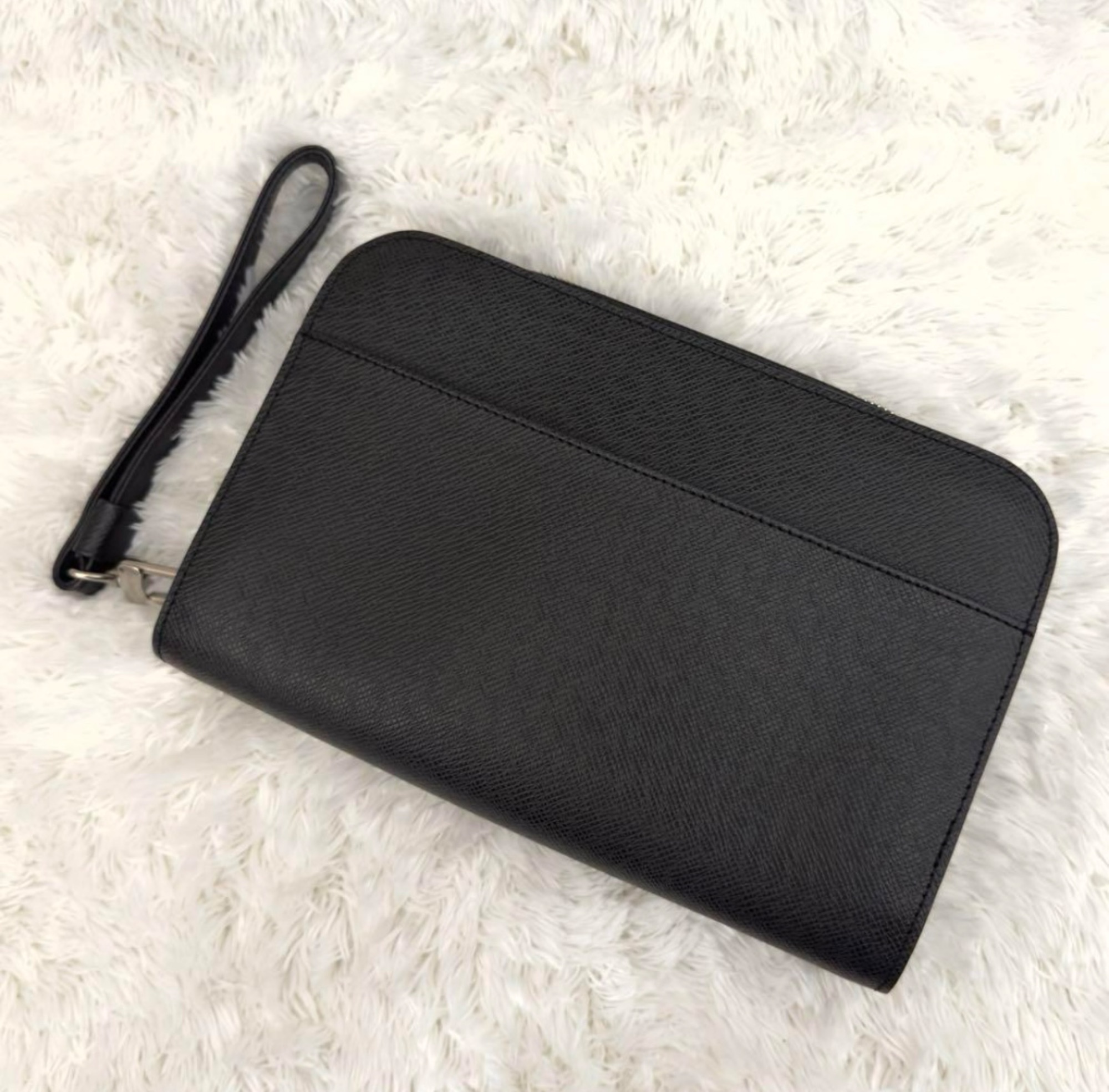 ブラックレザーのジップ付きクラッチバッグ、ストラップ付きで持ち運び便利。