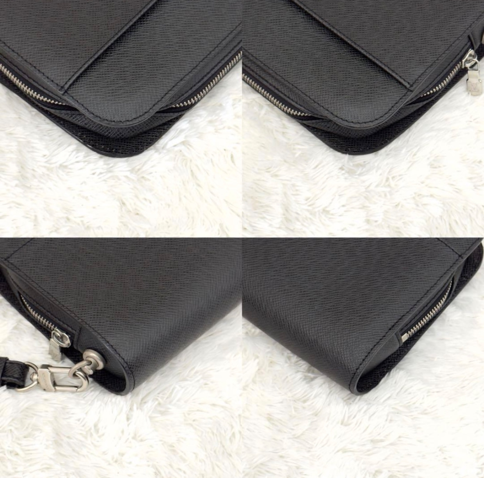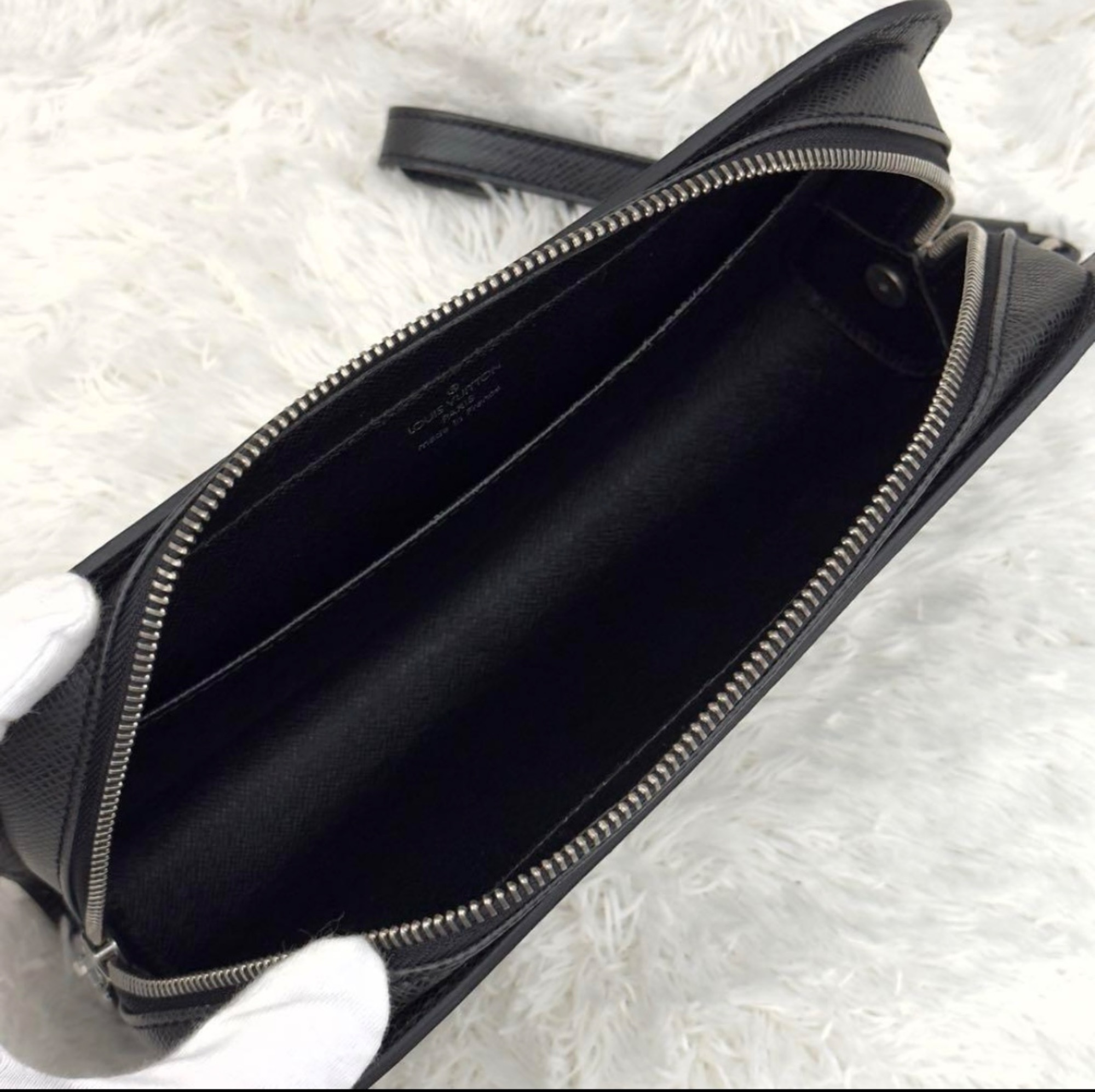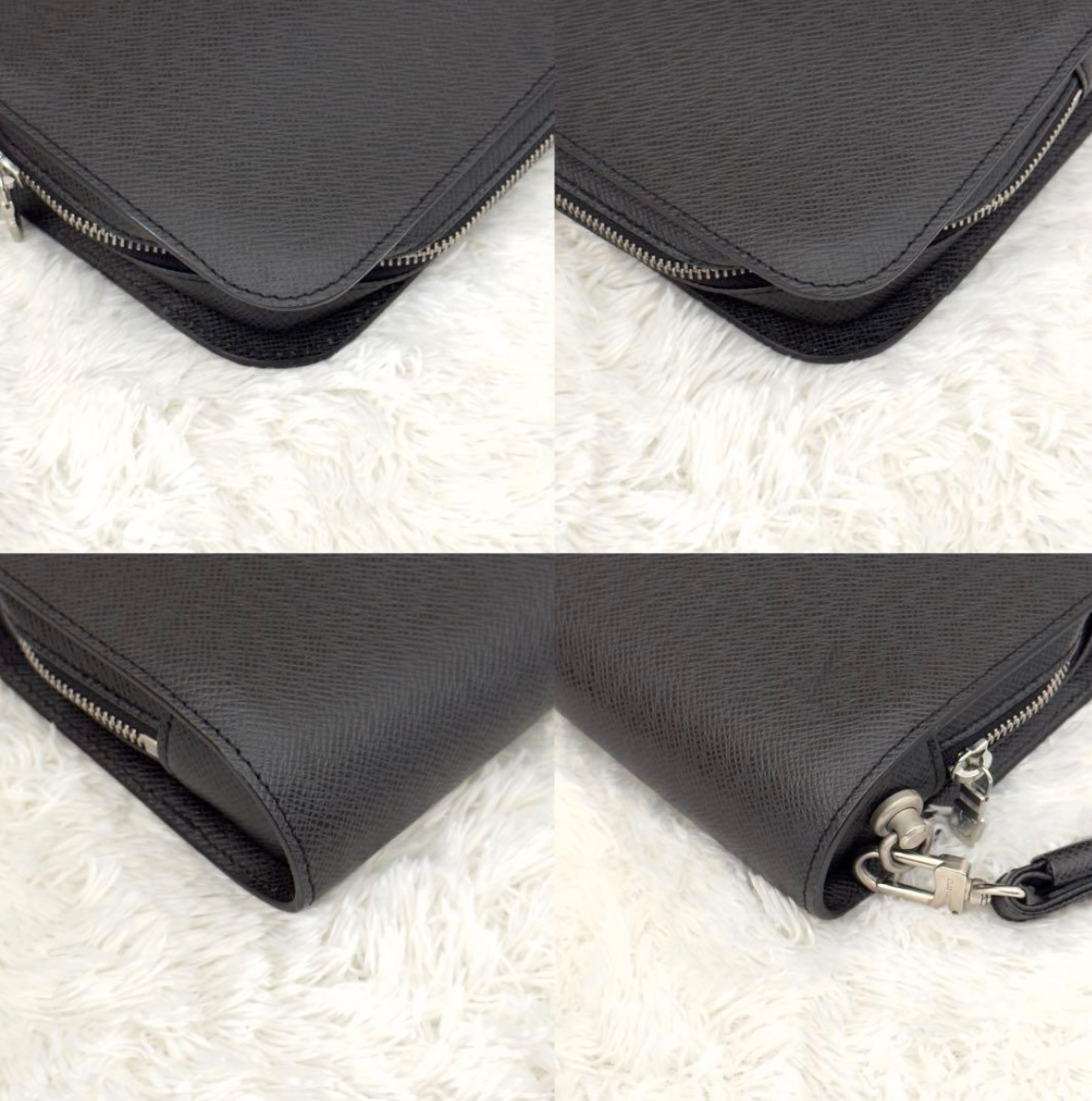 ブラックレザーのジップ付きクラッチバッグ、ストラップ付きで持ち運び便利。