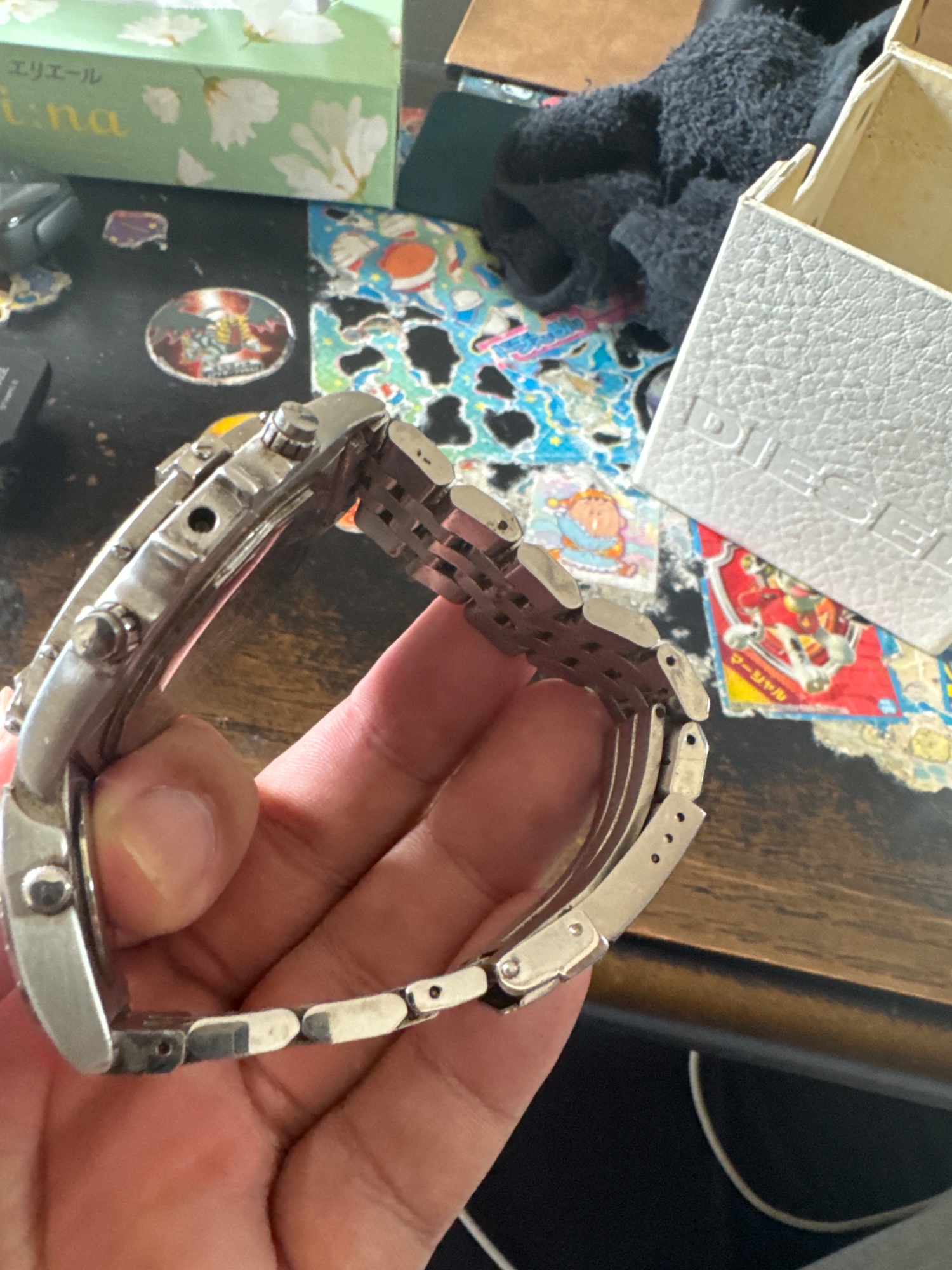 付属品等無し。18年前ごろに購入。購入から1年程使用、その後10年以上使用無し。リューズを紛失を気に使用無し