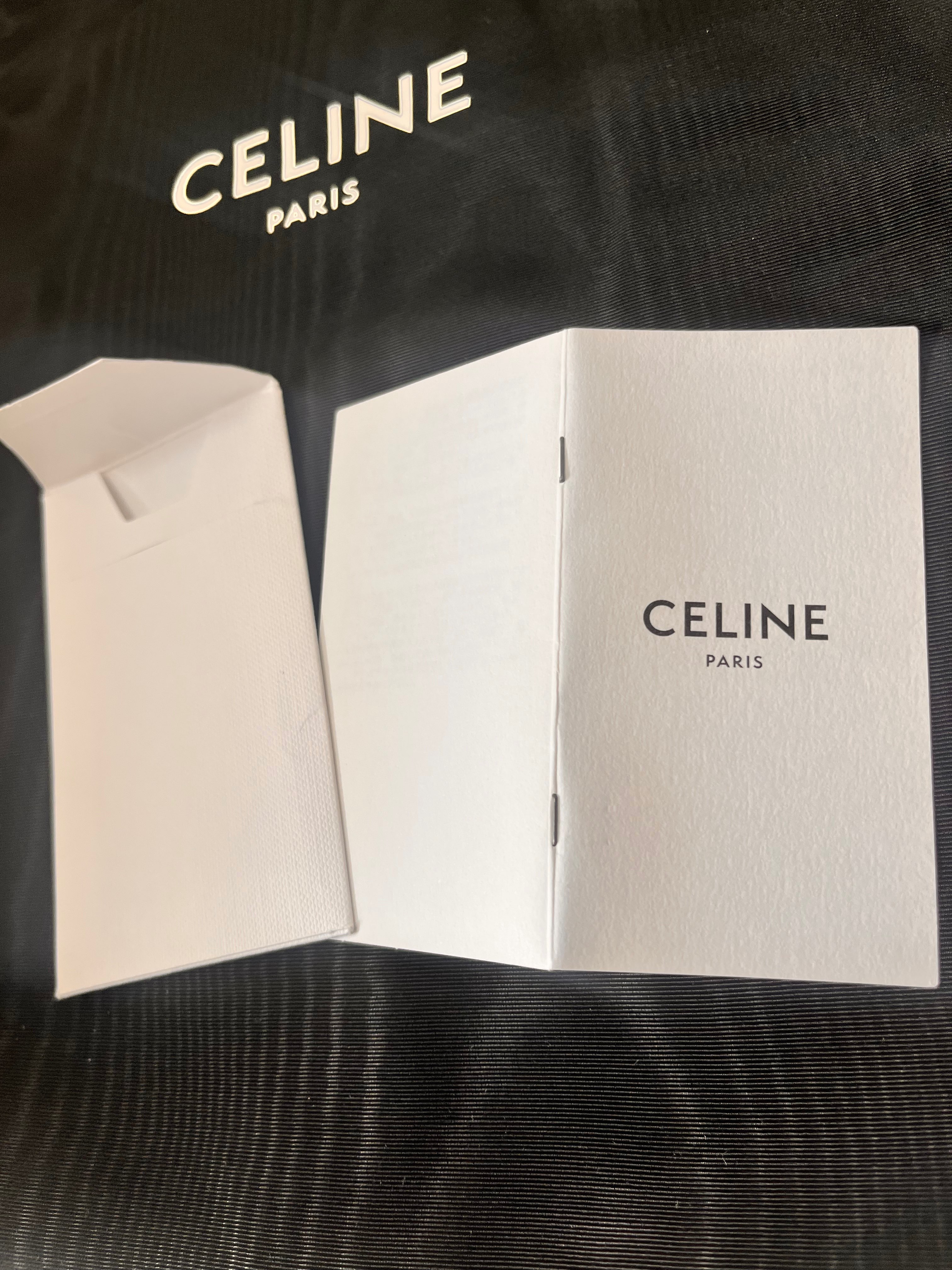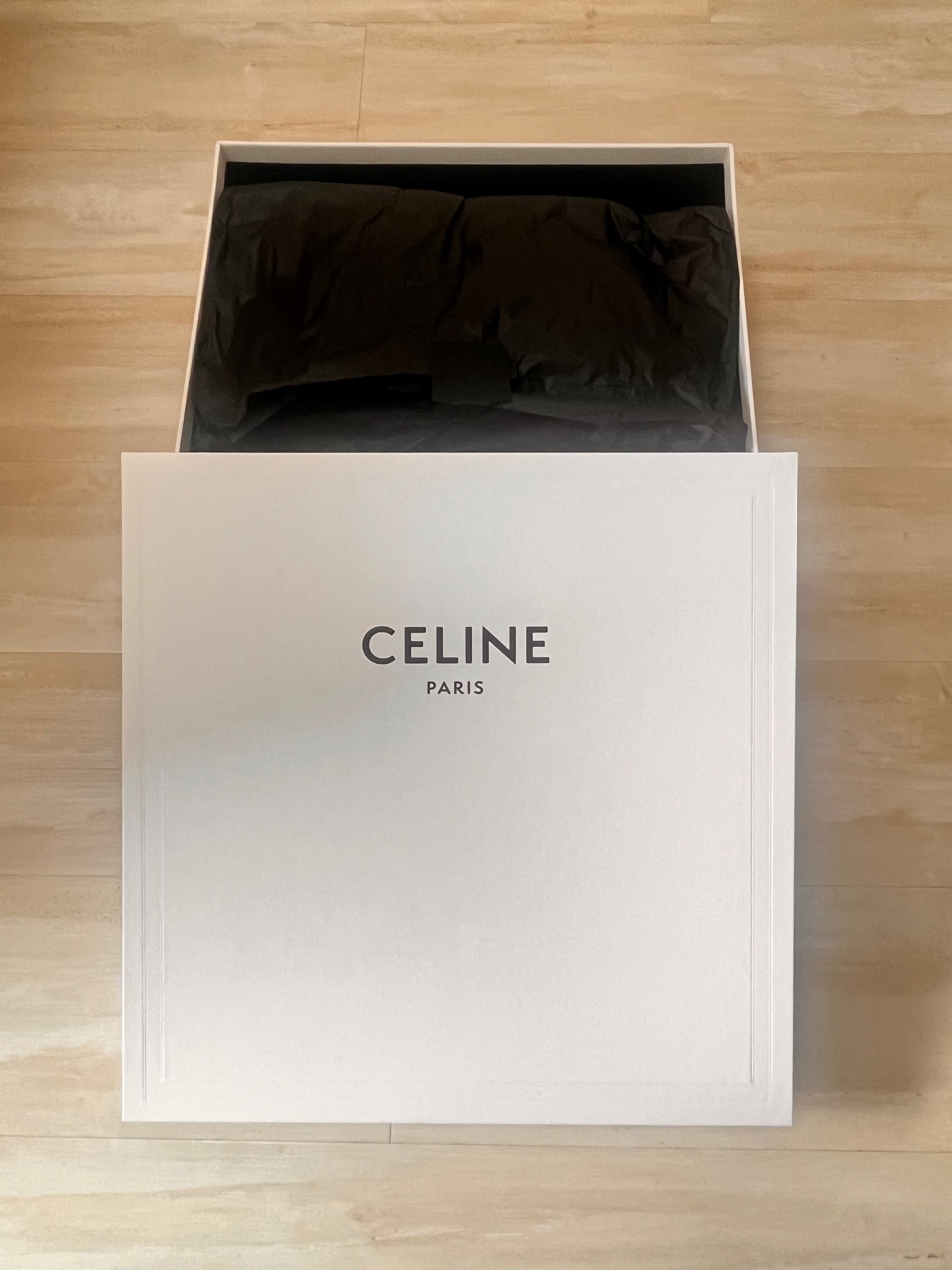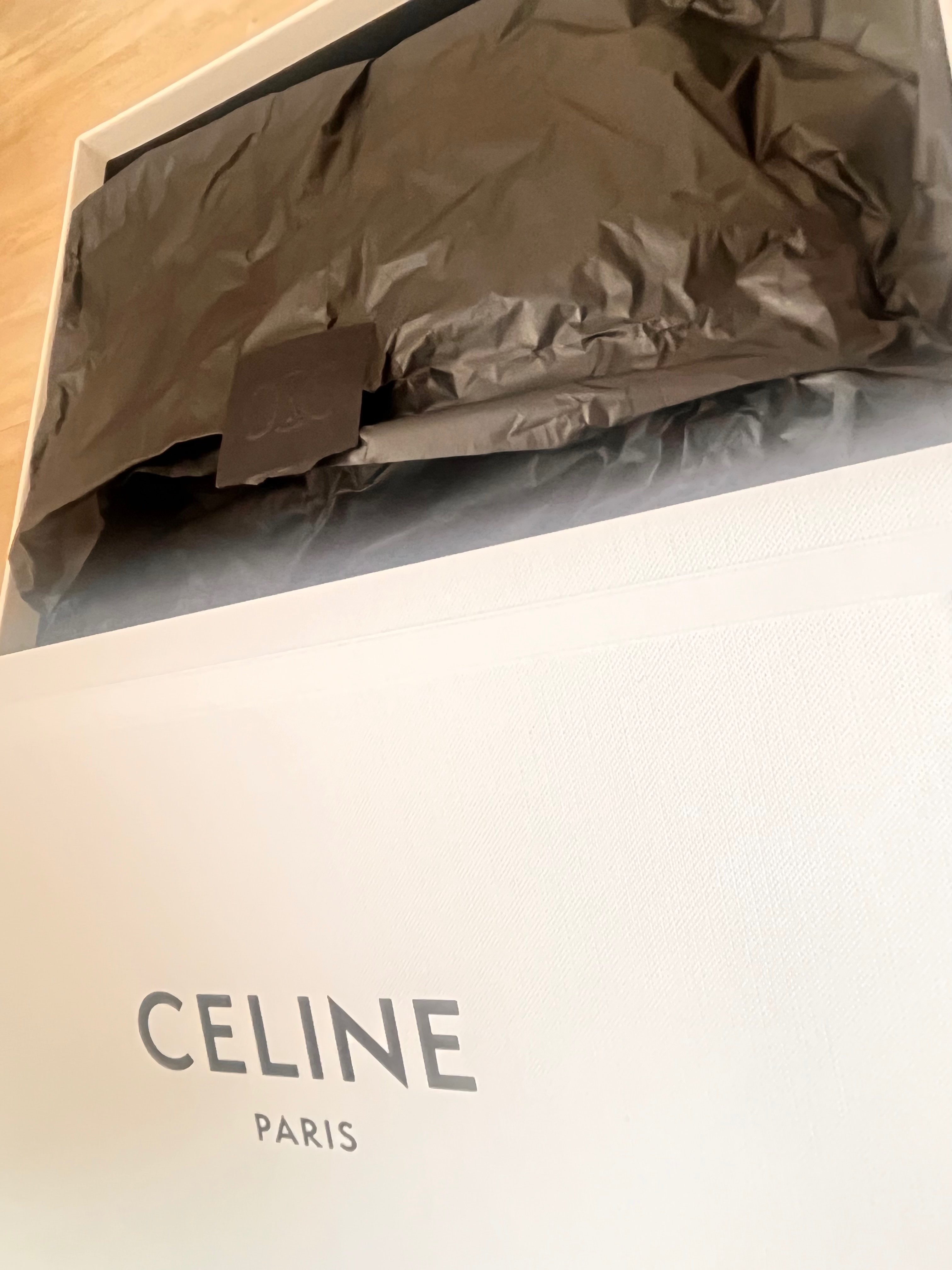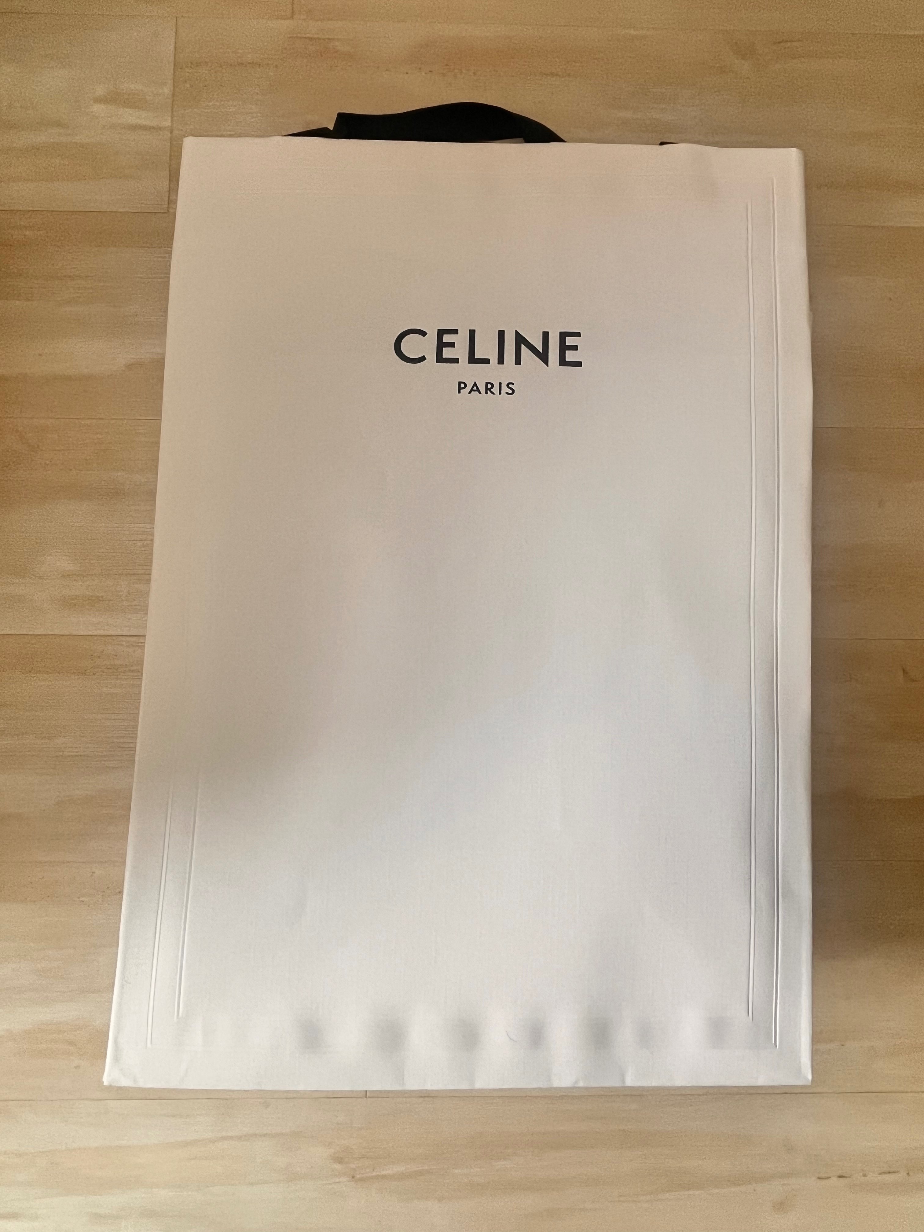 ショップ袋、保護袋、箱、バッグ内の白い保護紙、黒のラッピング紙、本体、ベルト、注意書き書類