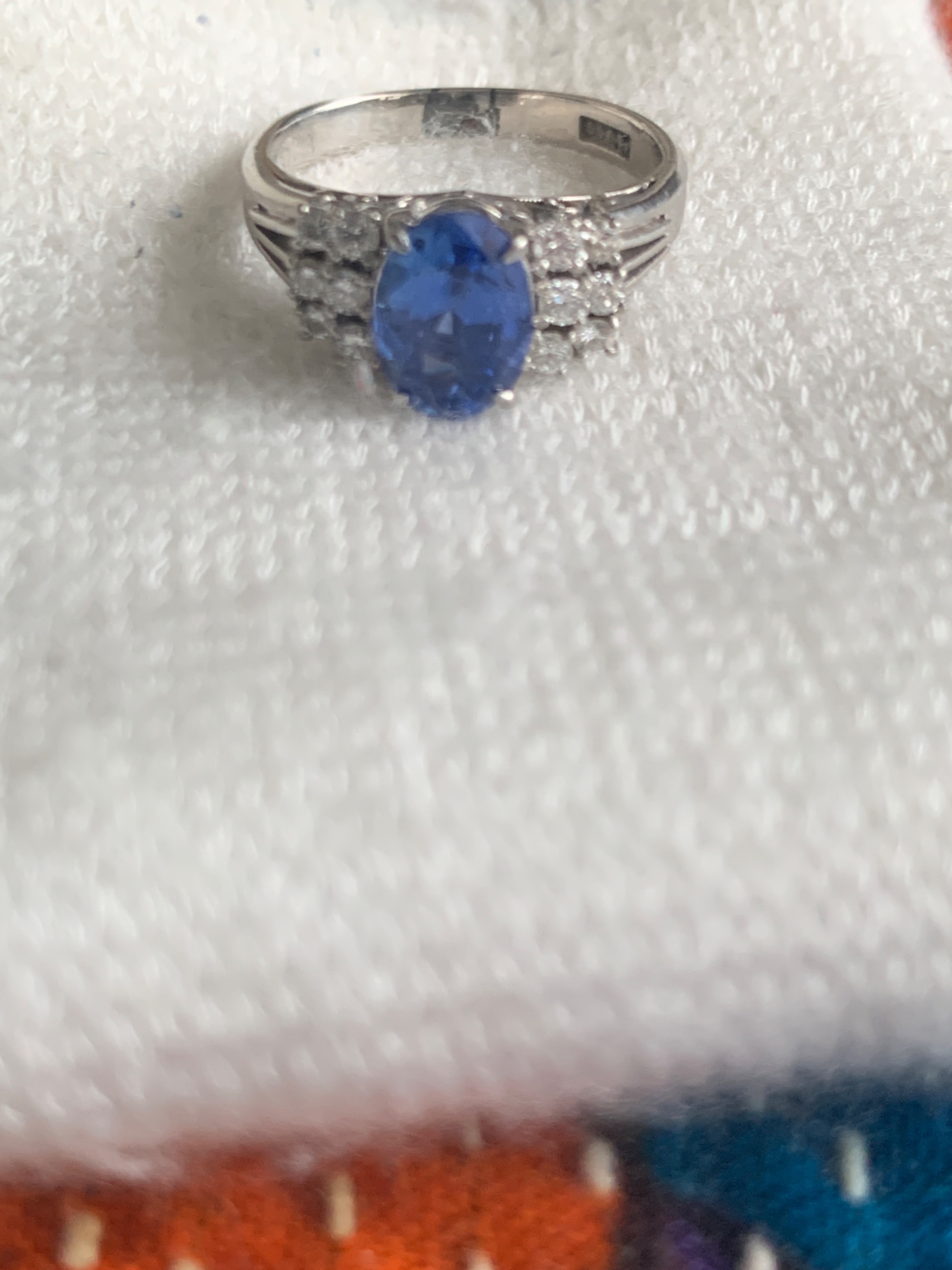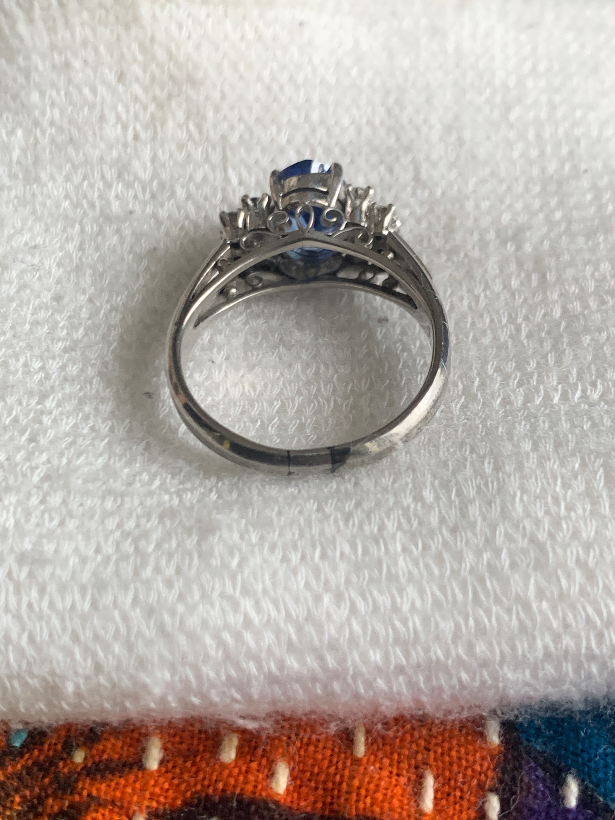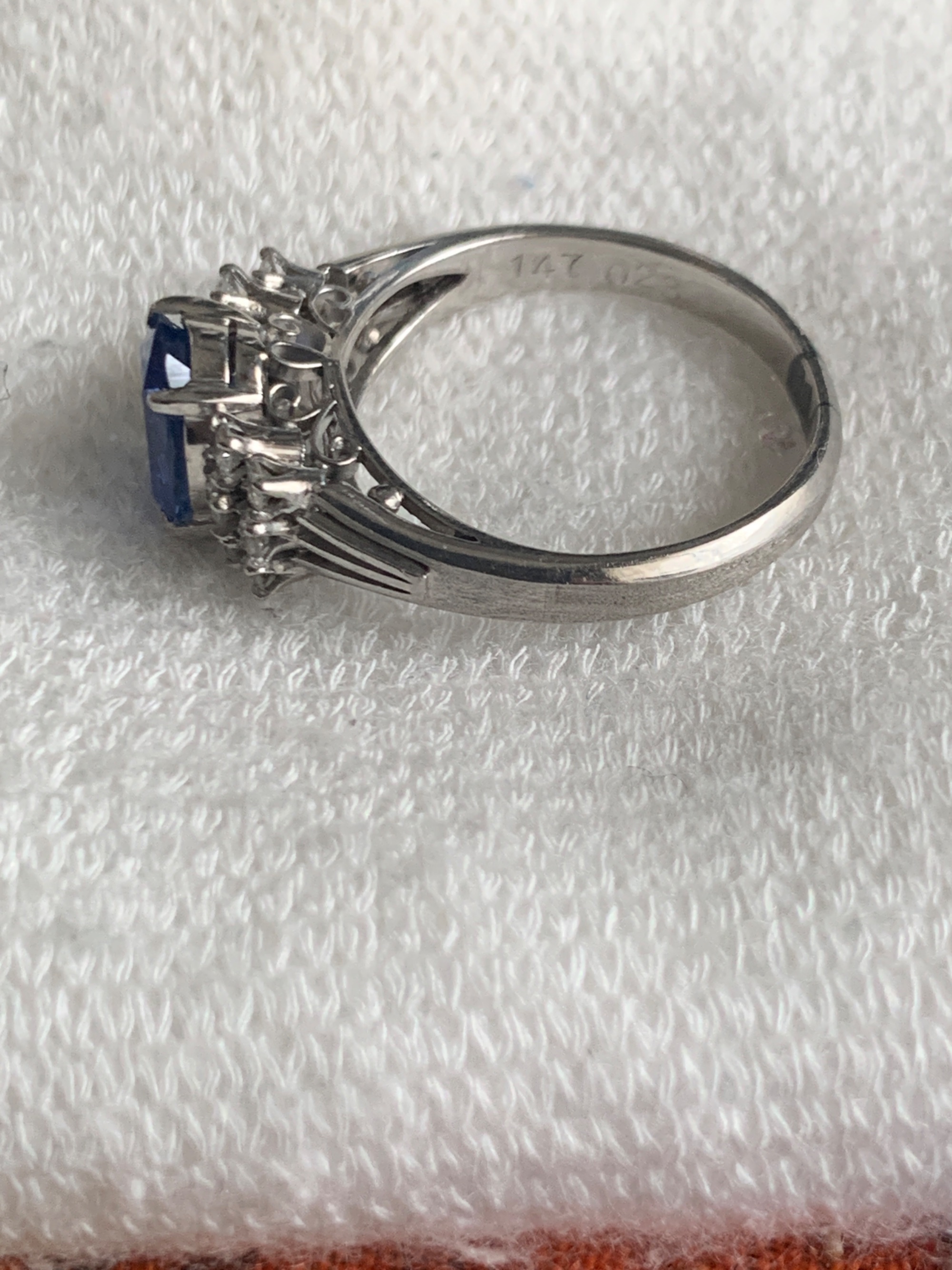 祖母より譲り受けました。サイズ調整をしたと聞いています。小さなダイヤが周りにと、ブルーはサファイ、リングはプラチナと聞いています