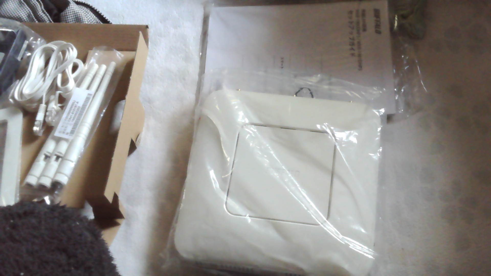 ACアダプター、スタンド、LANケーブル、セットアップカード(パスワード記載の紙やカード)、外箱。
