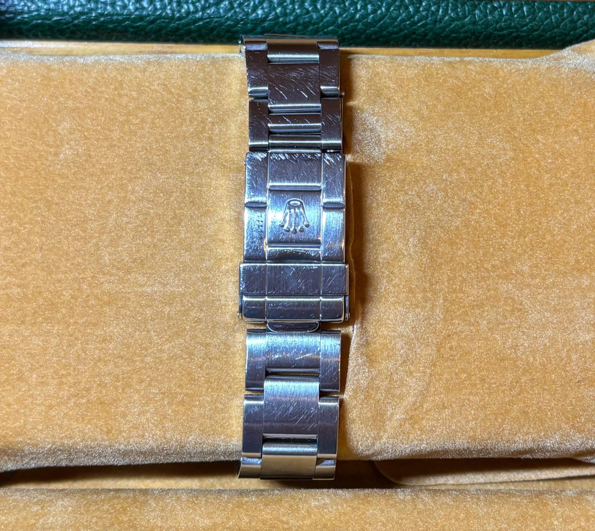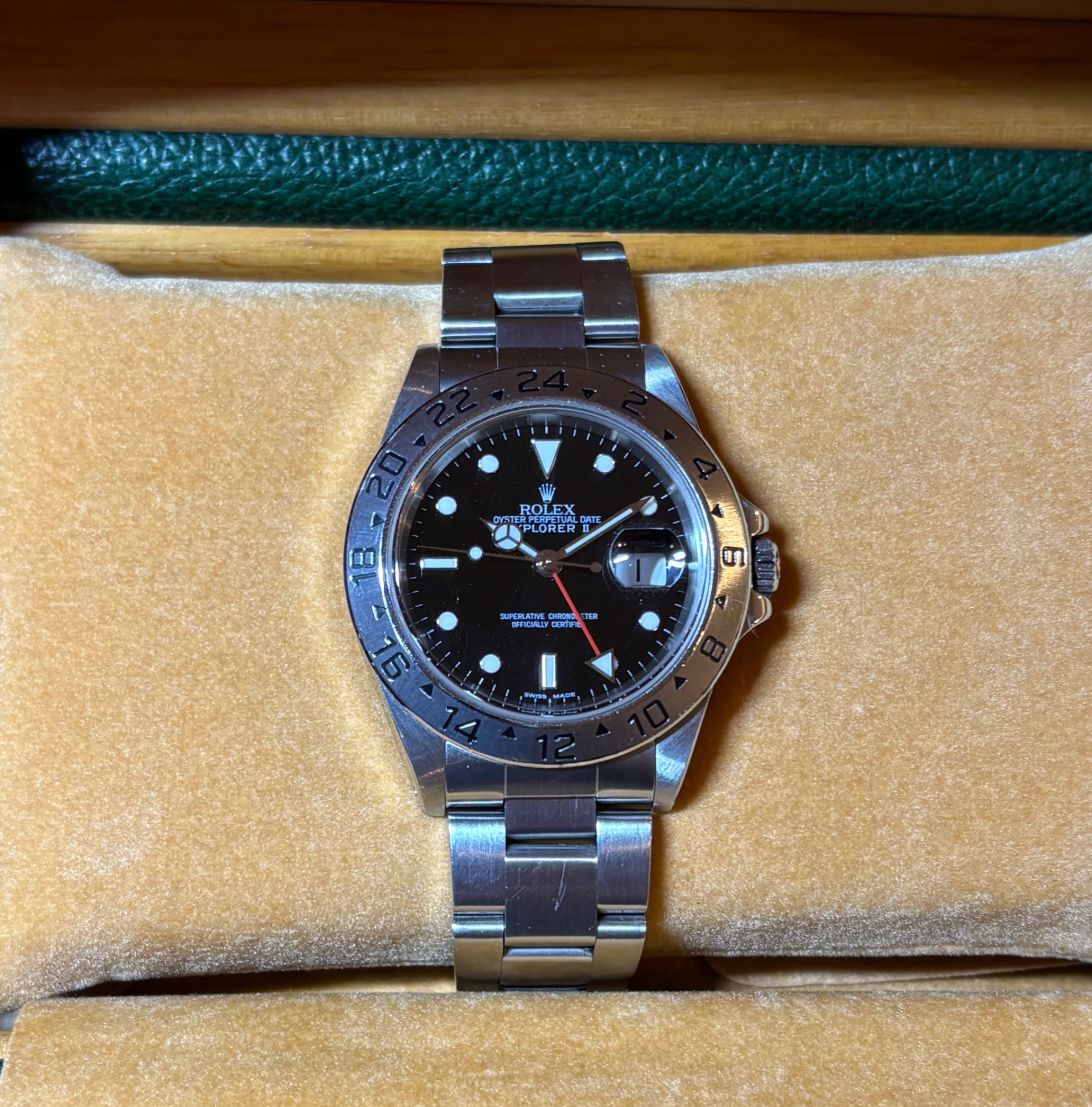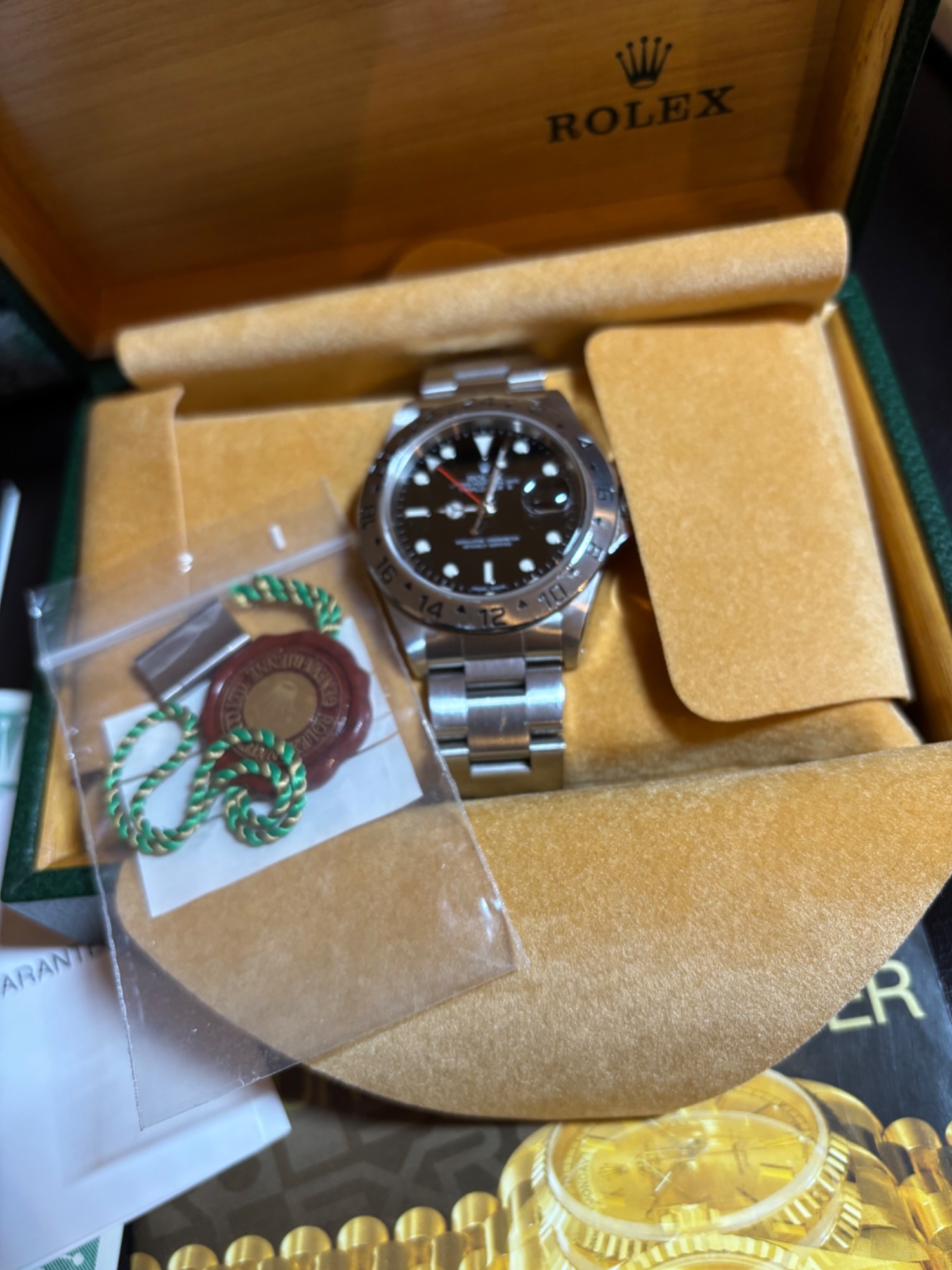 内箱、外箱、販売当時の保証書、説明書、ブレスレット余りコマ、クロノメータータグ、日本ロレックスでのオーバーホール証明書など、フルセットで揃っています。