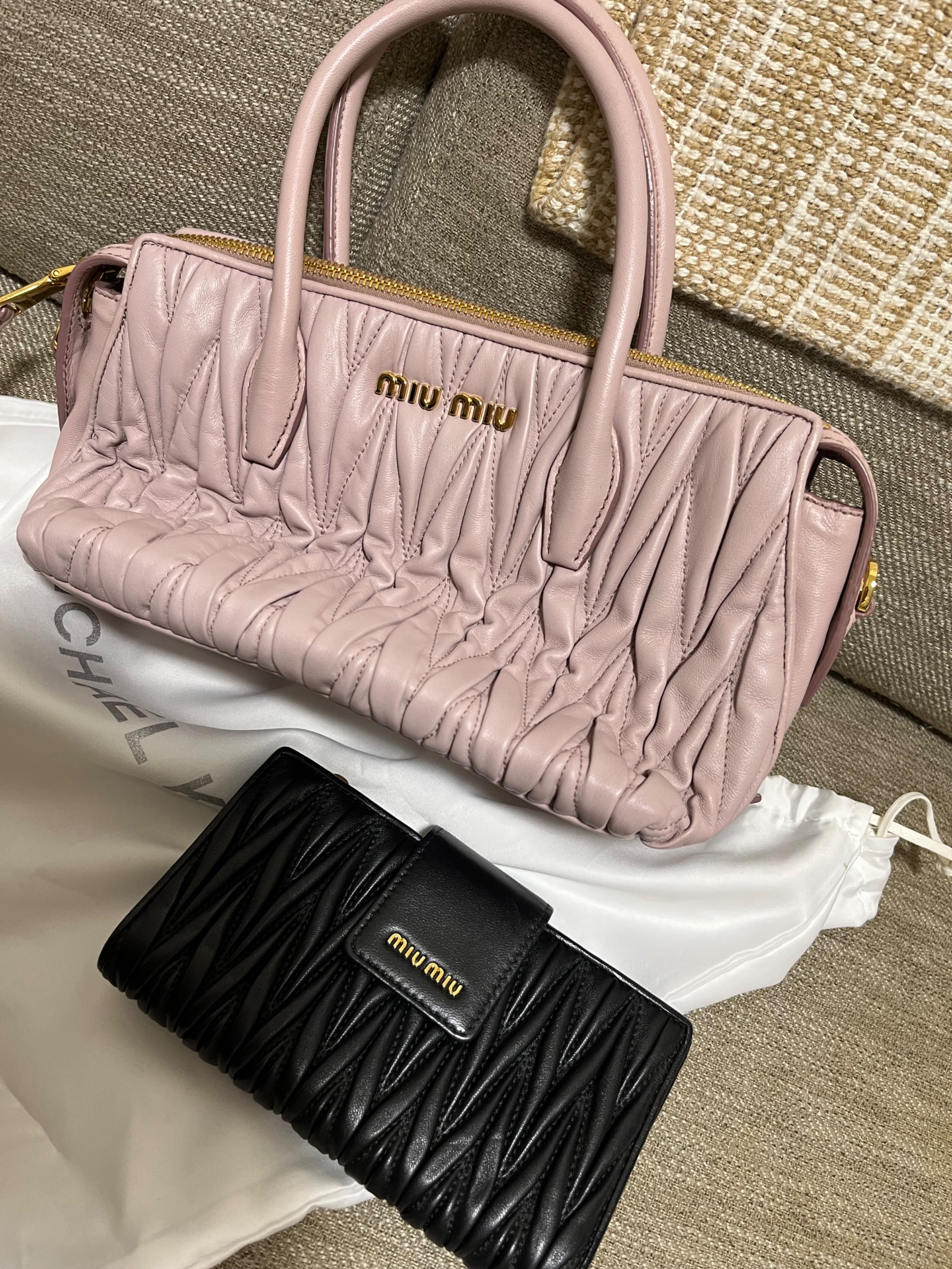 miumiu (まずピンクの鞄の方をお願いします)、購入時期2018年、説明書なし、ほぼほぼ未使用なため美品(2.3回使ったかくら