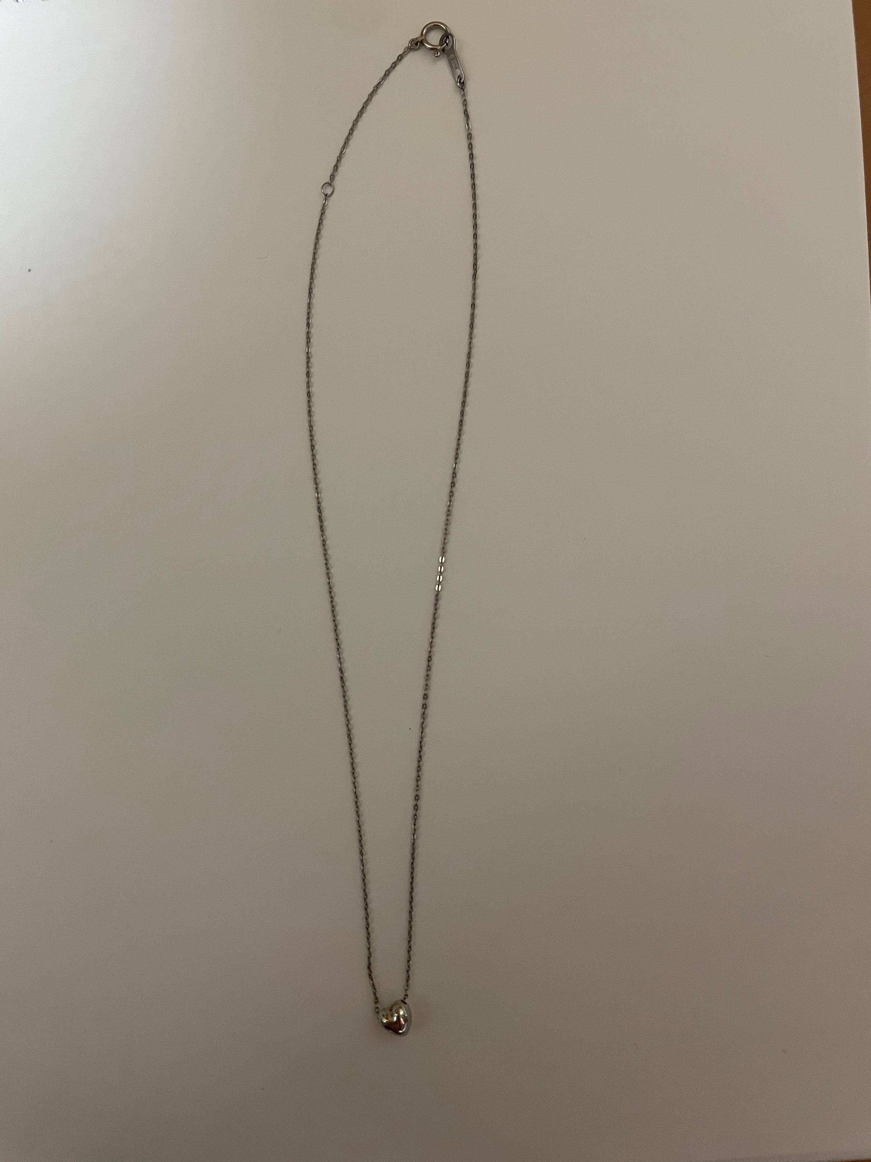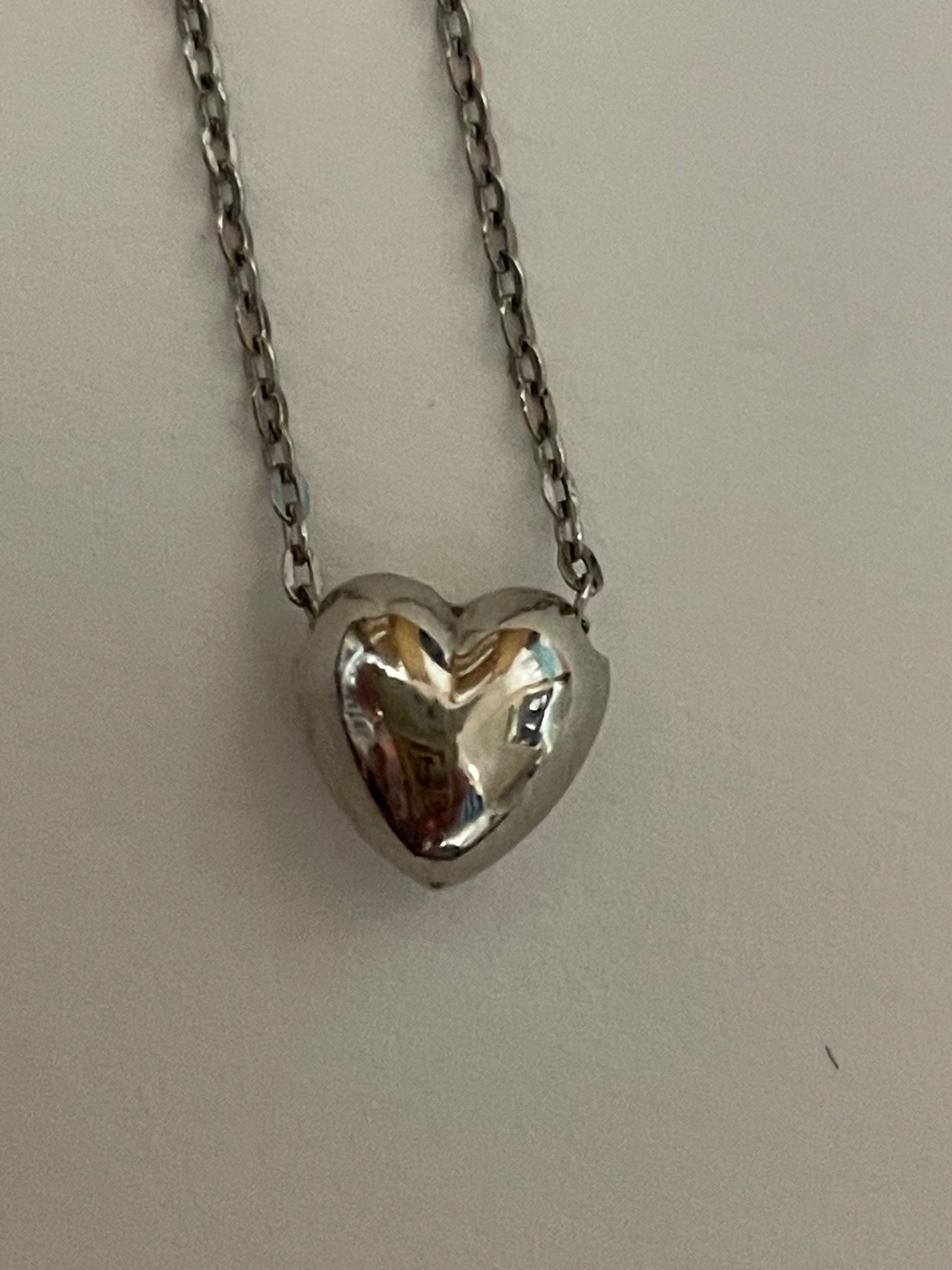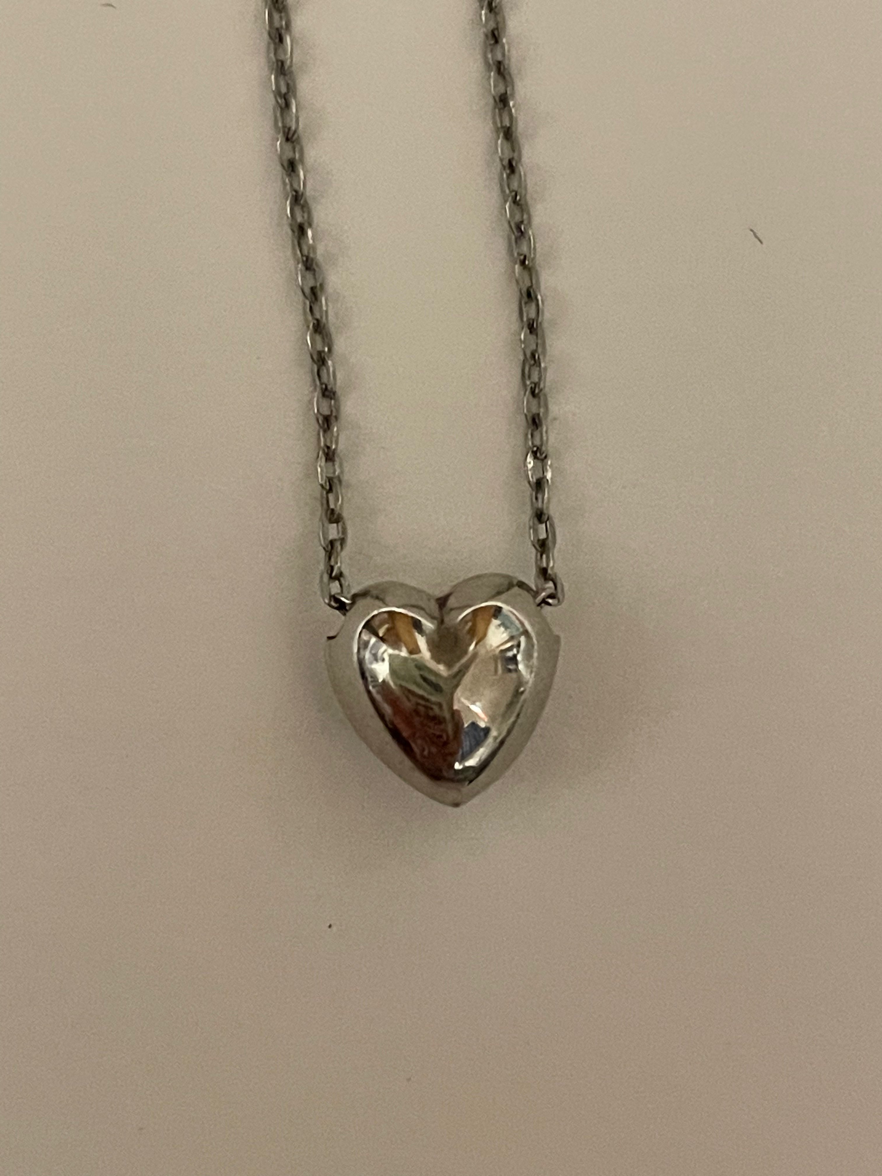 かなり古い頂きものなので、保証書や箱は処分してしまっていて、購入時期や商品名が不明です。チェーンのタグ?の部分(4枚目)に見えにくく、綺麗に映っていませんが小さくpt850と記載してありました。ハートの片面に小さく窪みのような傷があります。