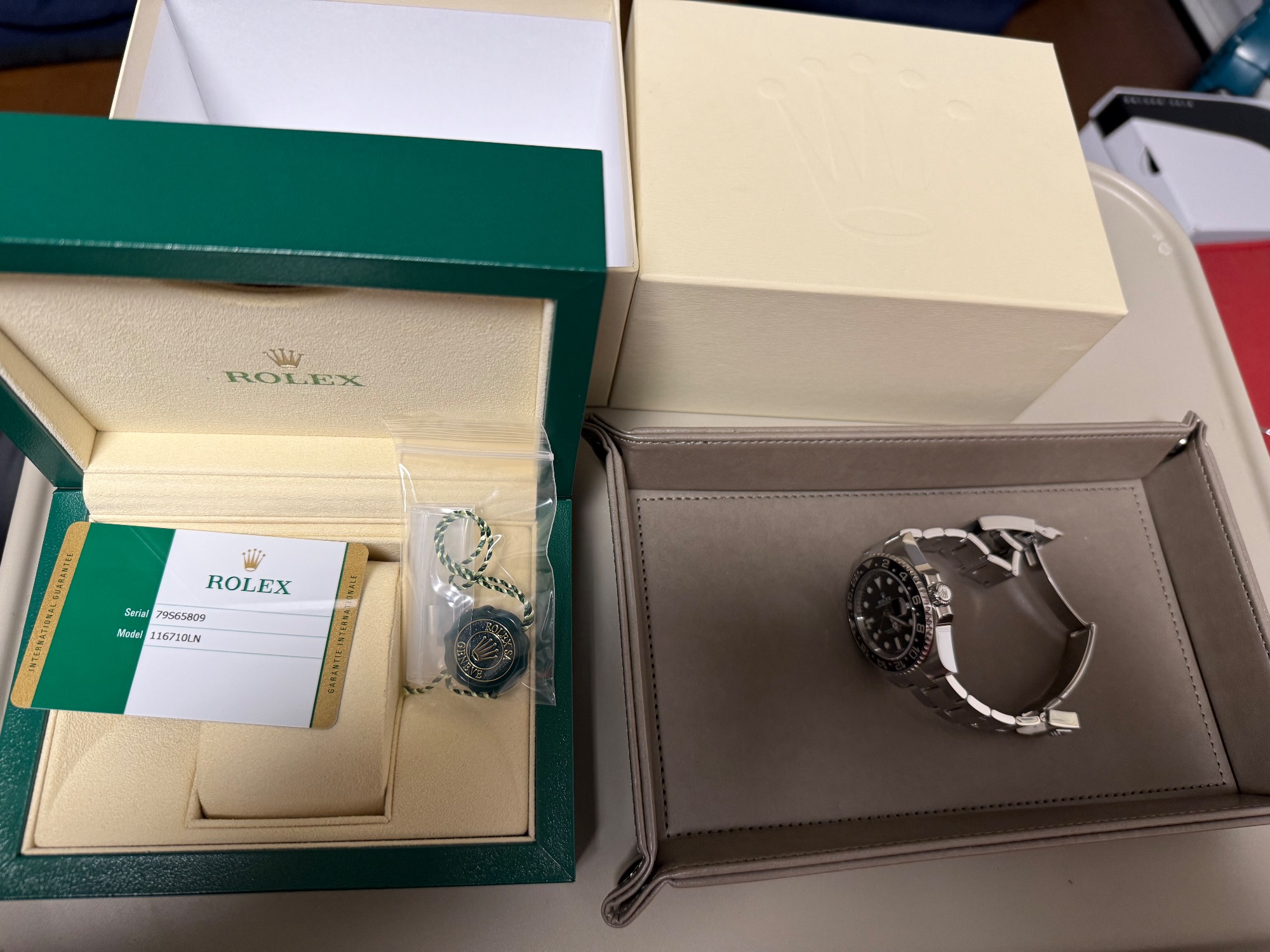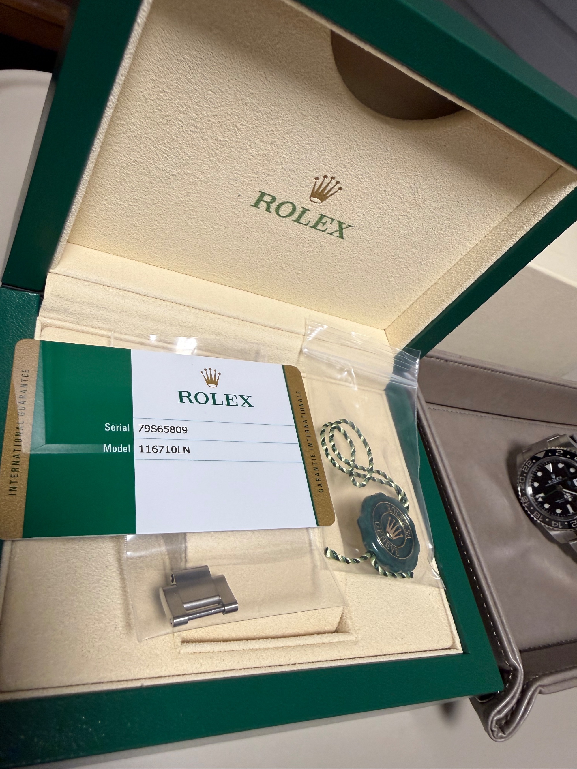 外箱、内箱、ギャランティカード、余りコマ、揃っています。2018年10月広島県のロレックス正規店購入ギャランティカードです。