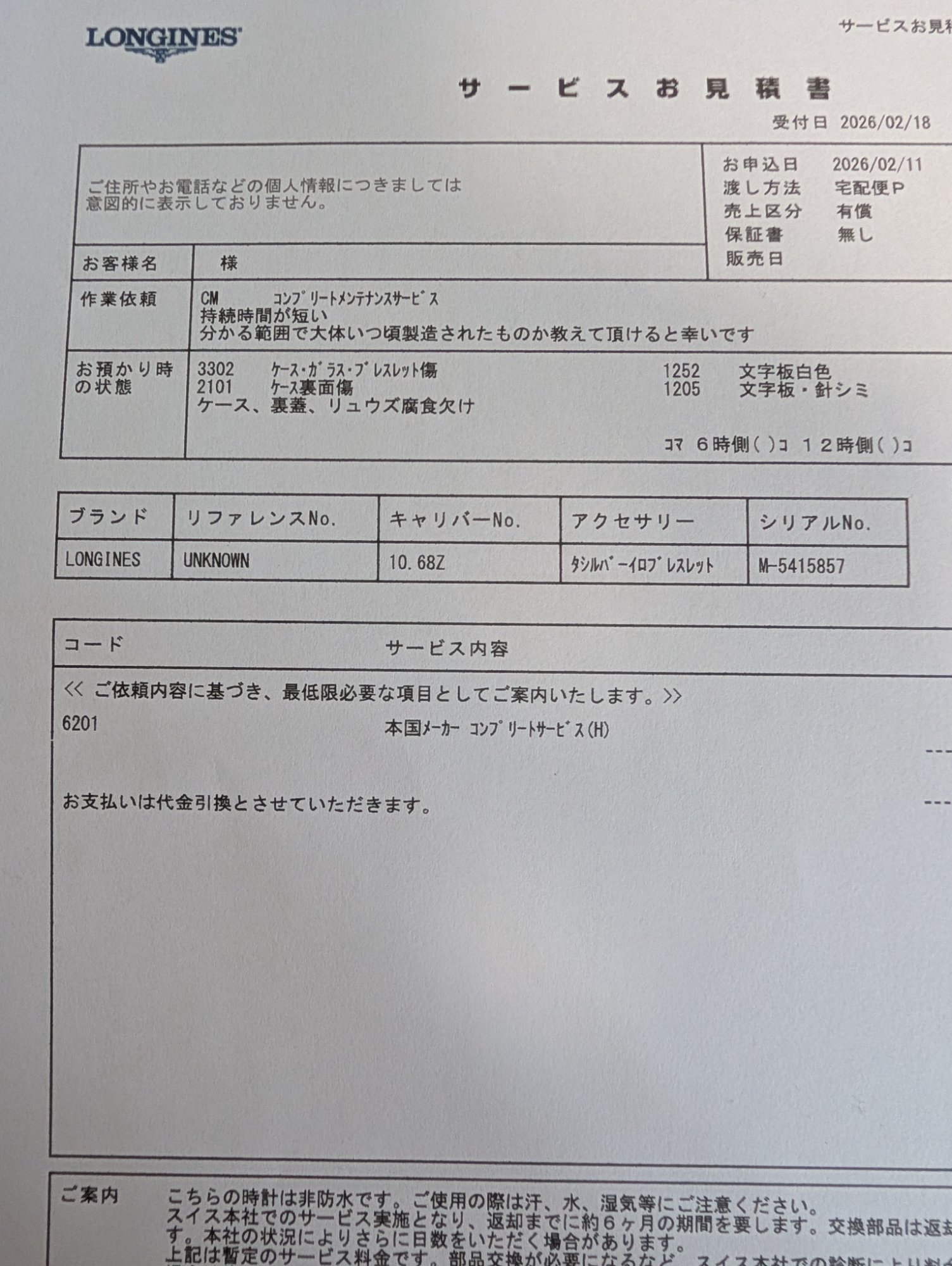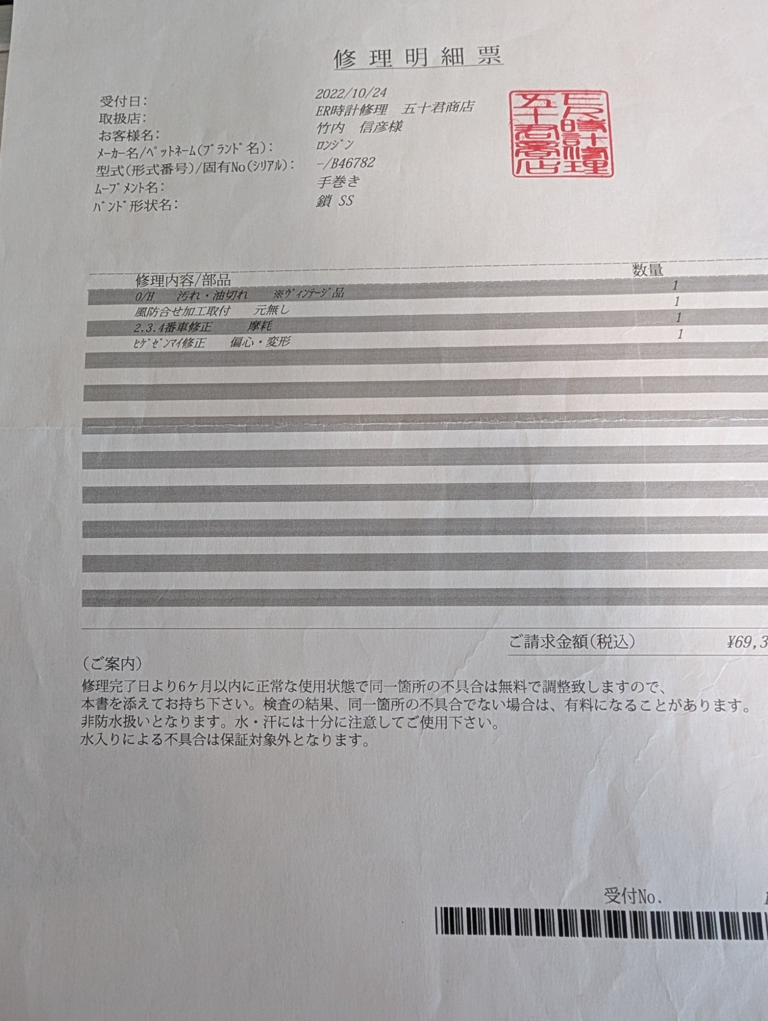 シリアルNO.M-5415857。五十君商店にてメンテナンスを実施したので竜頭を巻けば動きます。