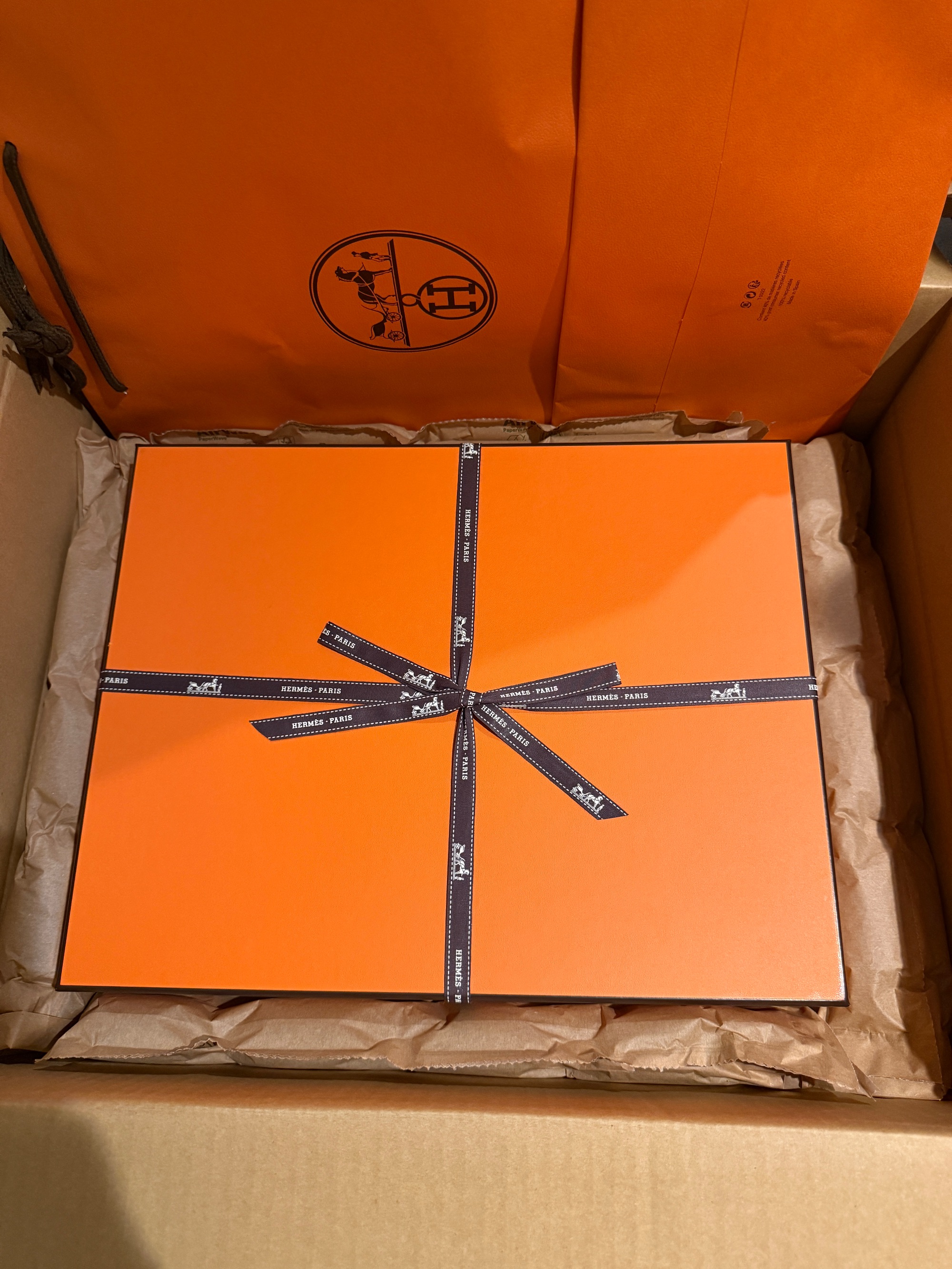 2025年8月、エルメスオンラインにて注文・購入した正規品です。到着時の段ボール箱のまま保管しており、オレンジの箱にリボンをかけた未開封状態です。ショッパーバッグも同梱されておりますので、プレゼント用にも最適です。未開封のため、オ...