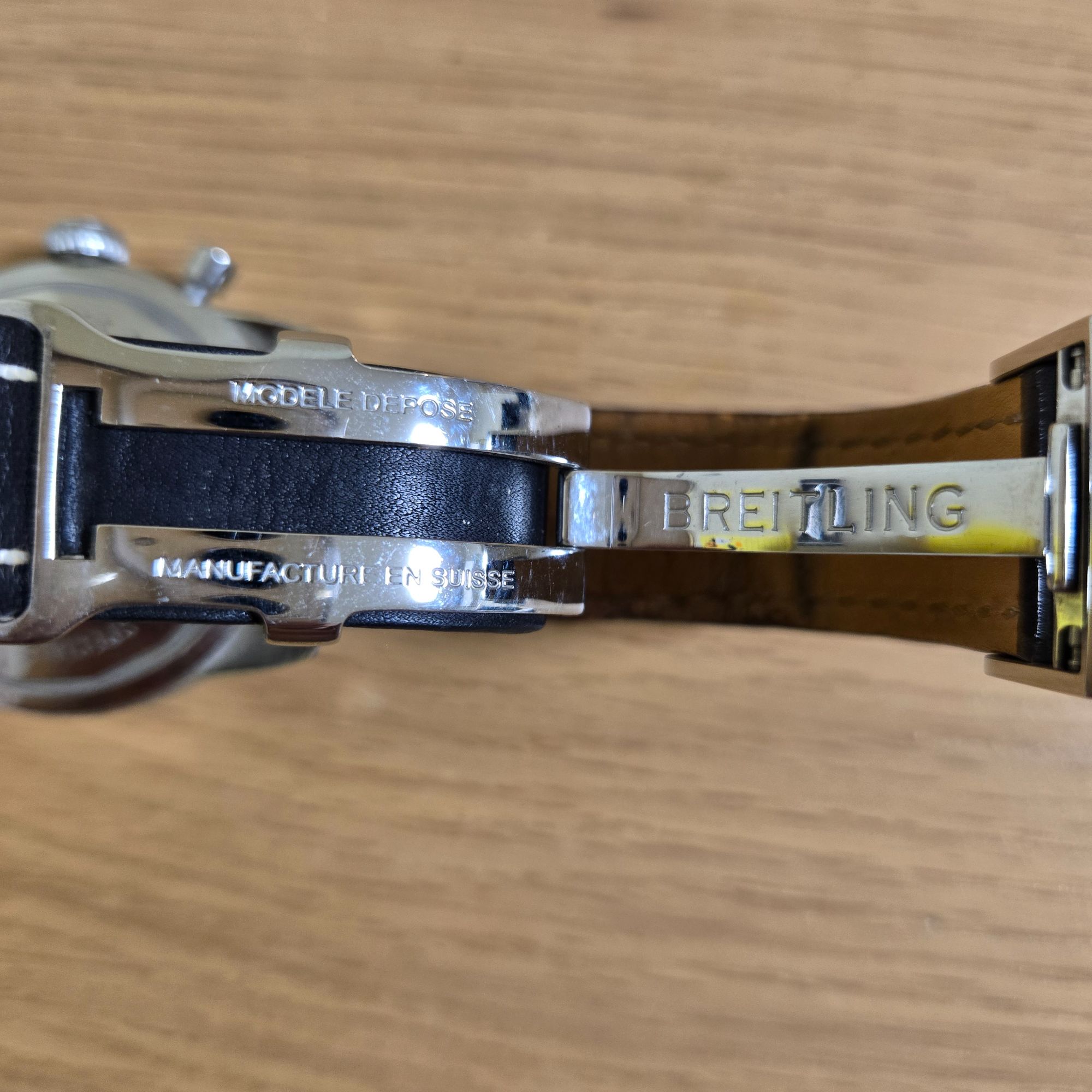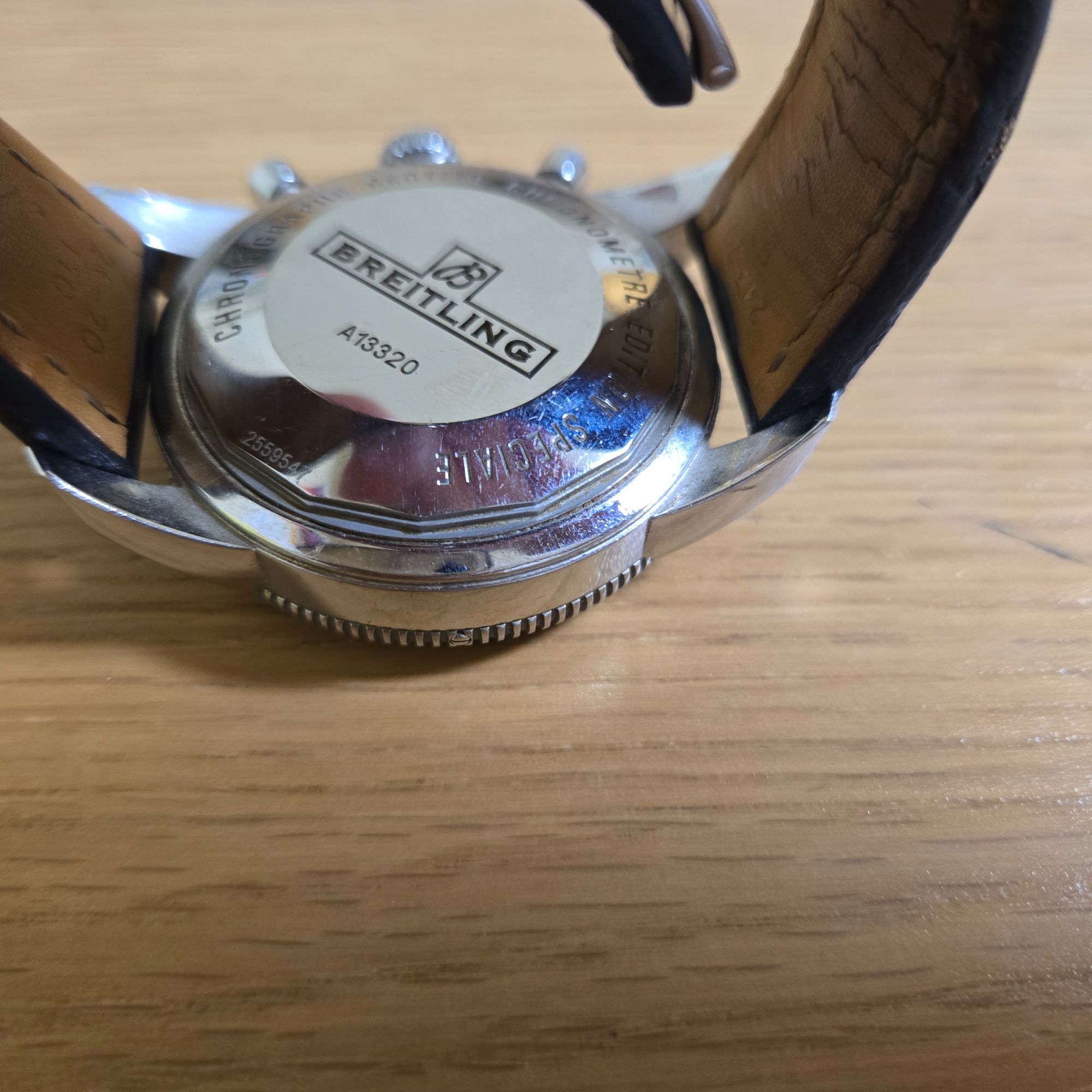 15年以上前に銀座のブライトリング店舗で購入。当時60万円程でした。ストップウォッチ?が動かないです。バンドが皮ですが萎えてます。