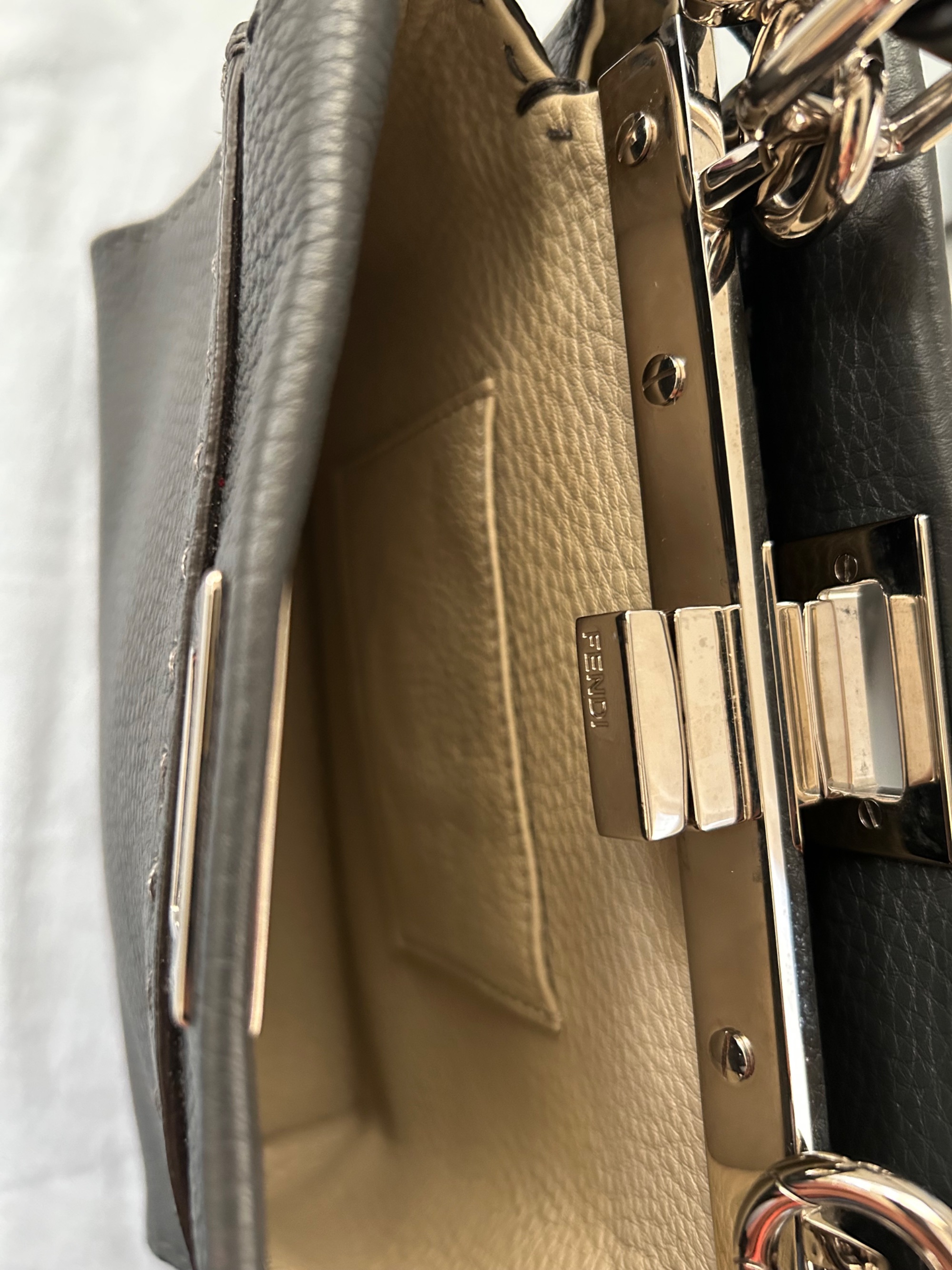 大きな傷や汚れなく、美品。型崩れなし、角や金具も微細な線傷程度。内側も清潔です(写真参照)。
