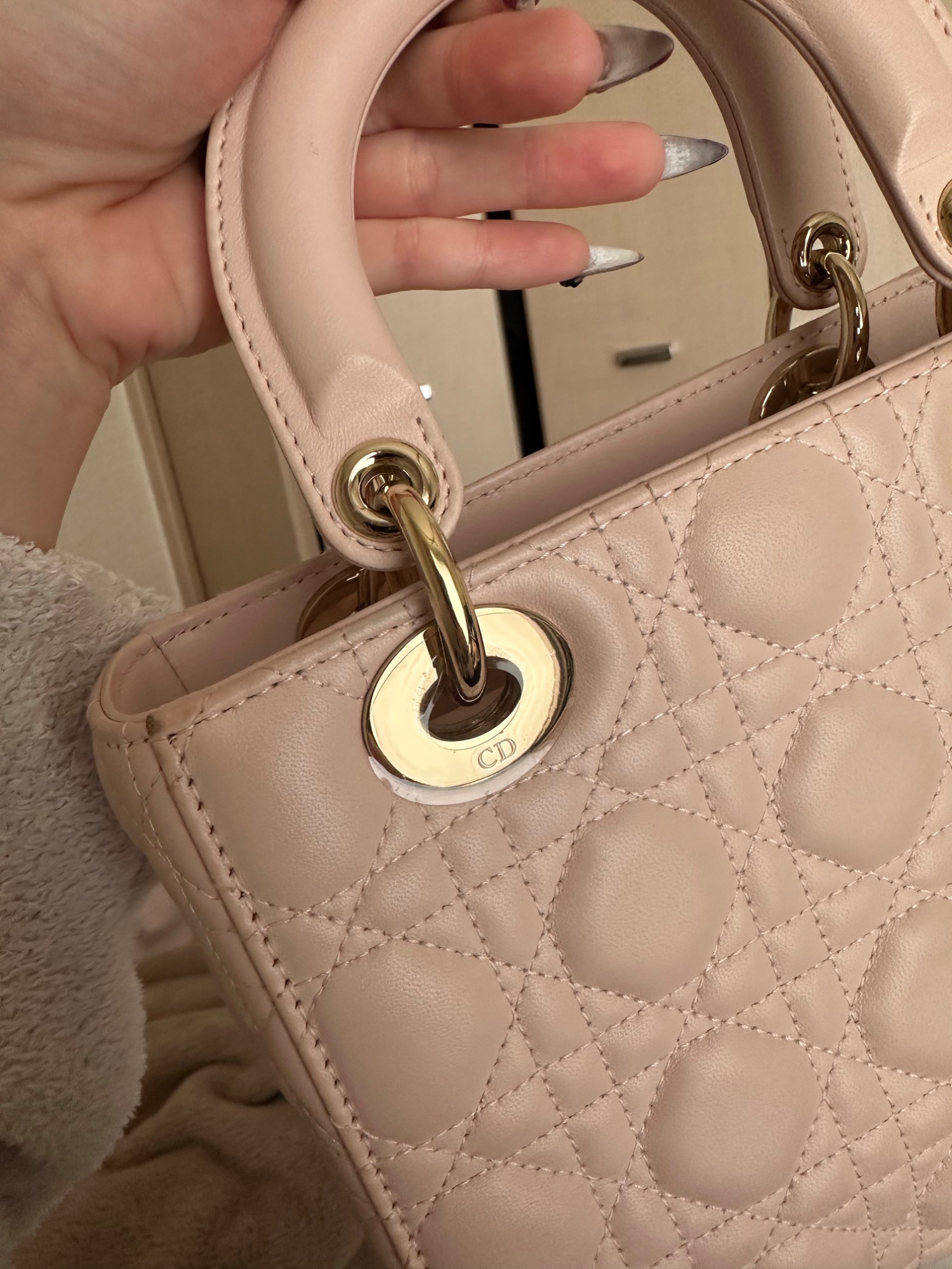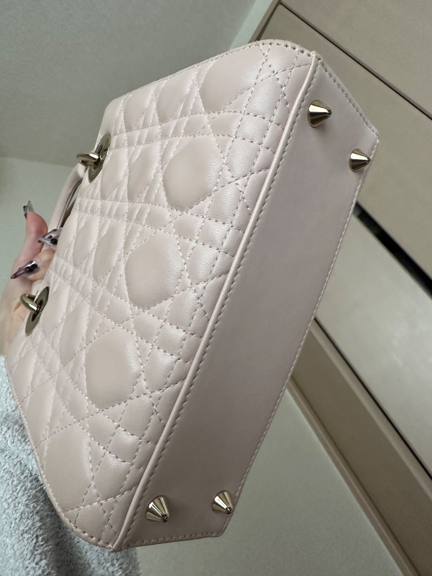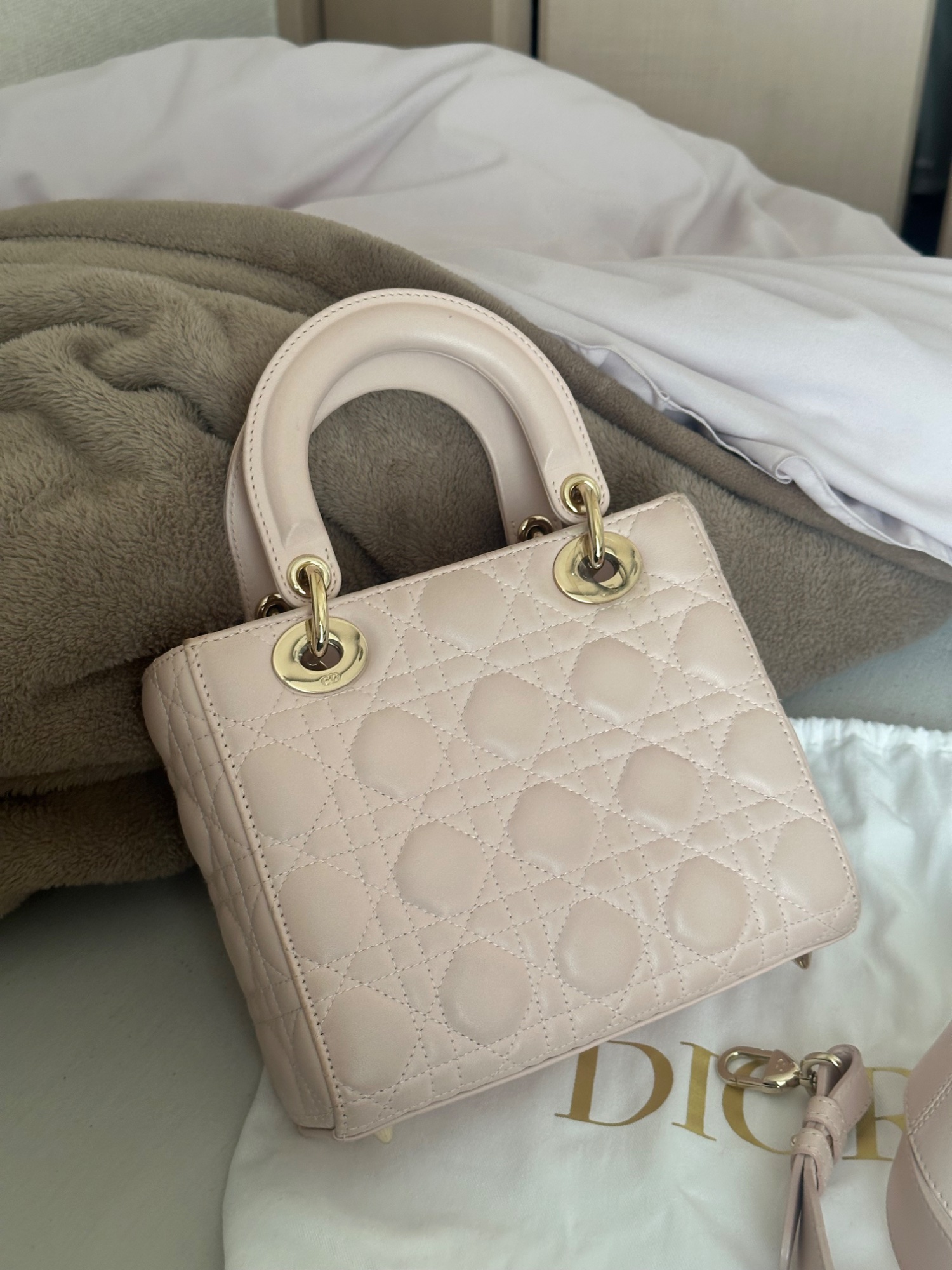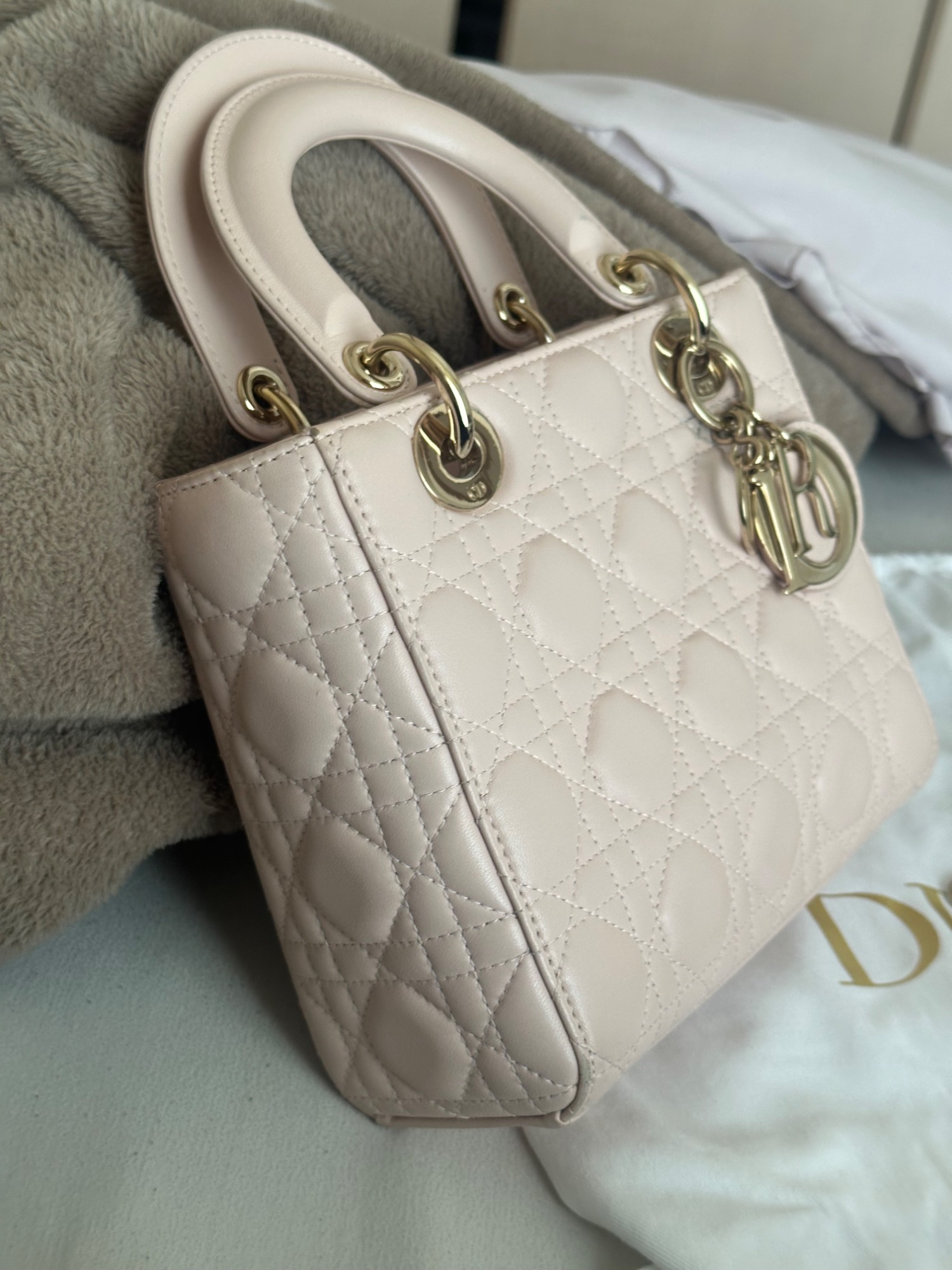 レディディオール、箱・保存袋・説明書・ショッパー有り、2021年12月頃購入、数回使用(片手で数えられる程度)、金具の部分は保護シールを剥がさずに使用していたため中古品としてはかなり綺麗な方だと思います。