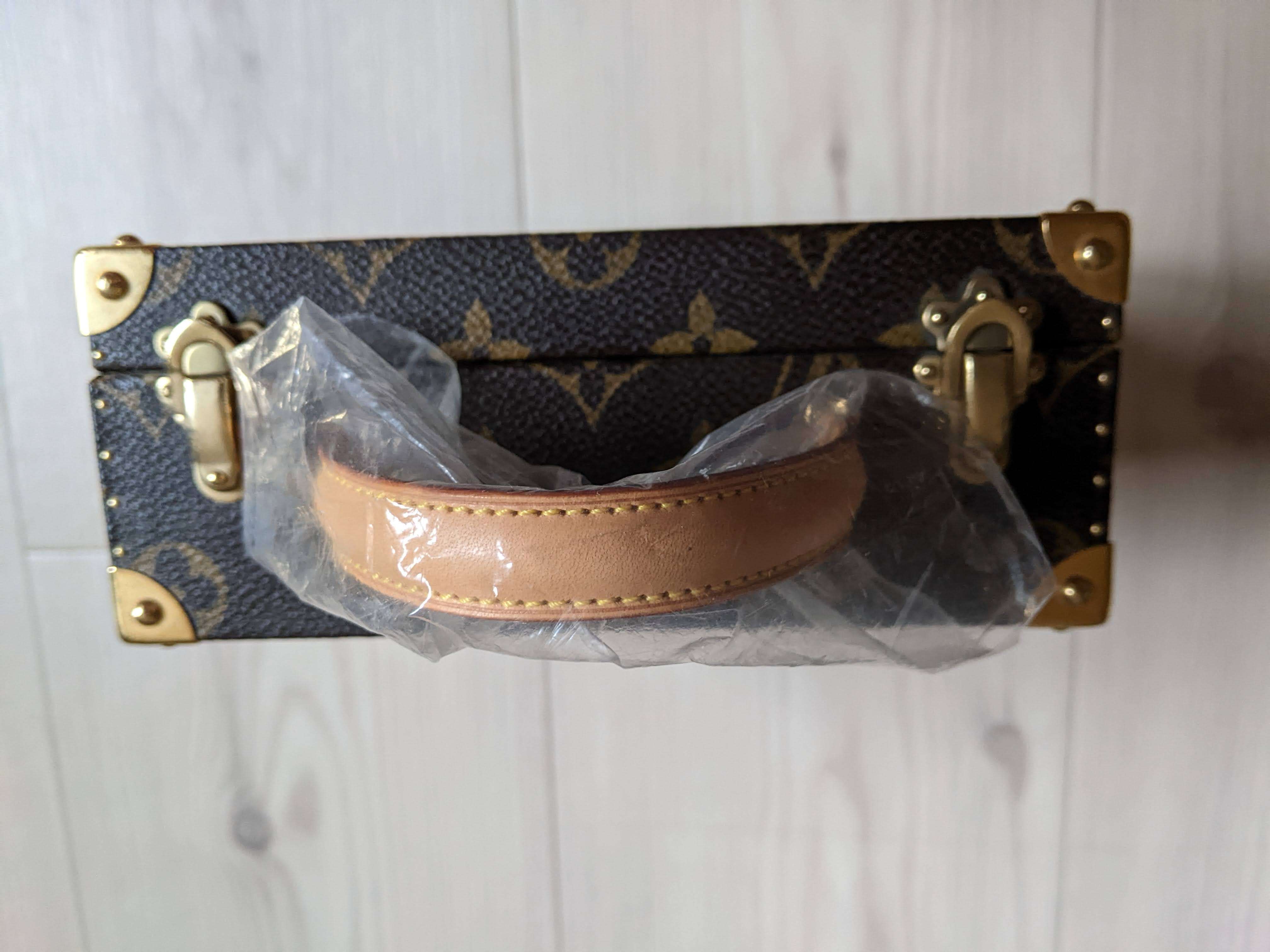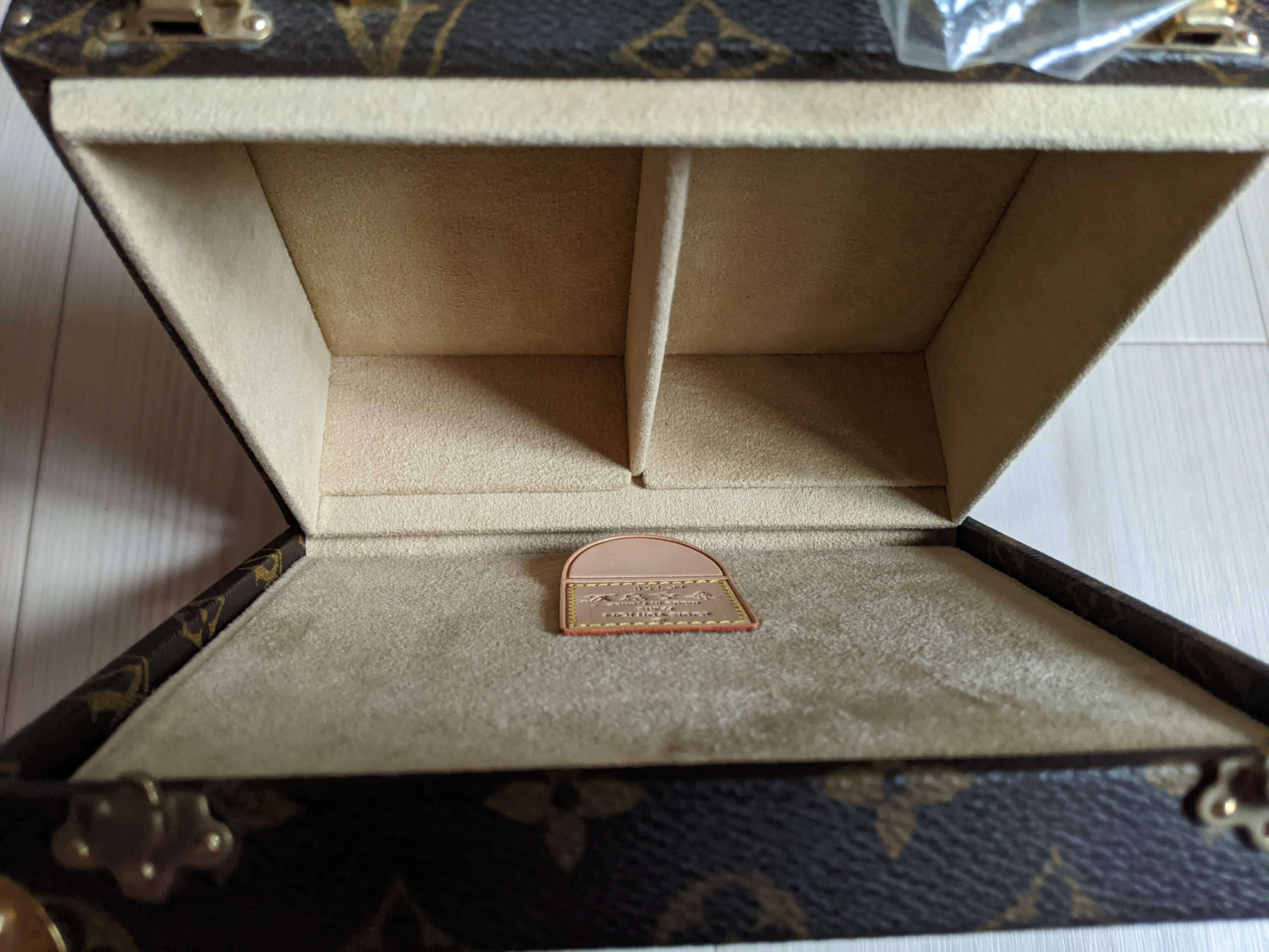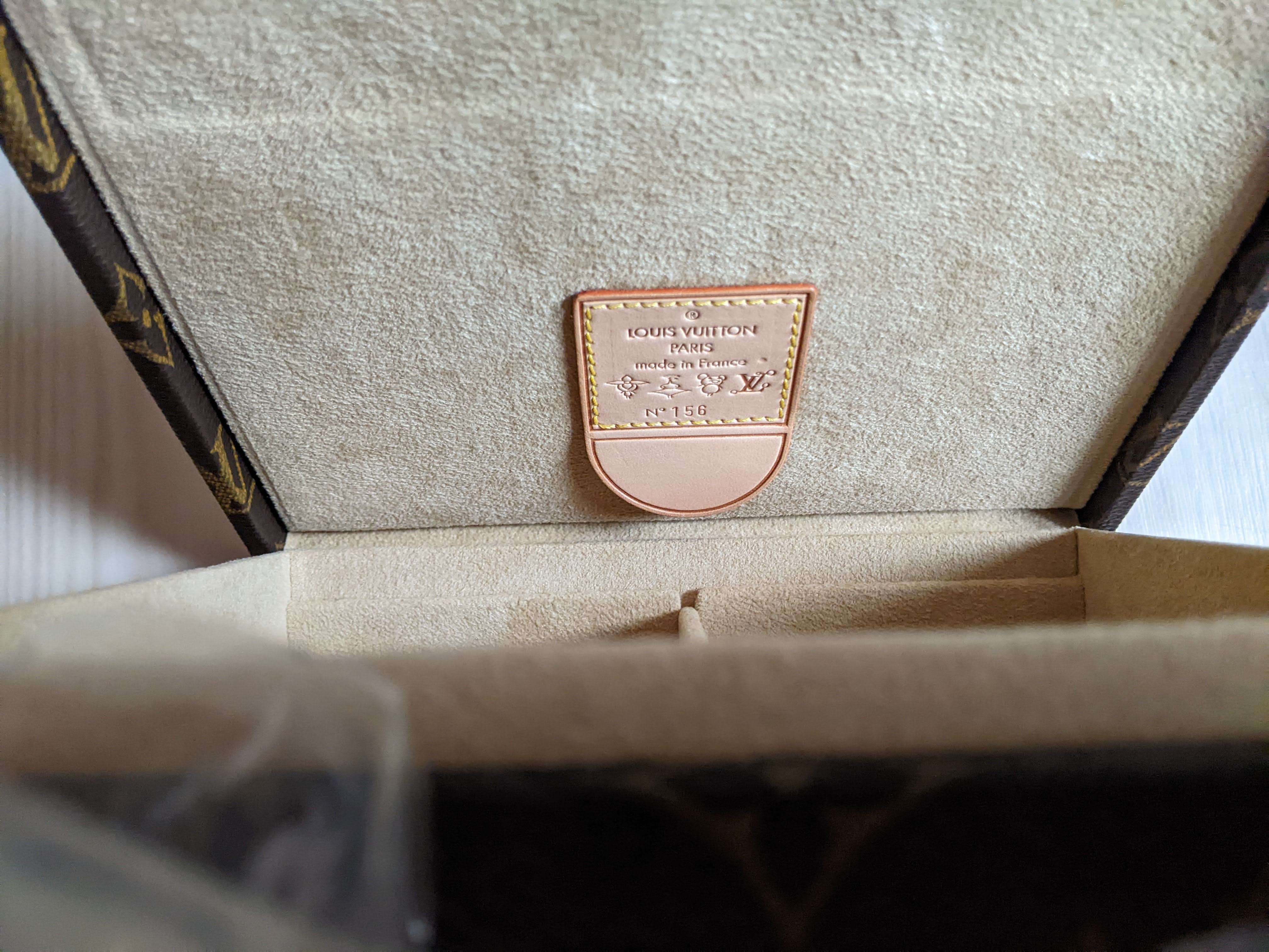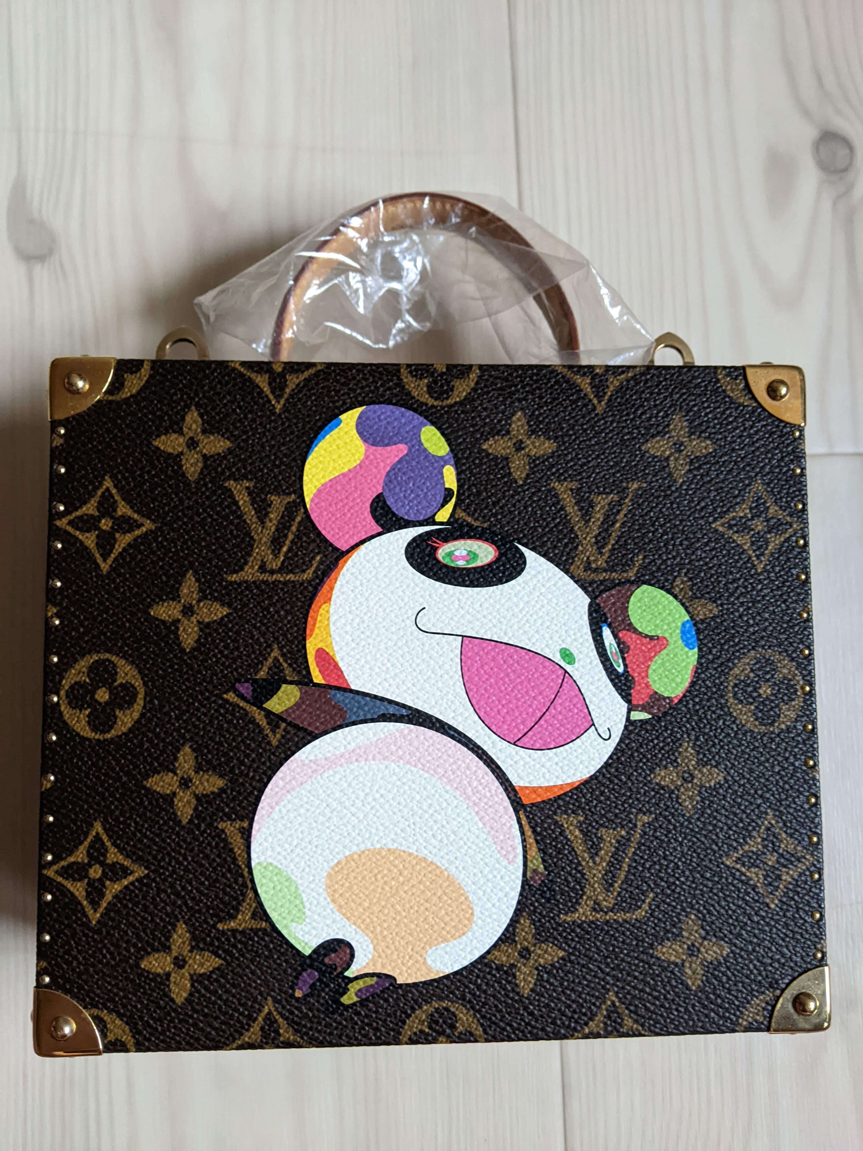 世界限定200個の村上隆のモノグラムパンダのジュエリーケースバッグになります。取っ手部分は最初からビニールが掛かった状態で未使用です。金具部分に年数なりのクスミはあります。購入時期は、こちらが販売されていた頃の時期になります。付属品は布の保存袋です。