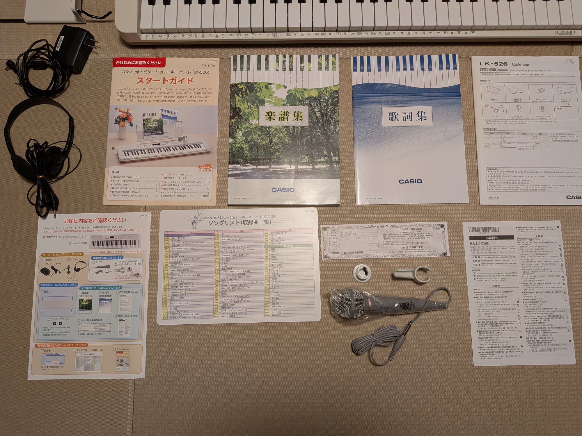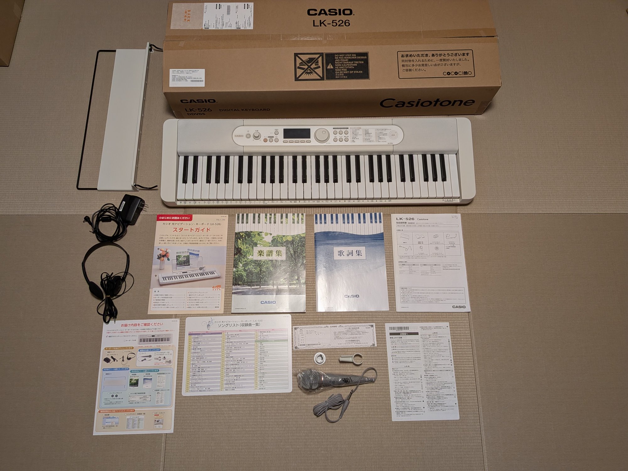 2023年1月購入。キズなし。付属品(購入時の品目全てあり)=電源コード、ヘッドホン、マイク、マイクホルダー、譜面立て、スタートガイド、楽譜集、歌詞集、取扱説明書、ソングリスト、楽器保証書、安全上のご注意。箱・緩衝材
