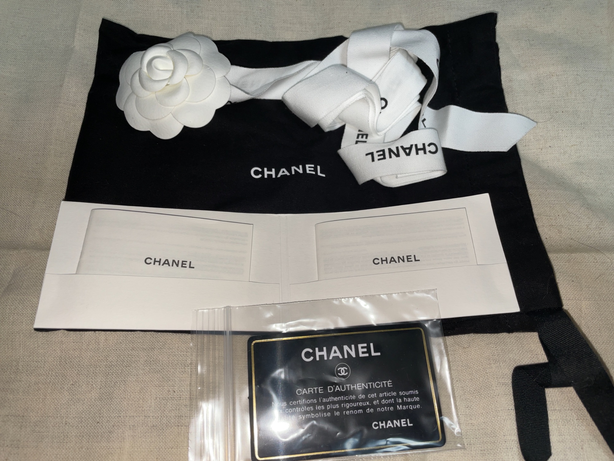 付属品はギャランティカード、外箱、カメリア付きリボン。