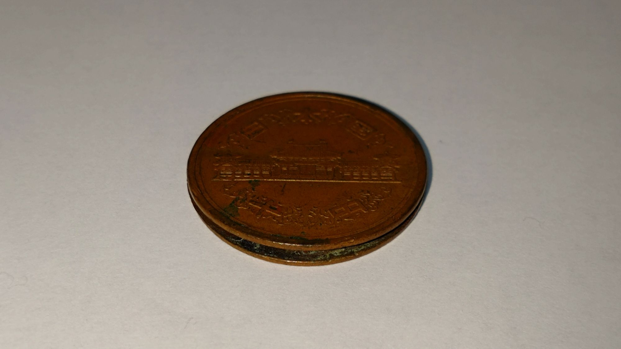 昭和38年10円硬貨、ヘゲエラー、部分剥離、裏面および剥離内部に錆びや汚れがある。