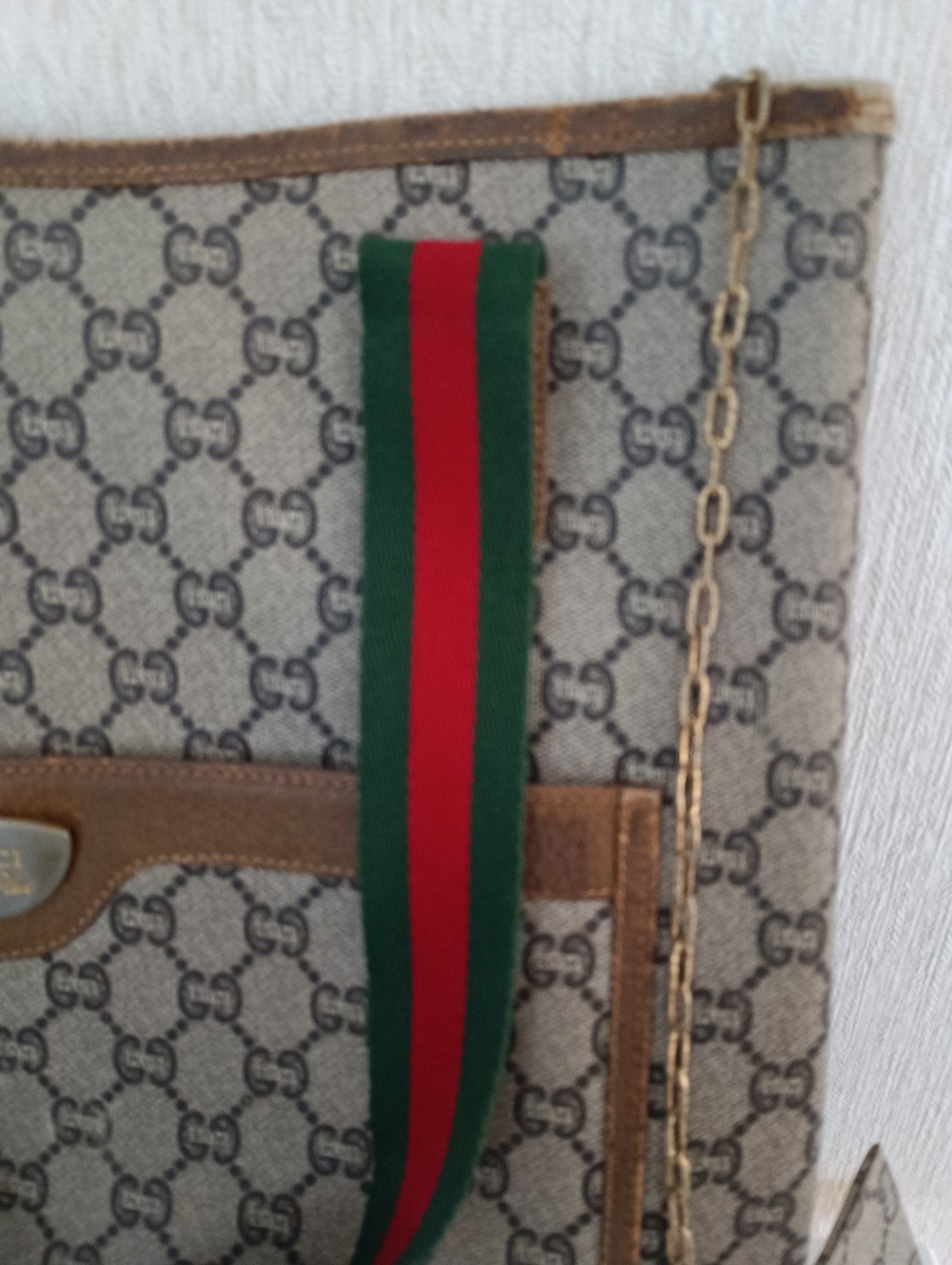 写真5枚目の小さいポーチとバッグを繋ぐチェーンの一部に錆があります。また、バッグの口の縁どりの部分に擦れがあります。