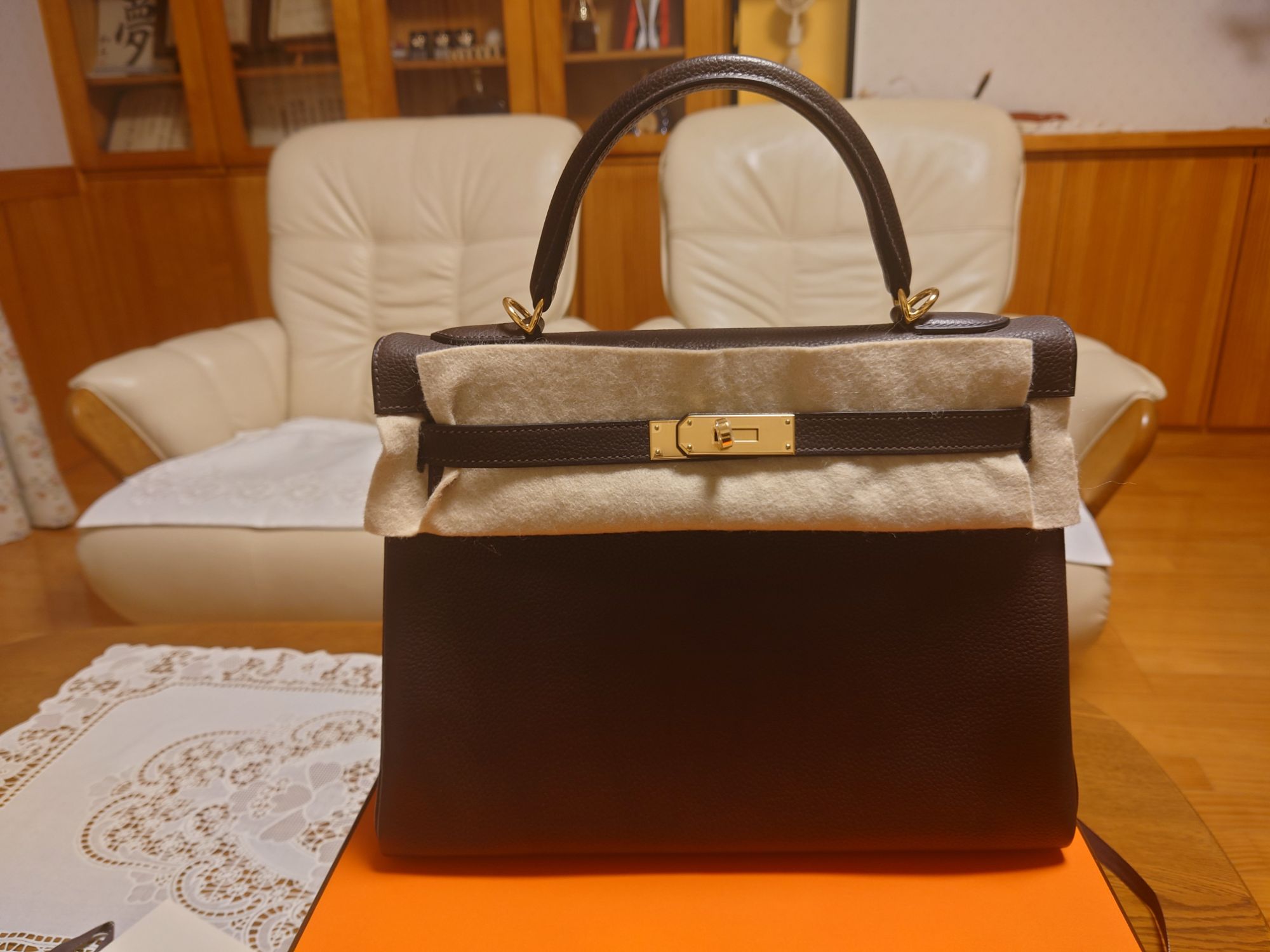 ケリー 32センチ ゴールド金具 素材バレニア 色エヴァンヌ 刻印U 新品未使用