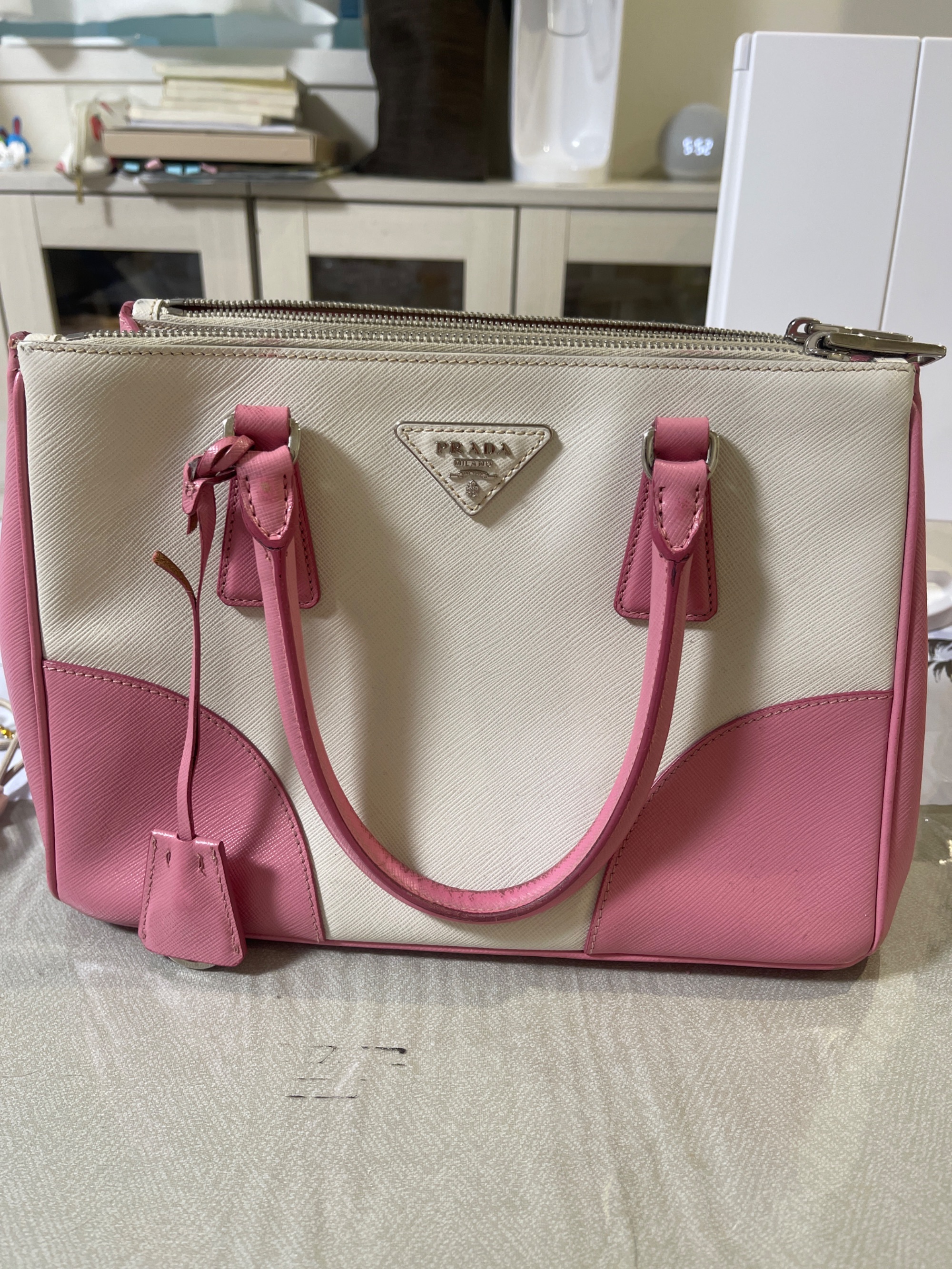 プラダのサフィアーノレザーピンク✖︎ホワイトです。銀座で8年前に20万弱で購入しました。