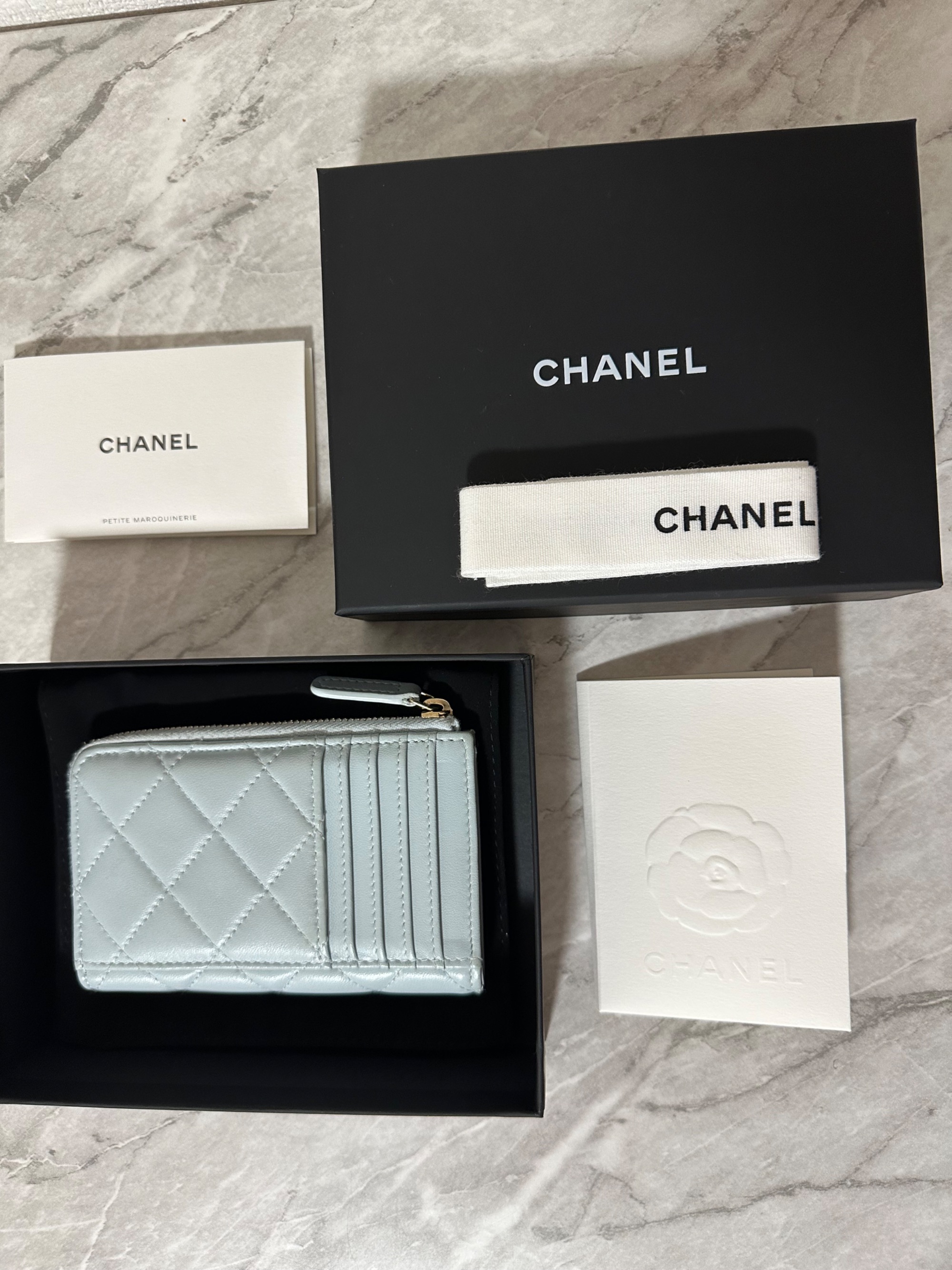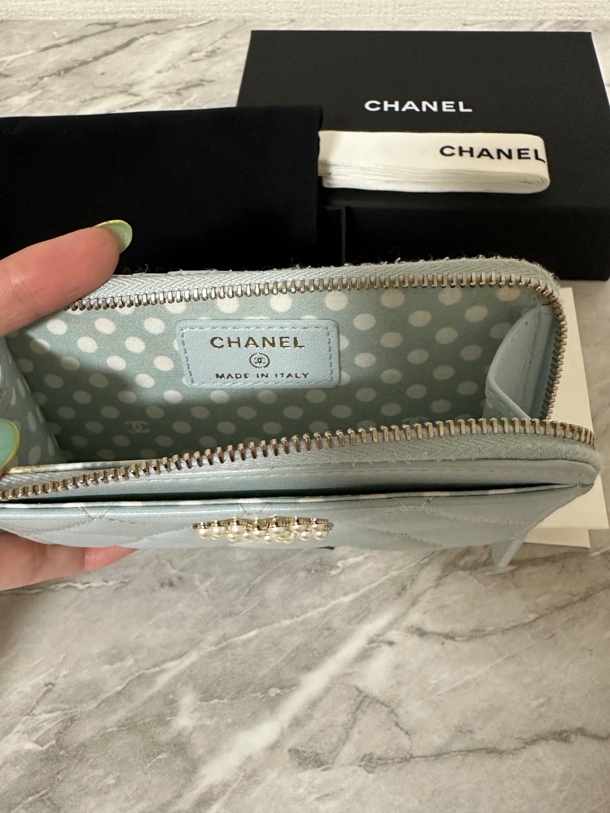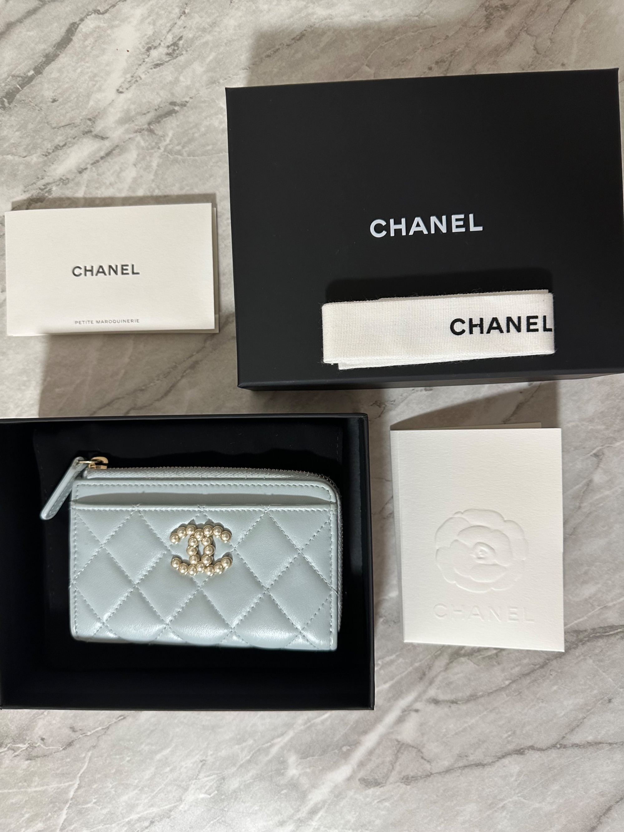 ■シャネル マトラッセ レザーフラグメントケース カードケース ココマーク フェイクパール ブルー系