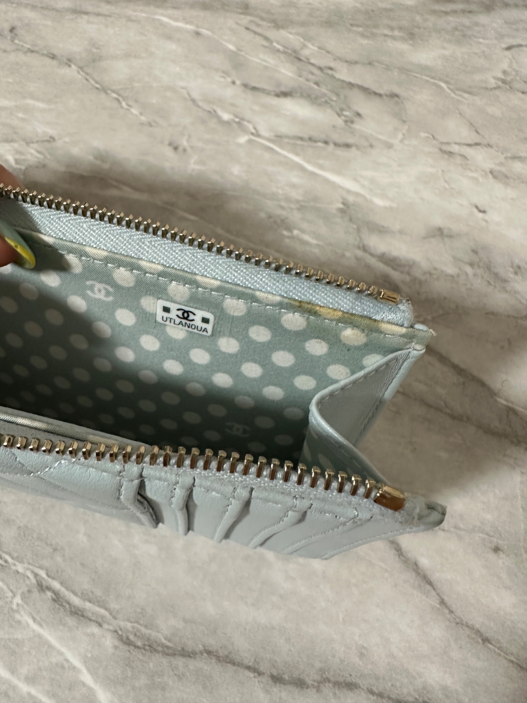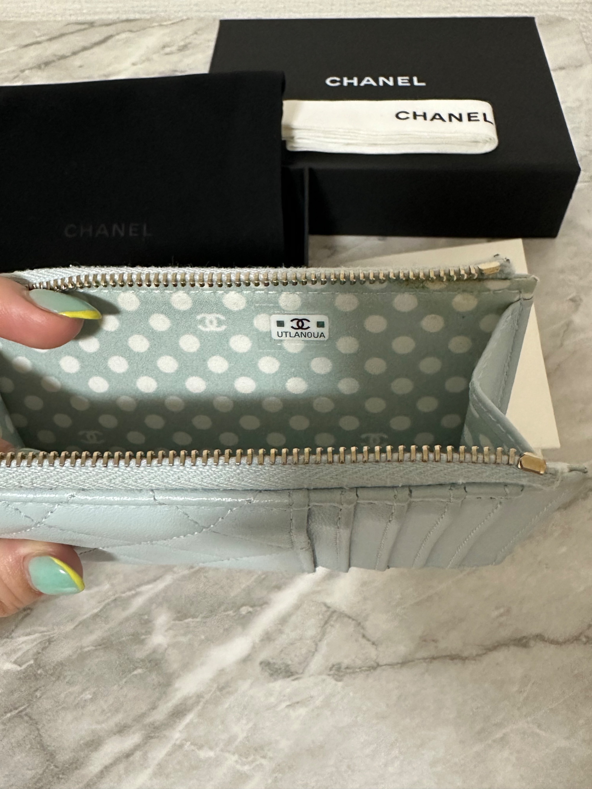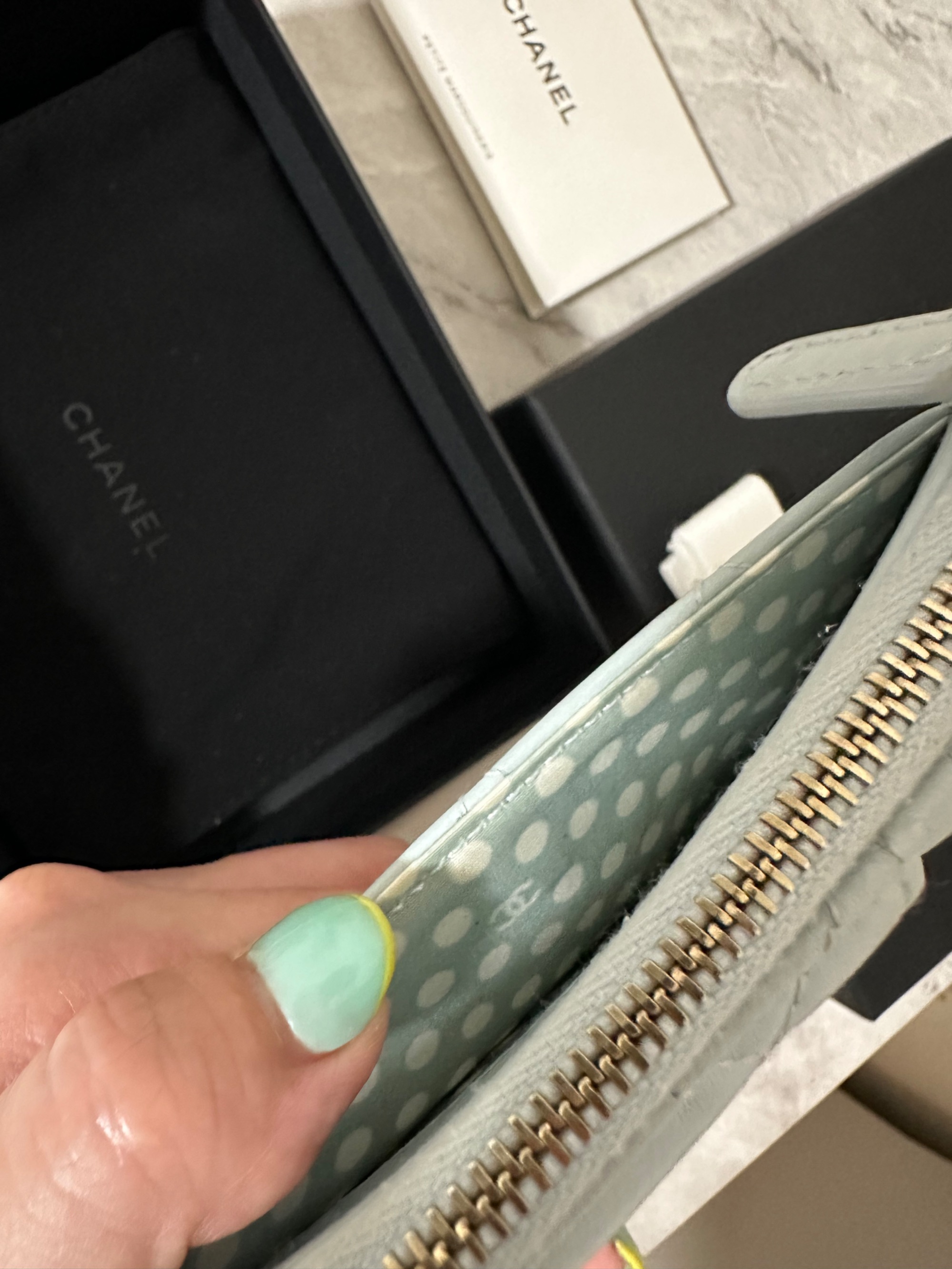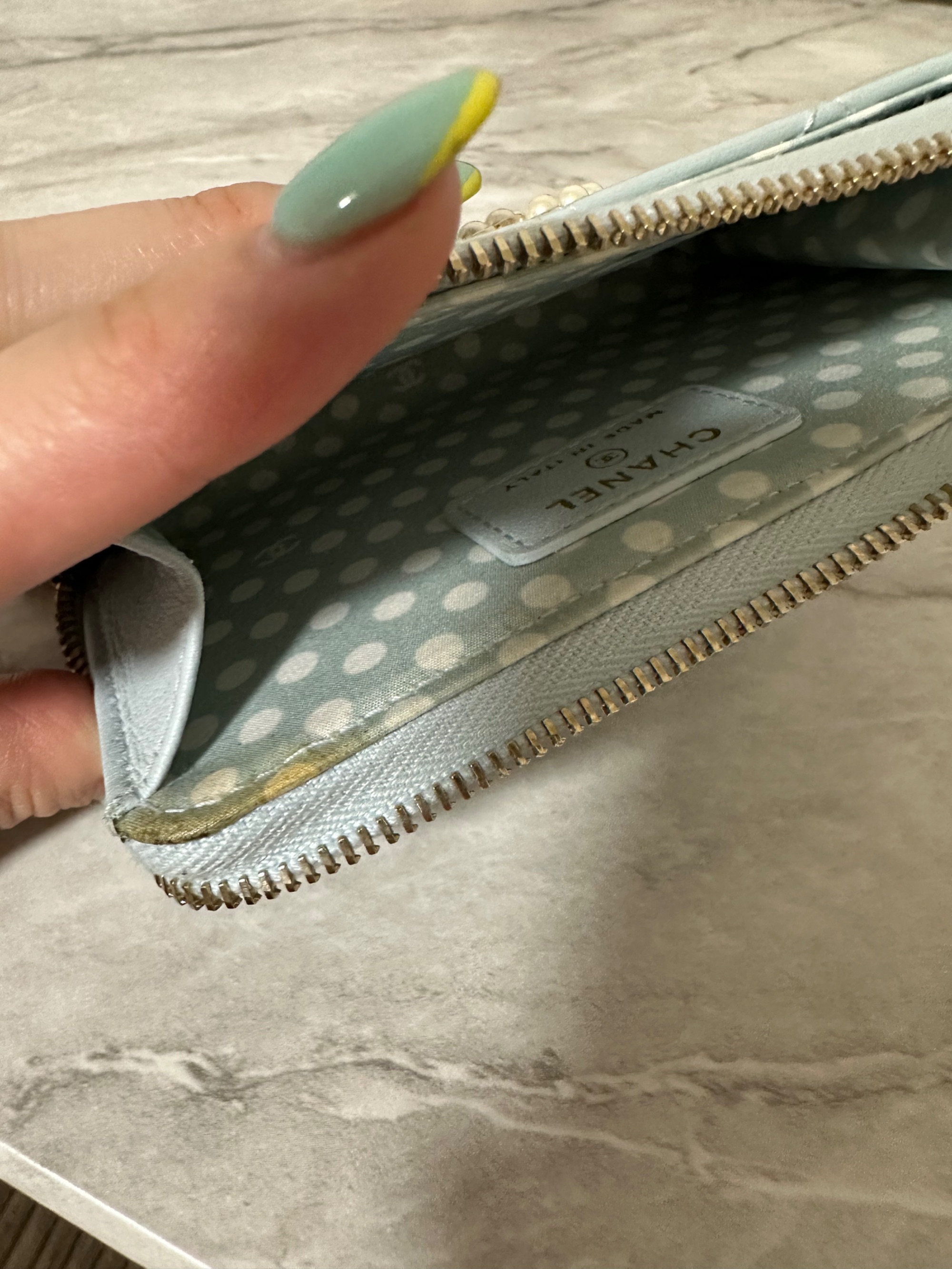 ■シャネル マトラッセ レザーフラグメントケース カードケース ココマーク フェイクパール ブルー系