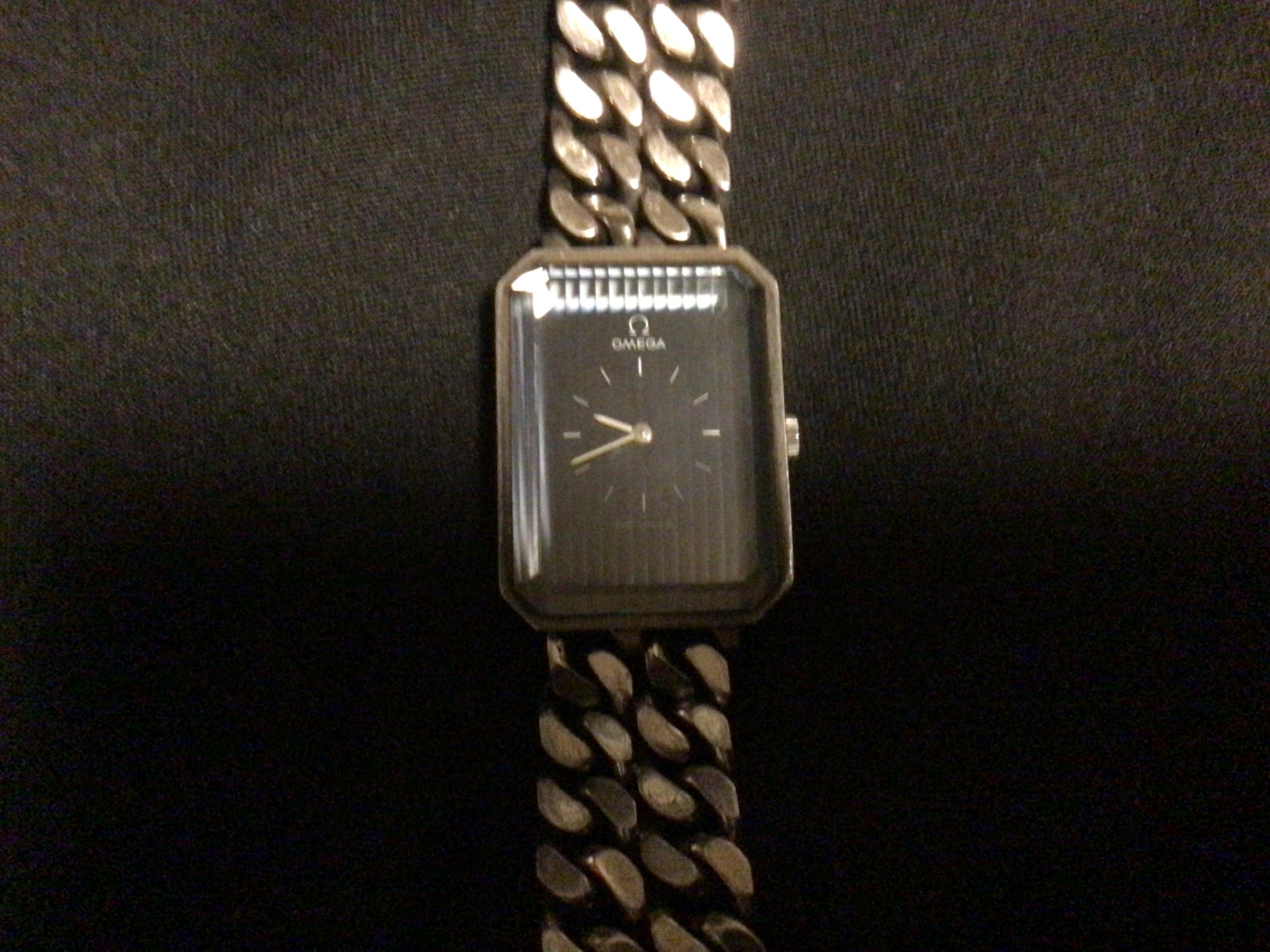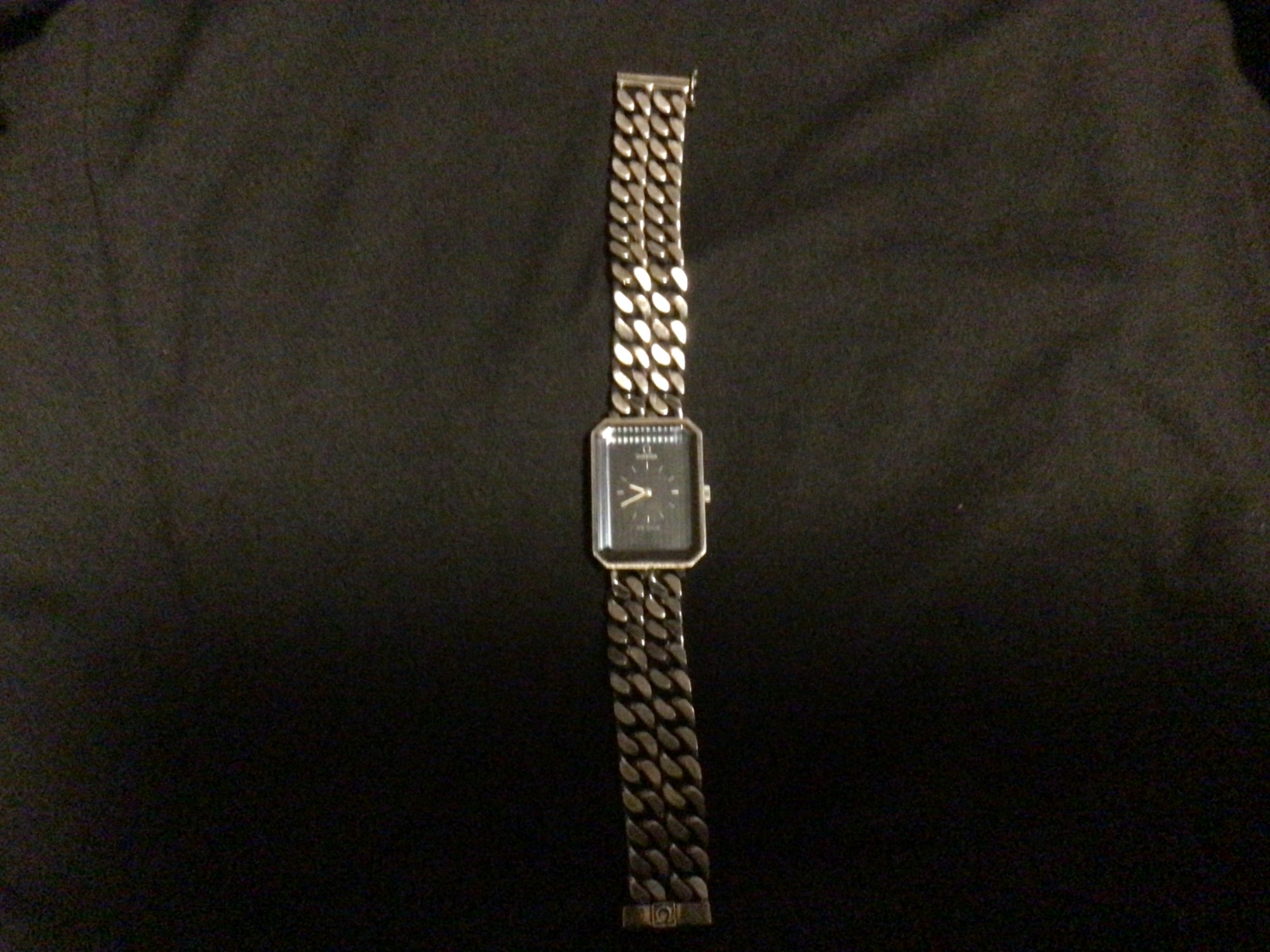 オメガのデヴル。ベルトの部分は4列のチェーンで文字盤はブルーです。目立った傷は無