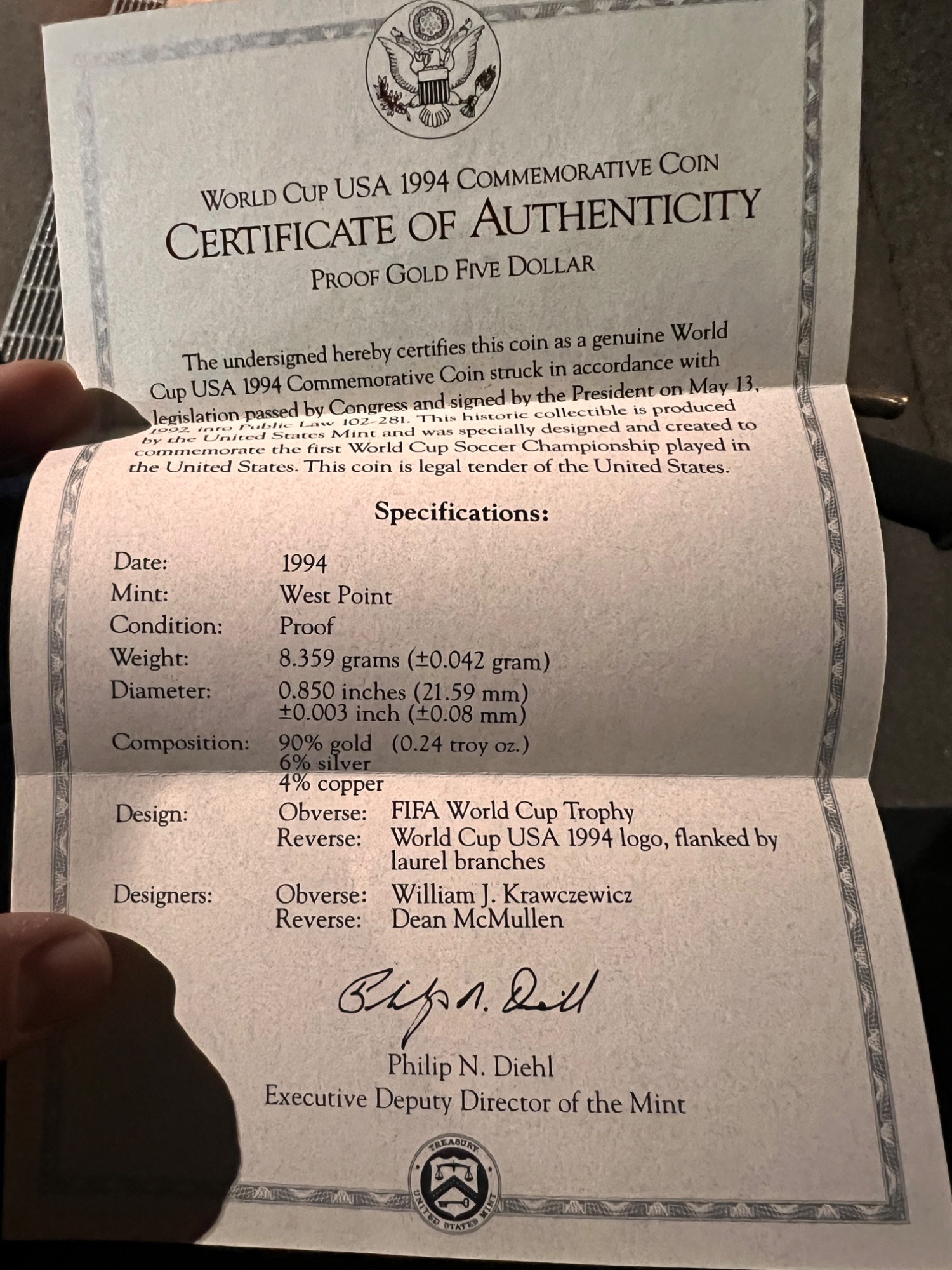 1994年 W杯 アメリカ大会記念 5ドル金貨 プルーフ(証明書・ケース付)