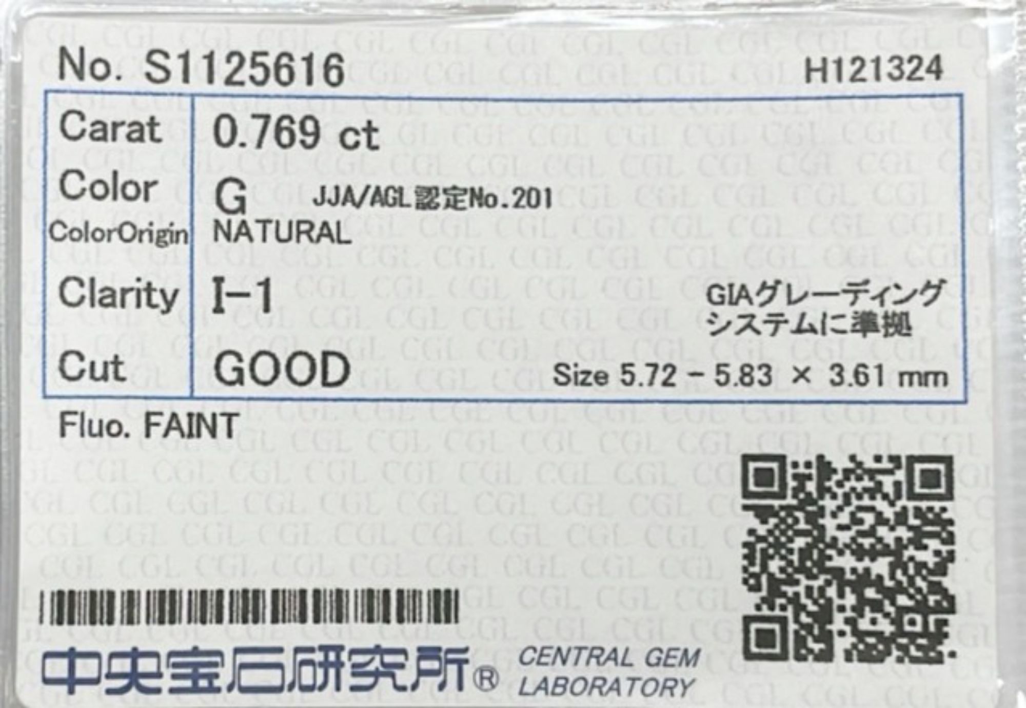 天然ダイヤモンドルース 裸石 NATURAL DIAMOND D0.769ct G I1 GOOD sorting 中央宝石研究所ソーティング付き