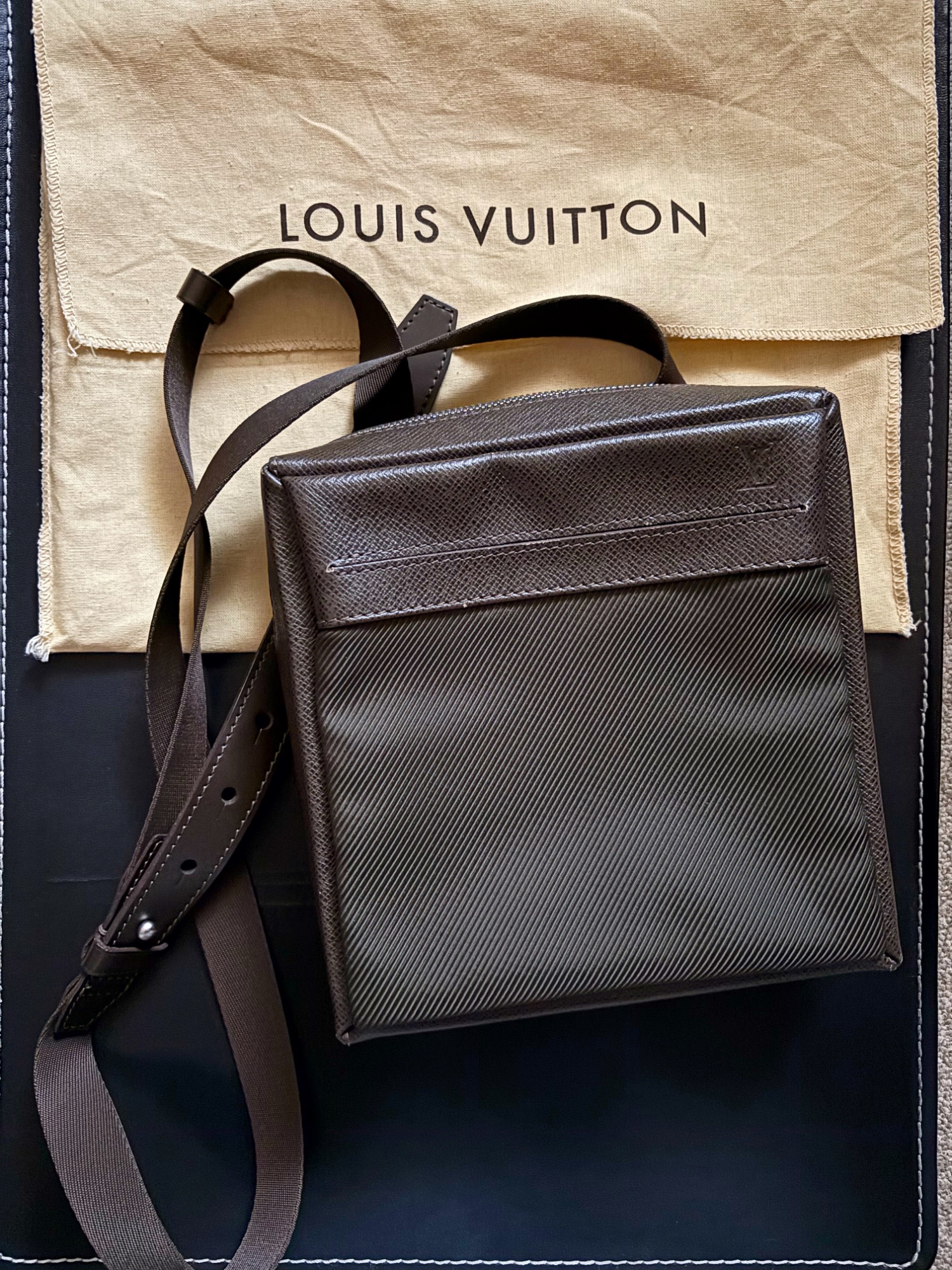 2004年の12月にローマの直営店で買いました。型番らしきタグはポケットの奥の方にあって調べられませんでした。付属品は写真にあるコットンの袋だけです。古い物ですが、ほとんど使ってないので程度は悪くはないかと思います。