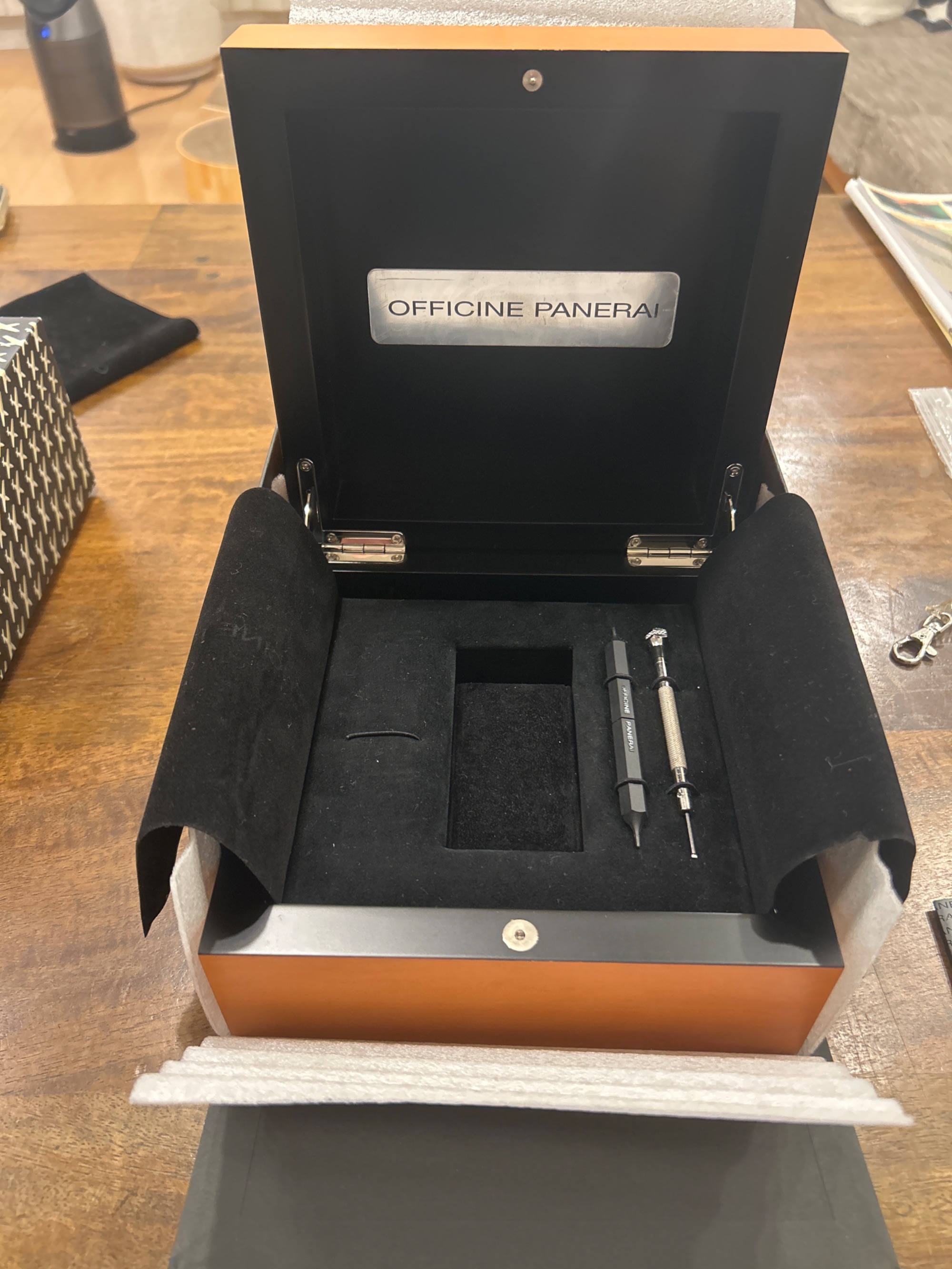 付属品は全てあり:純正ラバーベルト(使用感あり)、木箱、ベルト交換ツールx2、保証書、説明書など。