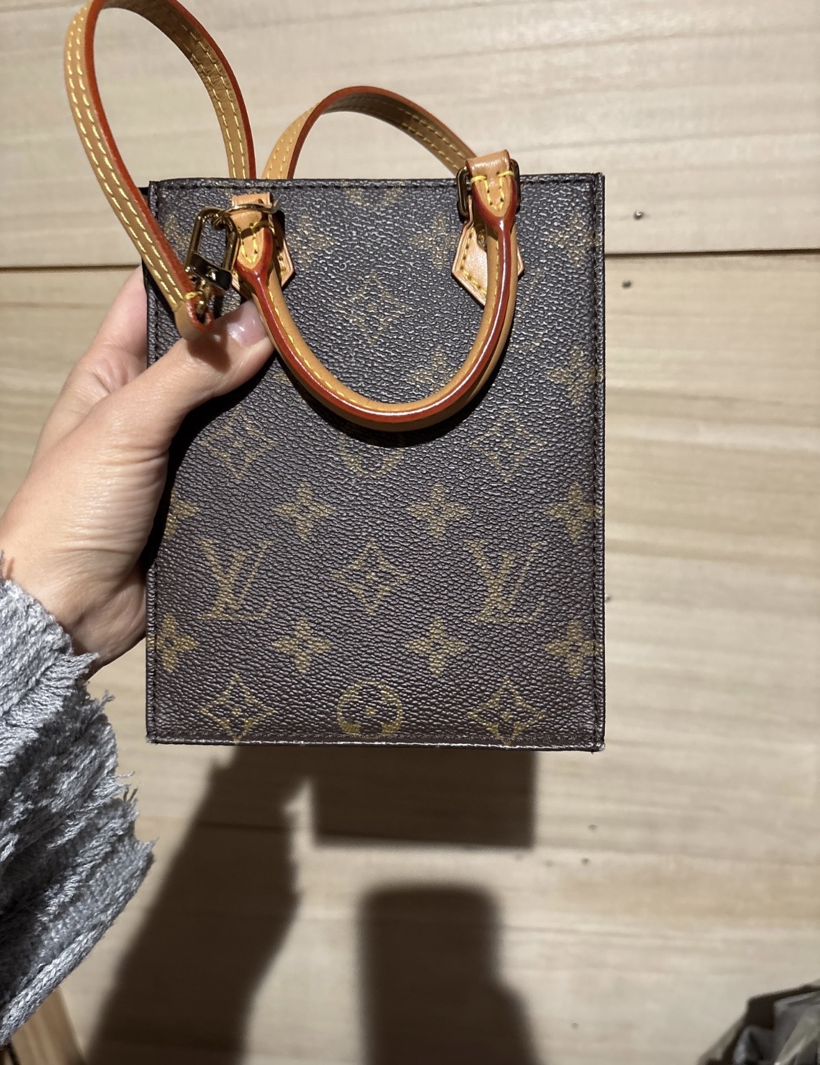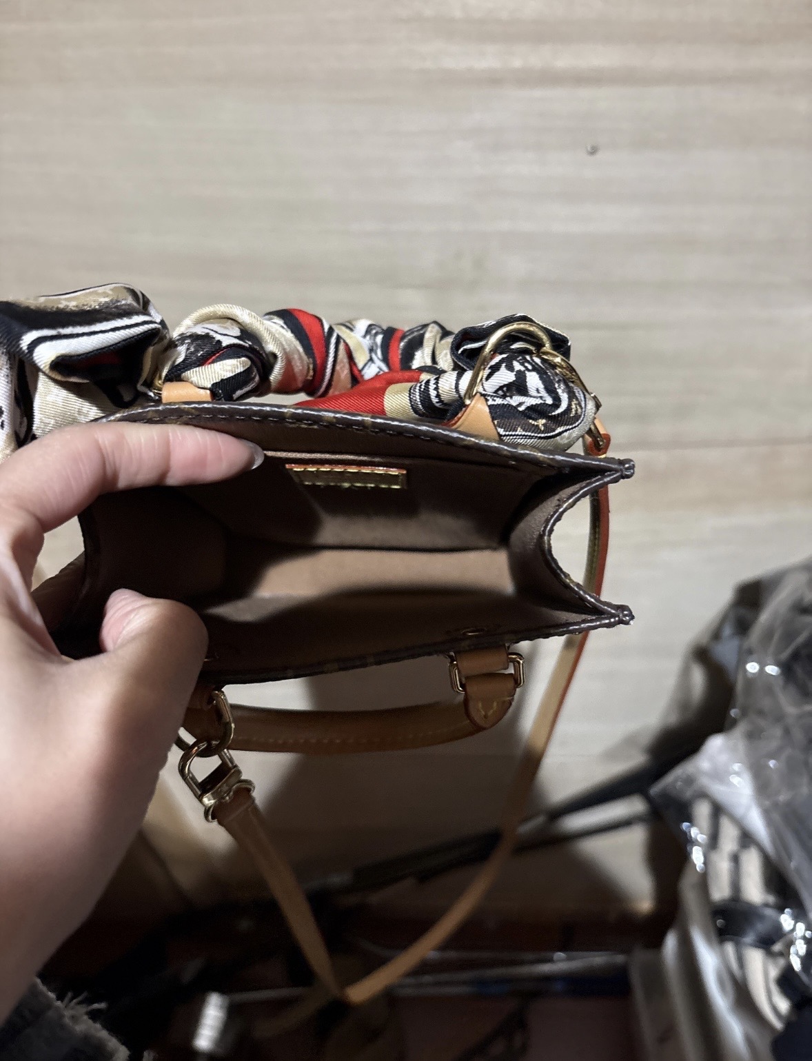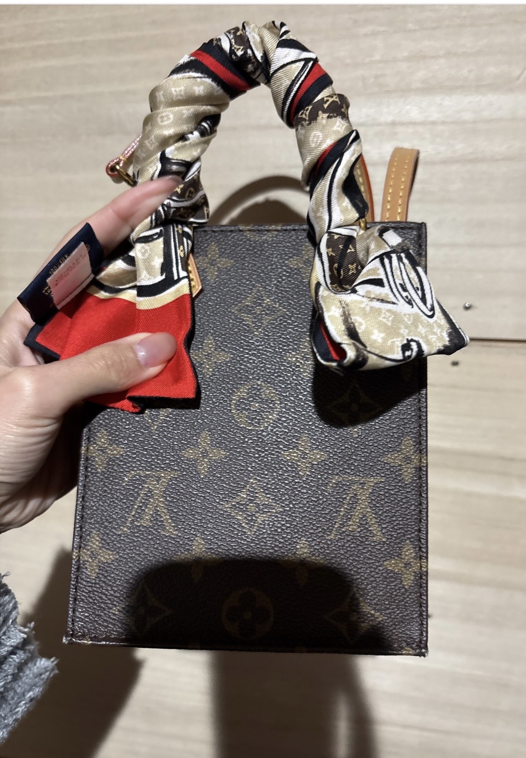 スカーフ付きのハンドルが特徴的なブラウンのサックプラミニショルダーバッグ。