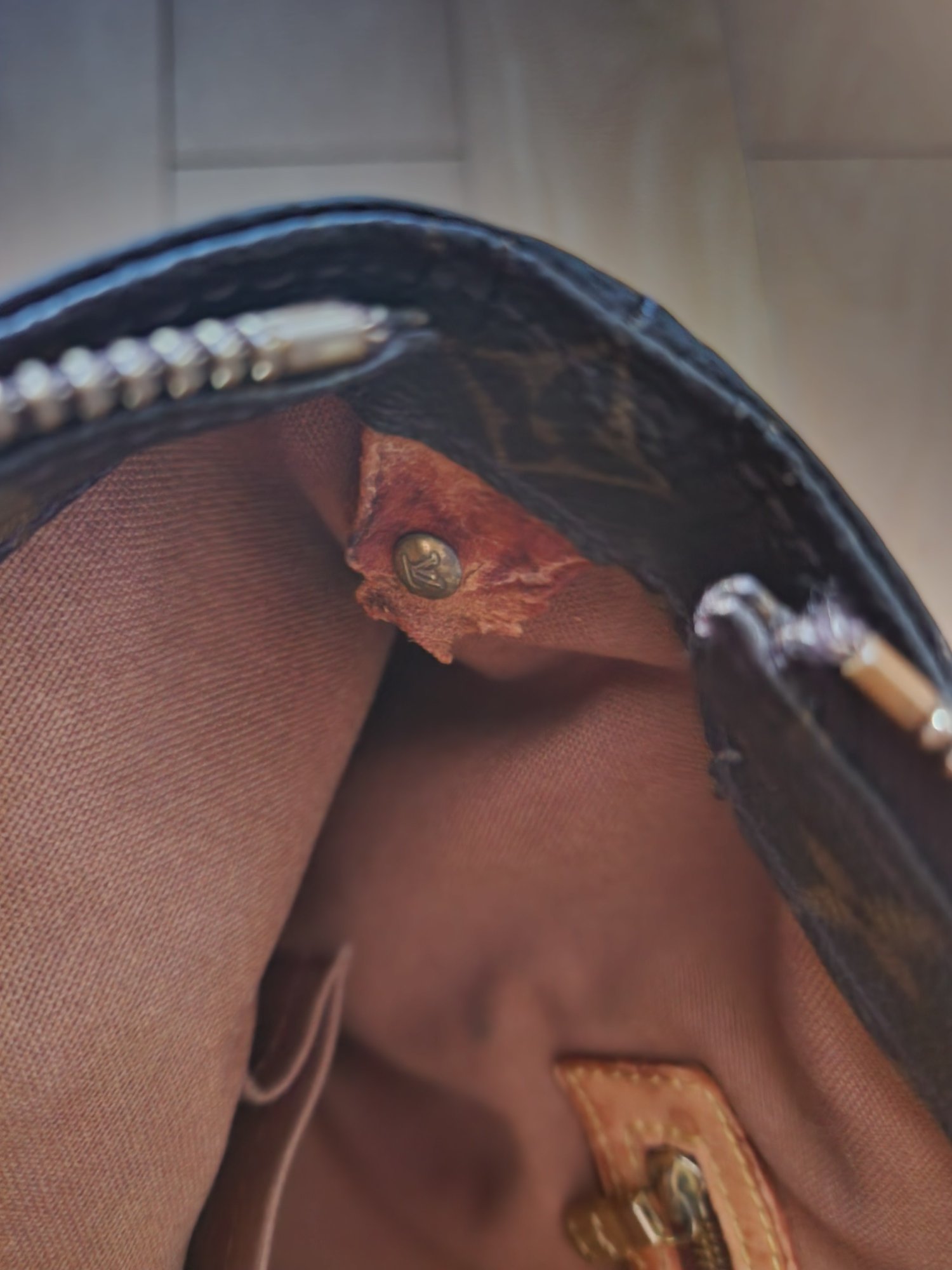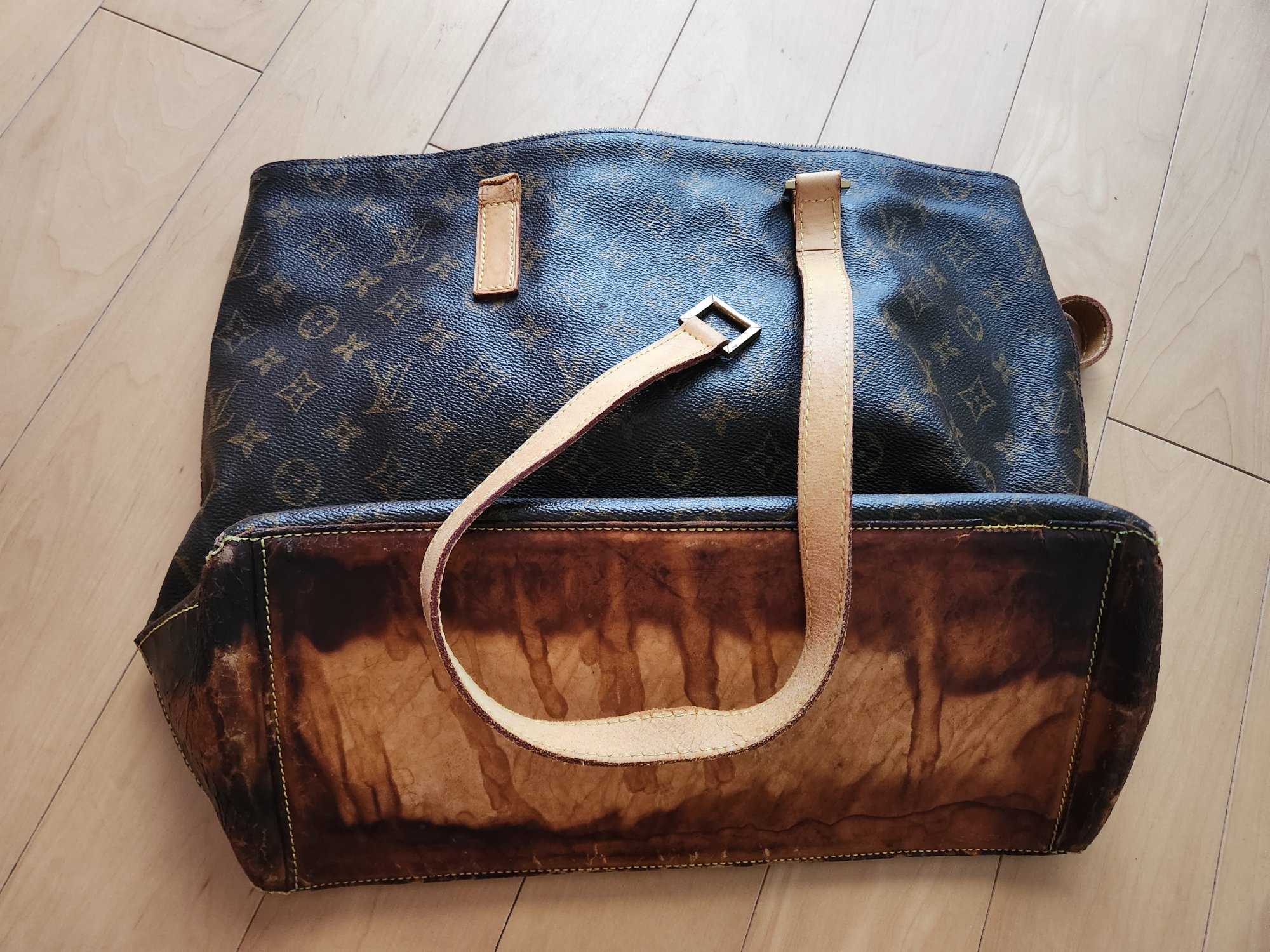 肩掛けが、切れている。 底が変色している。 中のブランドタグの劣化