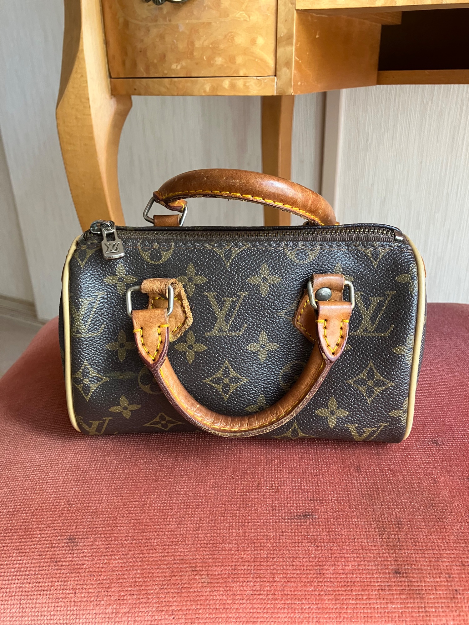 30年ぐらい前に父からプレゼントされたものですがかなり使用感ありバックの中身はブルーのアイシャドウがついてます。ショルダーベルトは紛失してます。