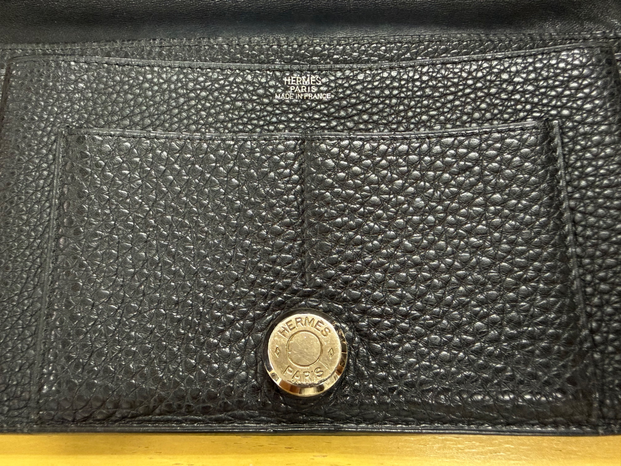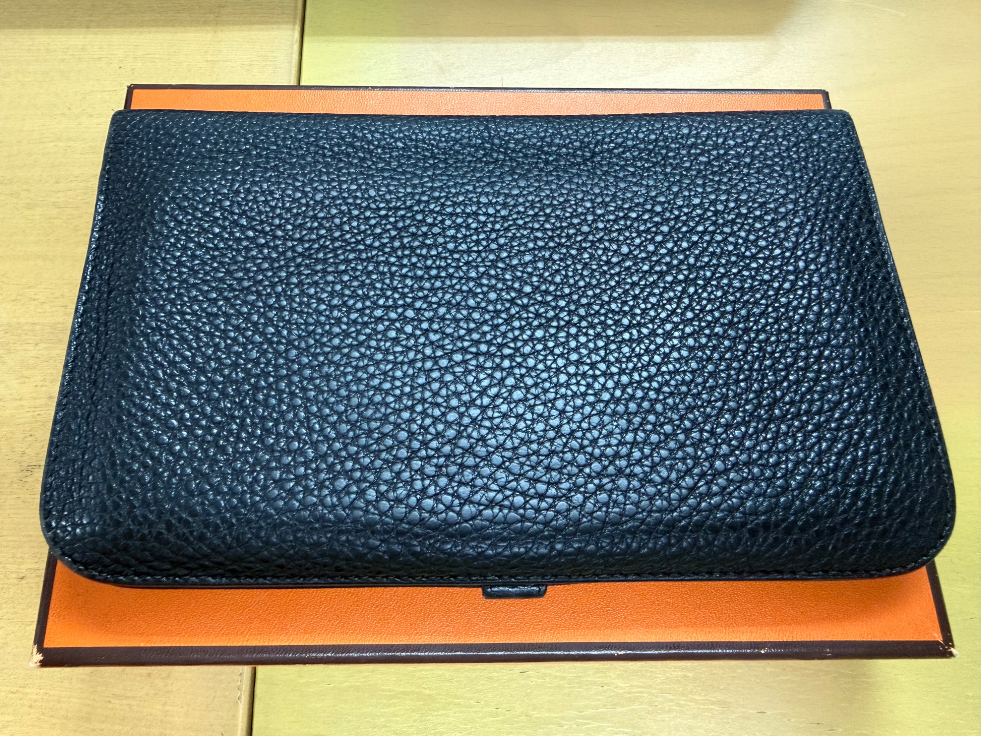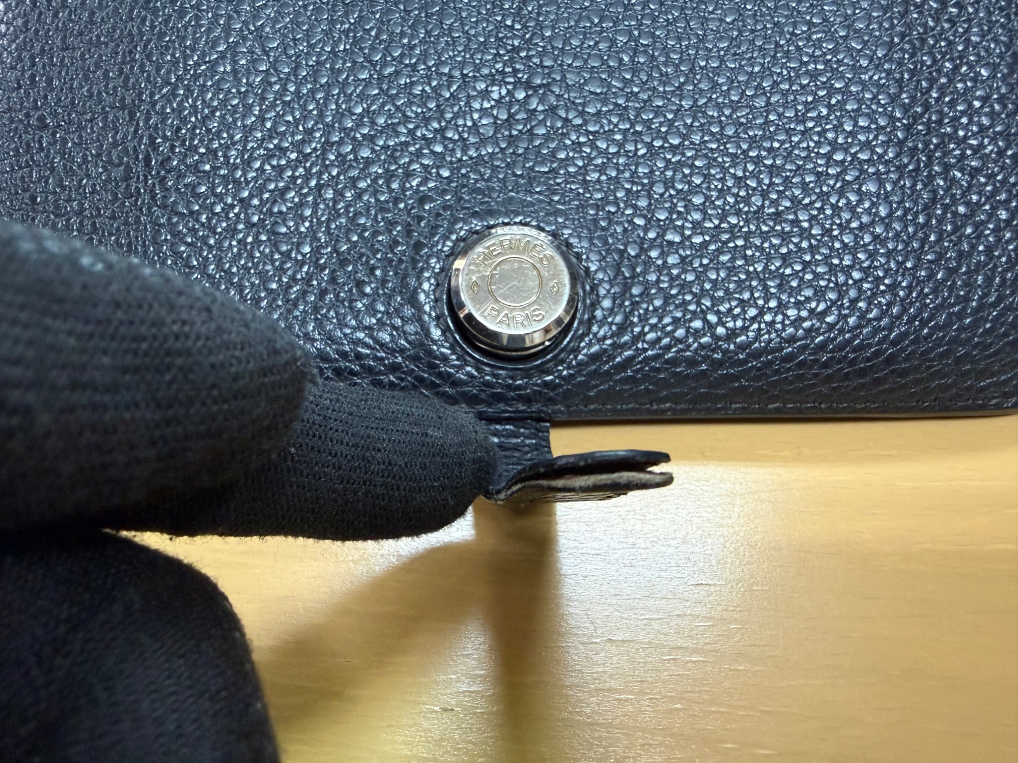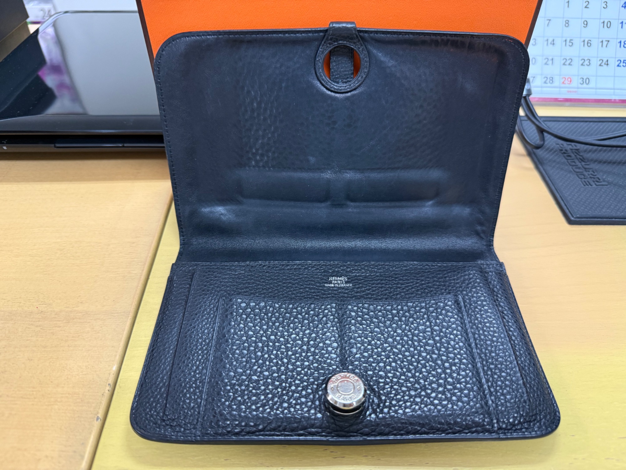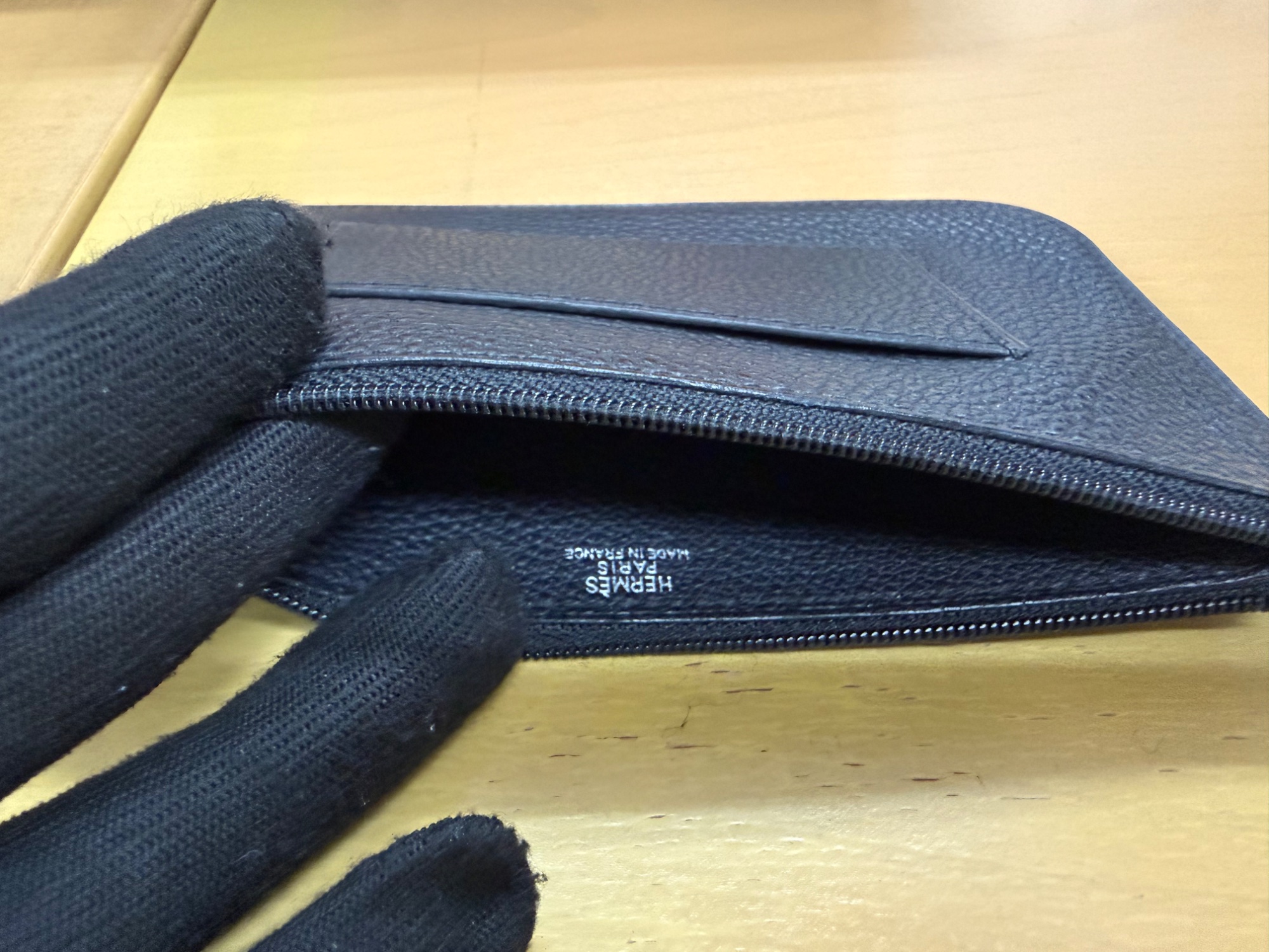 経年劣化、お札入れのサイドのほころび、ベロの先端剥がれ、コインケースチャック紛失、箱の角スレなどのダメージが見られます。