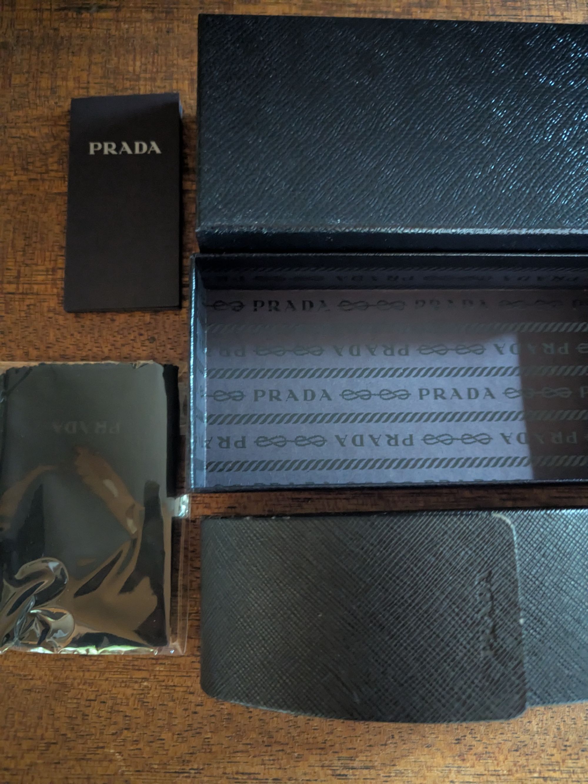 外箱、ケース、メガネ拭き(未使用)、説明書があります。
