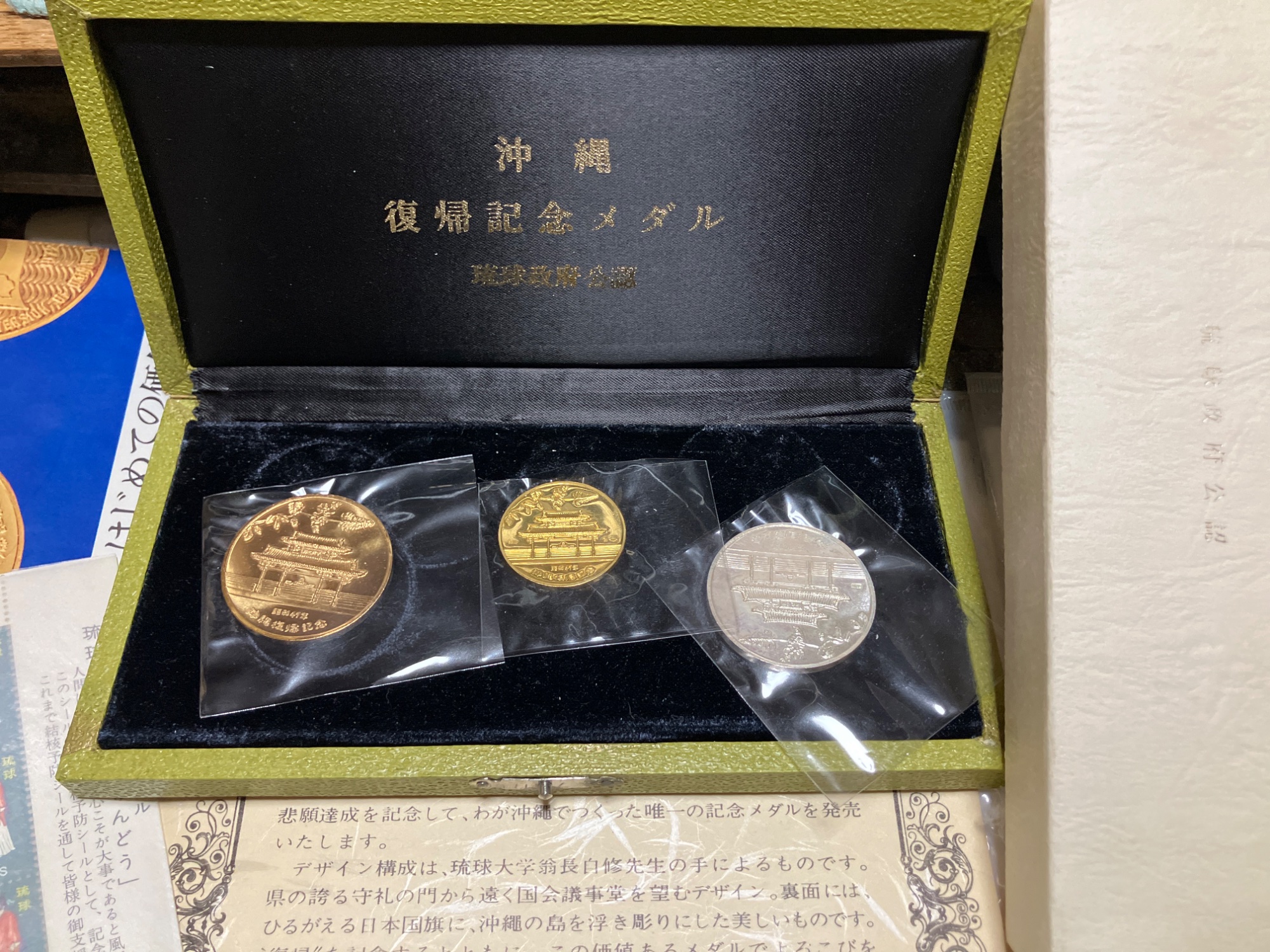 箱、沖縄琉球政府公認 大蔵省造幣局品位検定の証明となる説明文の紙とカラーのメダルご予約承り書 1971年琉球結核予防シール(しゅんどう)購入日昭和47年4月17日 純金15g銀19g銅15gのフルセット