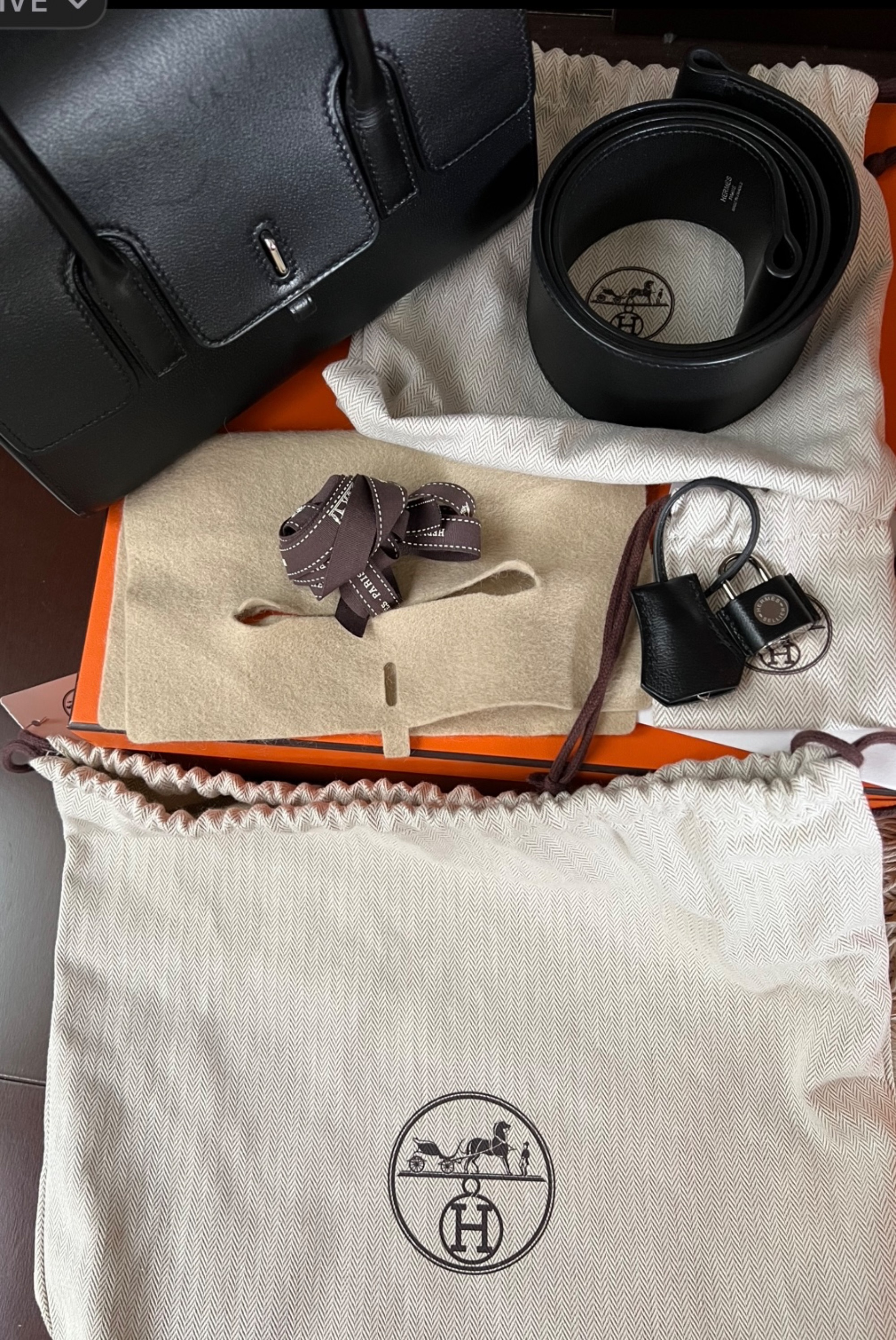 バンドリエール、カデナ、クロシェット、鍵2、布袋3、箱、ショッパー、リボン等、購入時の付属品完備。