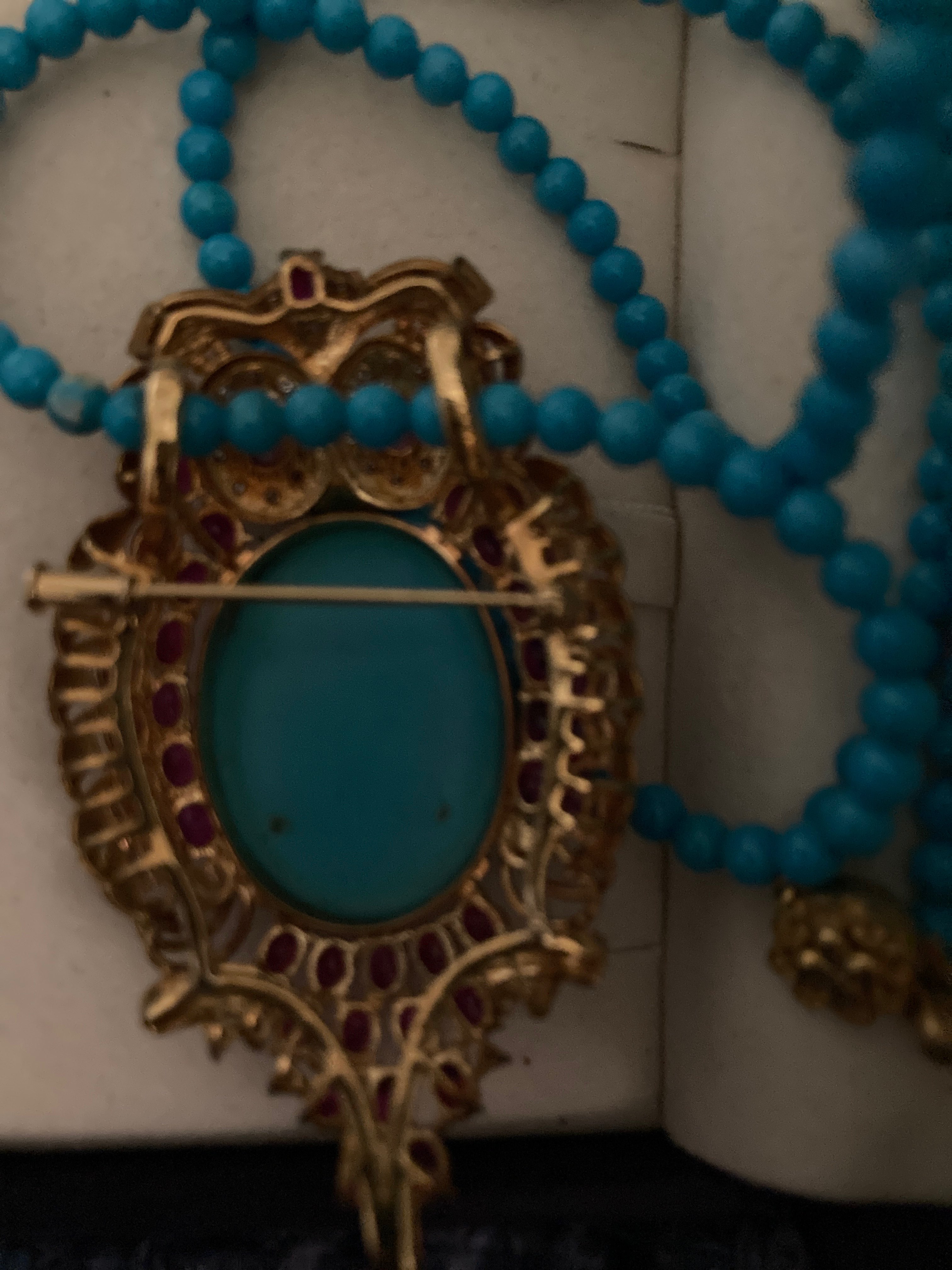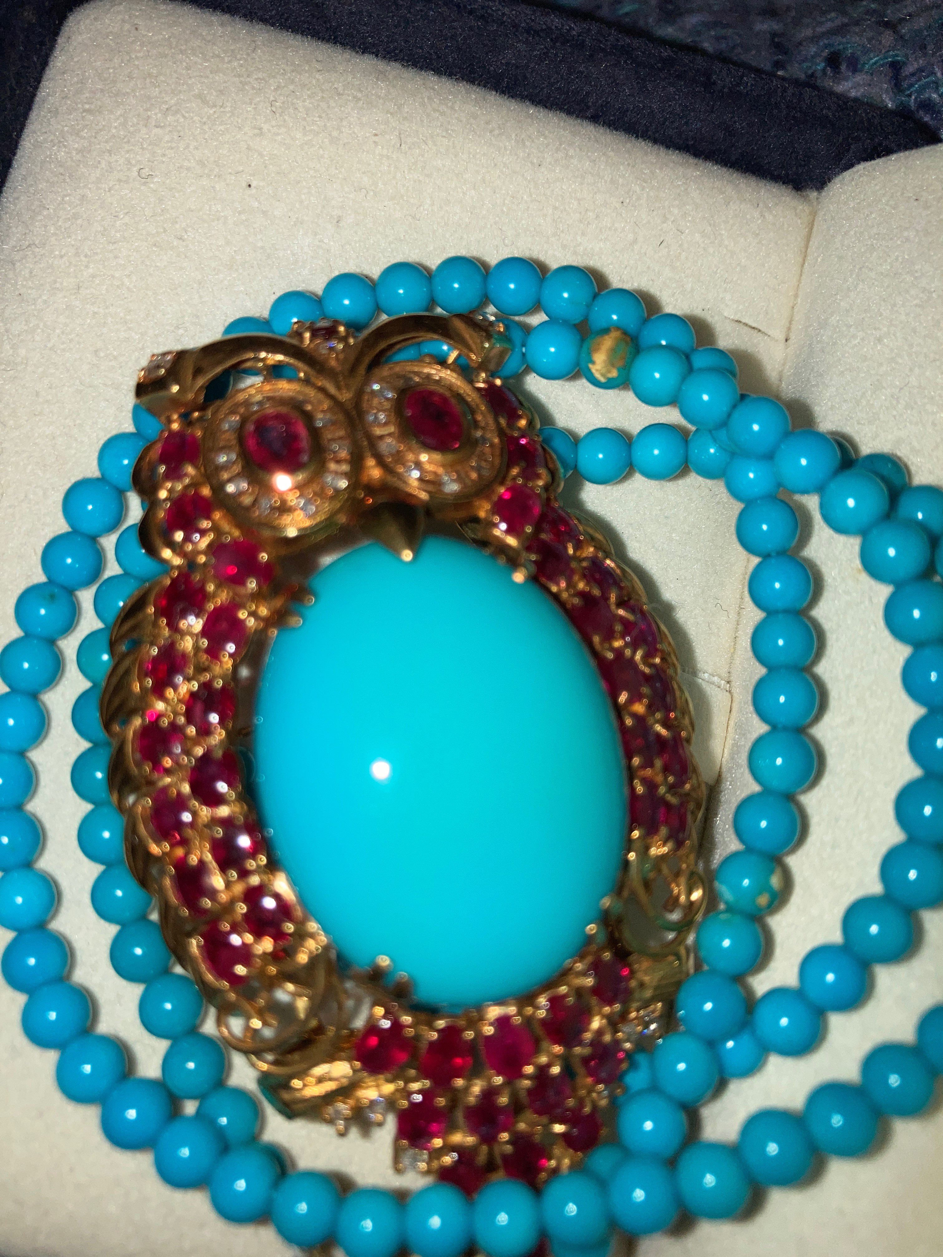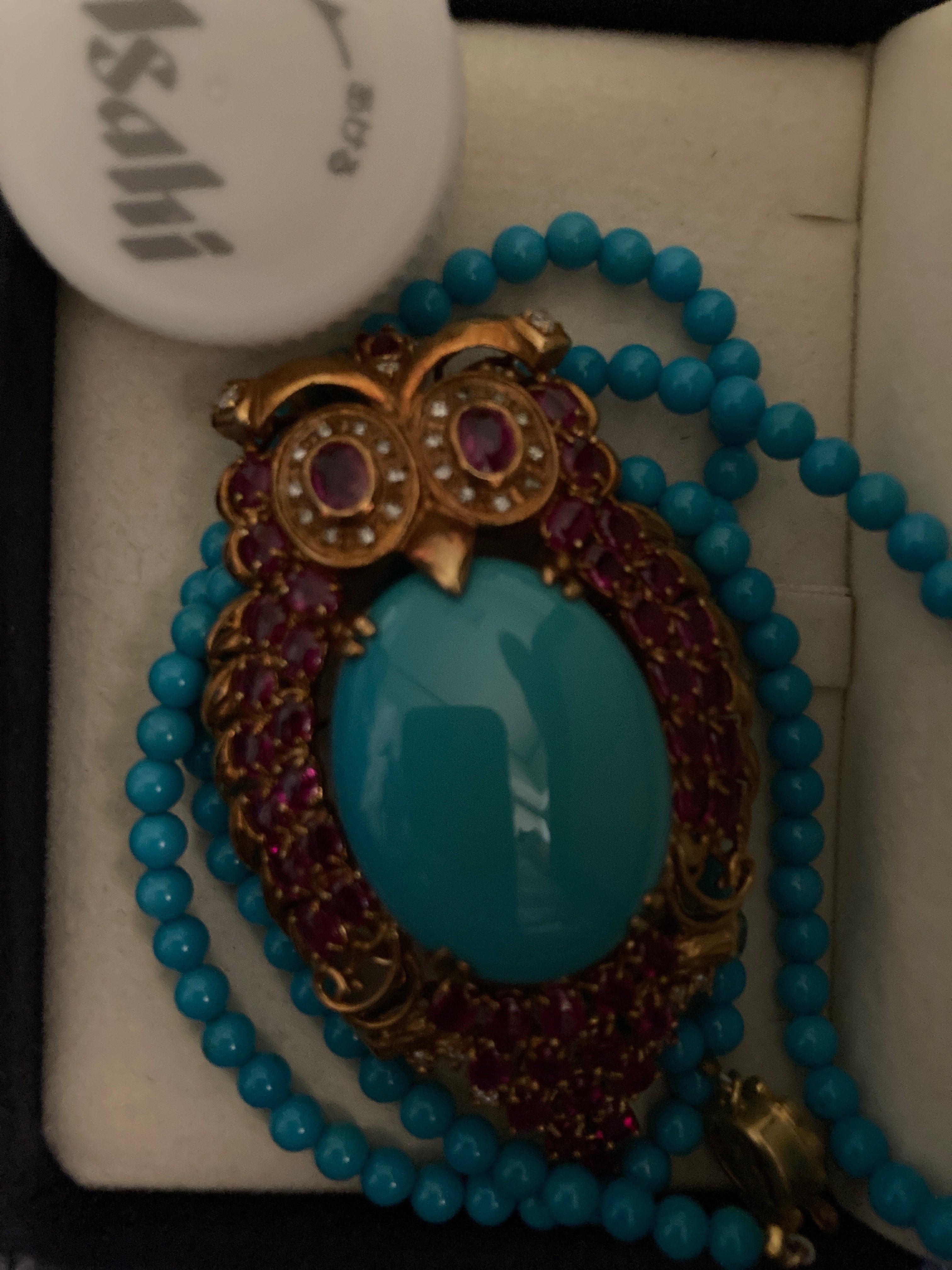 イタリー製の梟のデザインブローチ・ターコイズネックレスは三越で後日合わせた品