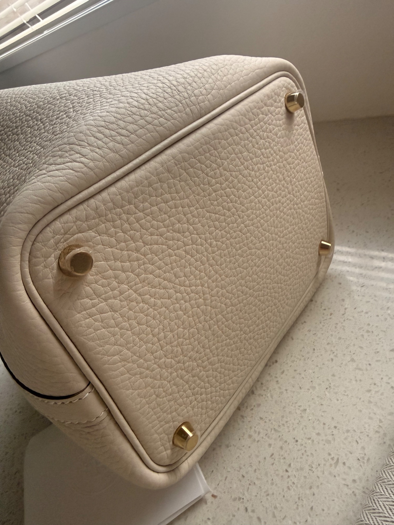 金具はゴールドです。付属品全て揃っており、底鋲にはテープがついたままです。