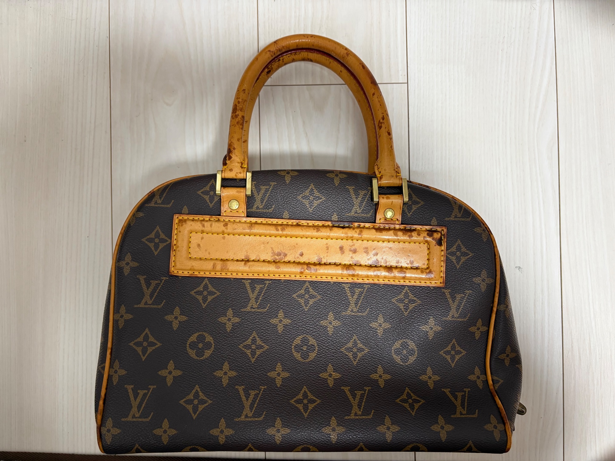 母から譲り受けたもので購入年月日等不明です。形はしっかりしたままですが、シミが所々出てきてます。