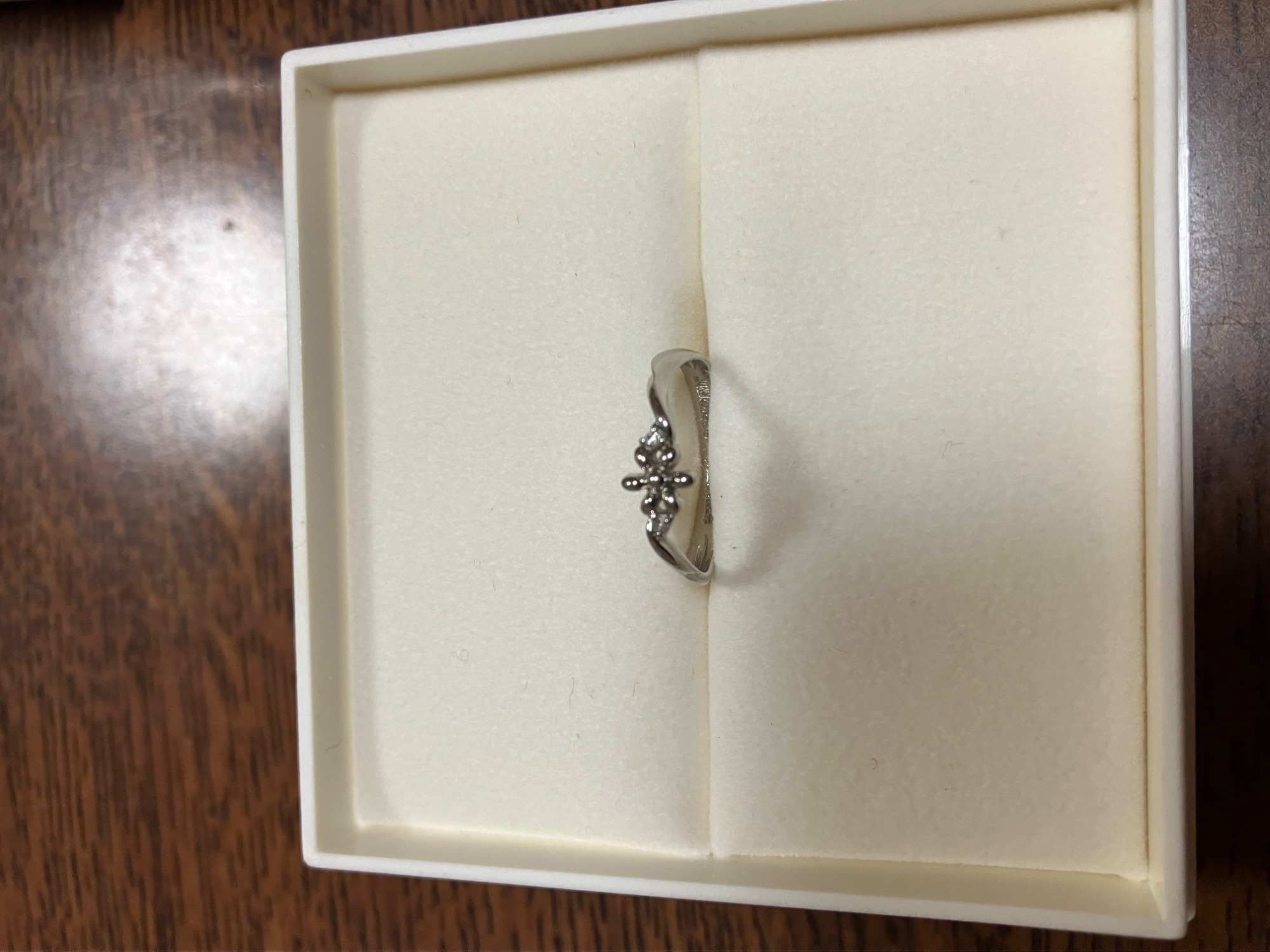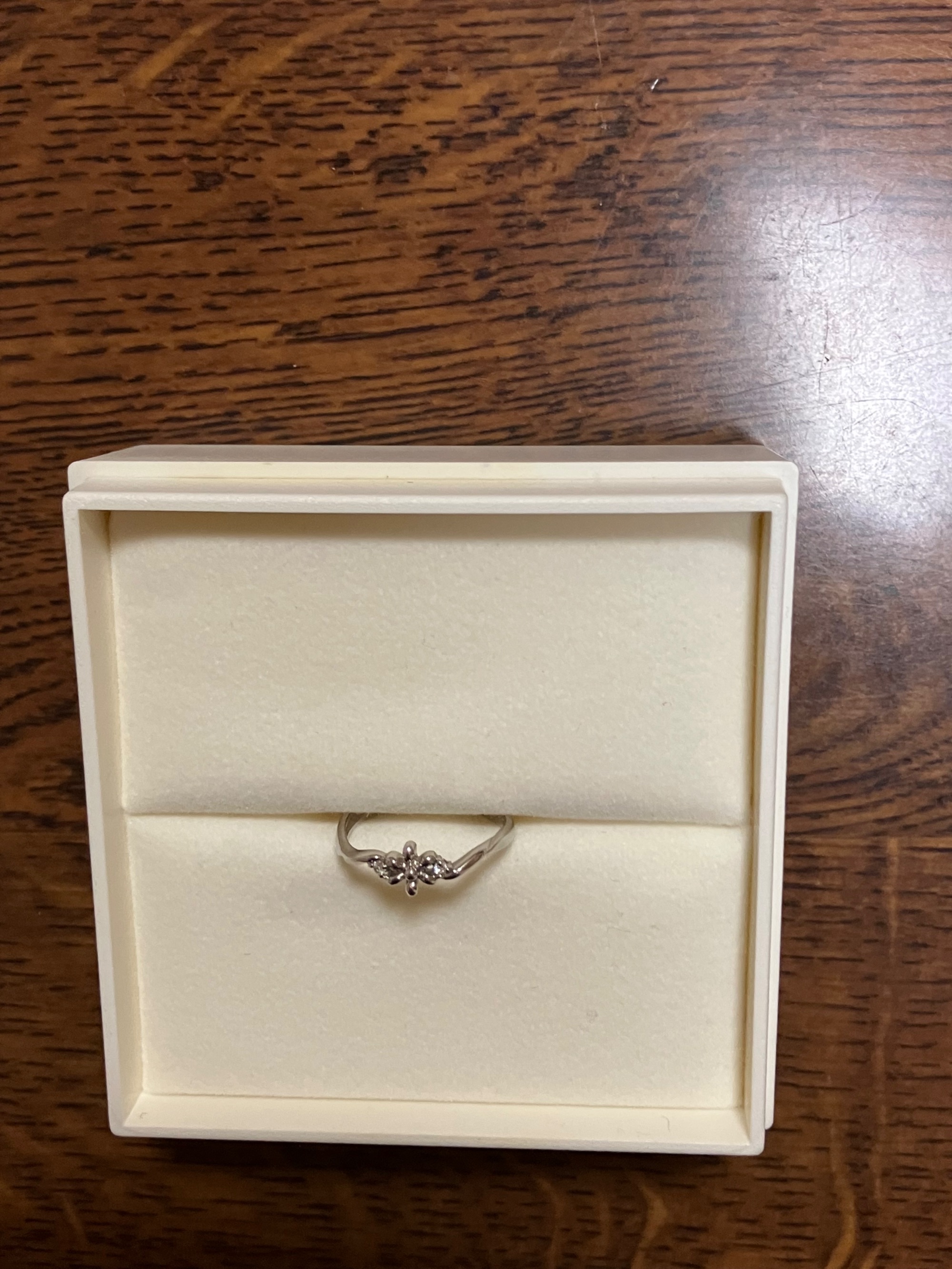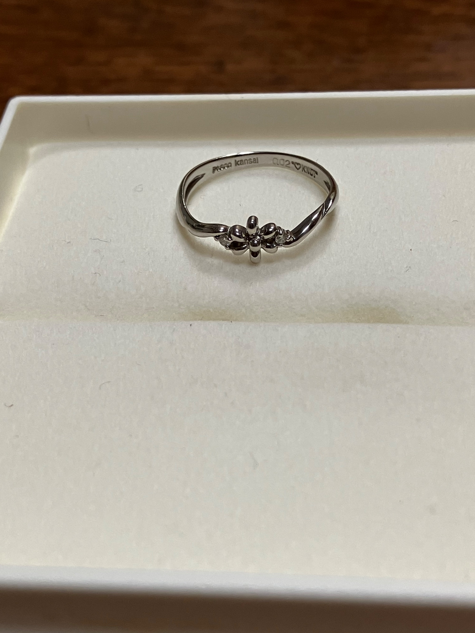 専用箱 あり お花の形が可愛くて買いました。 一応ダイヤもついているのですが、0.02KNOTなので良く見ないと分かりません。リングが歪んでるように見えるのはデザインです。