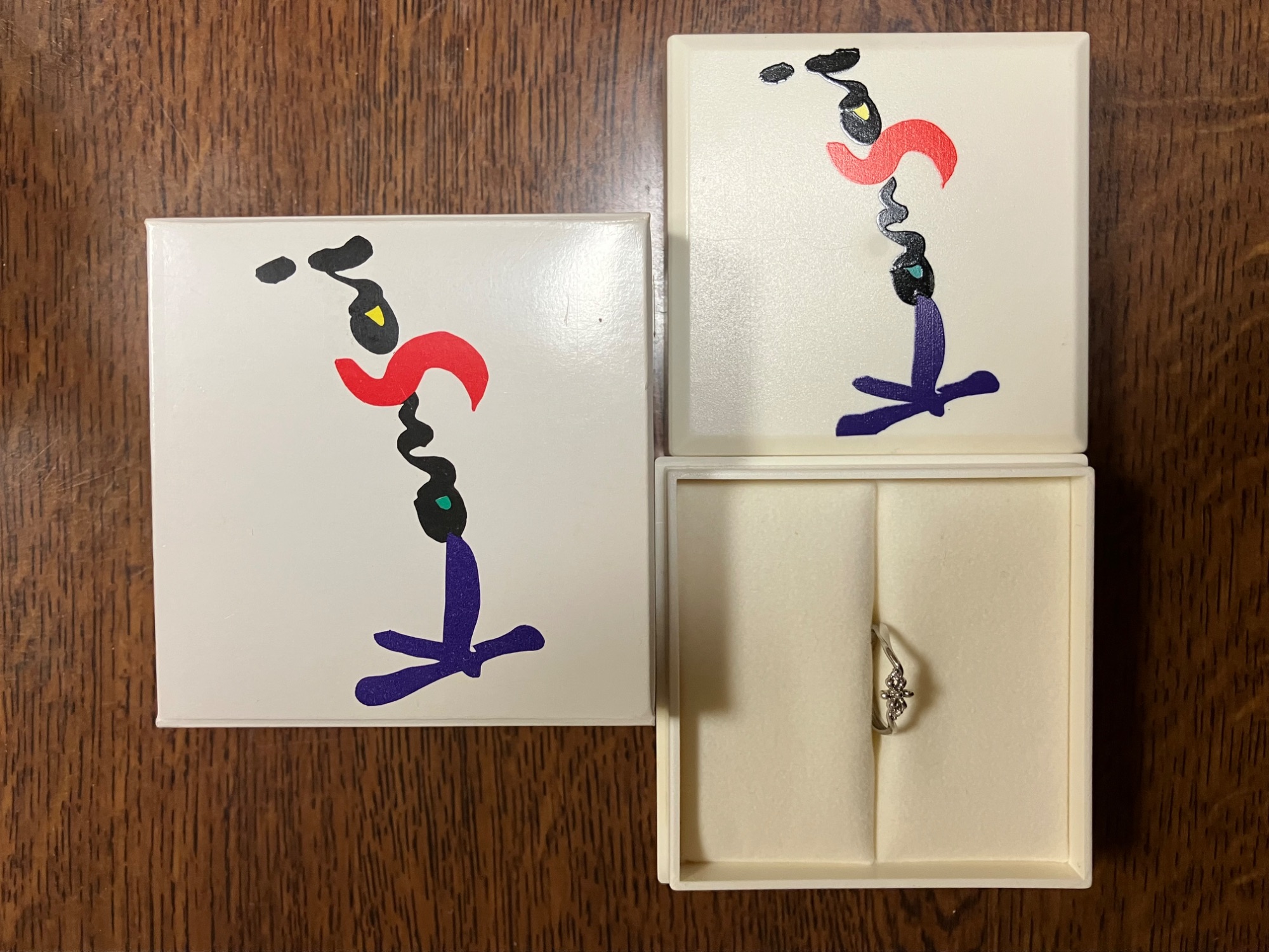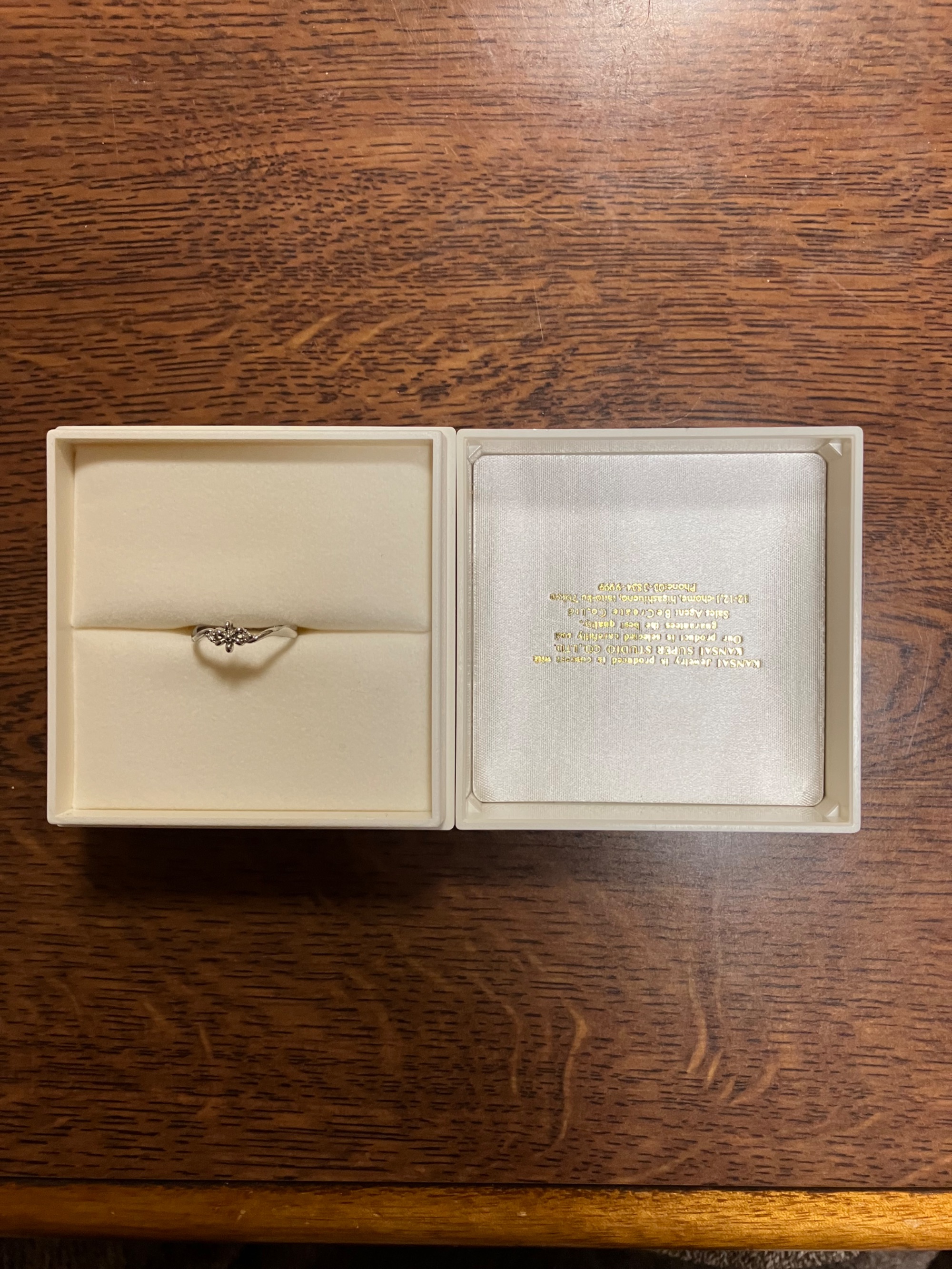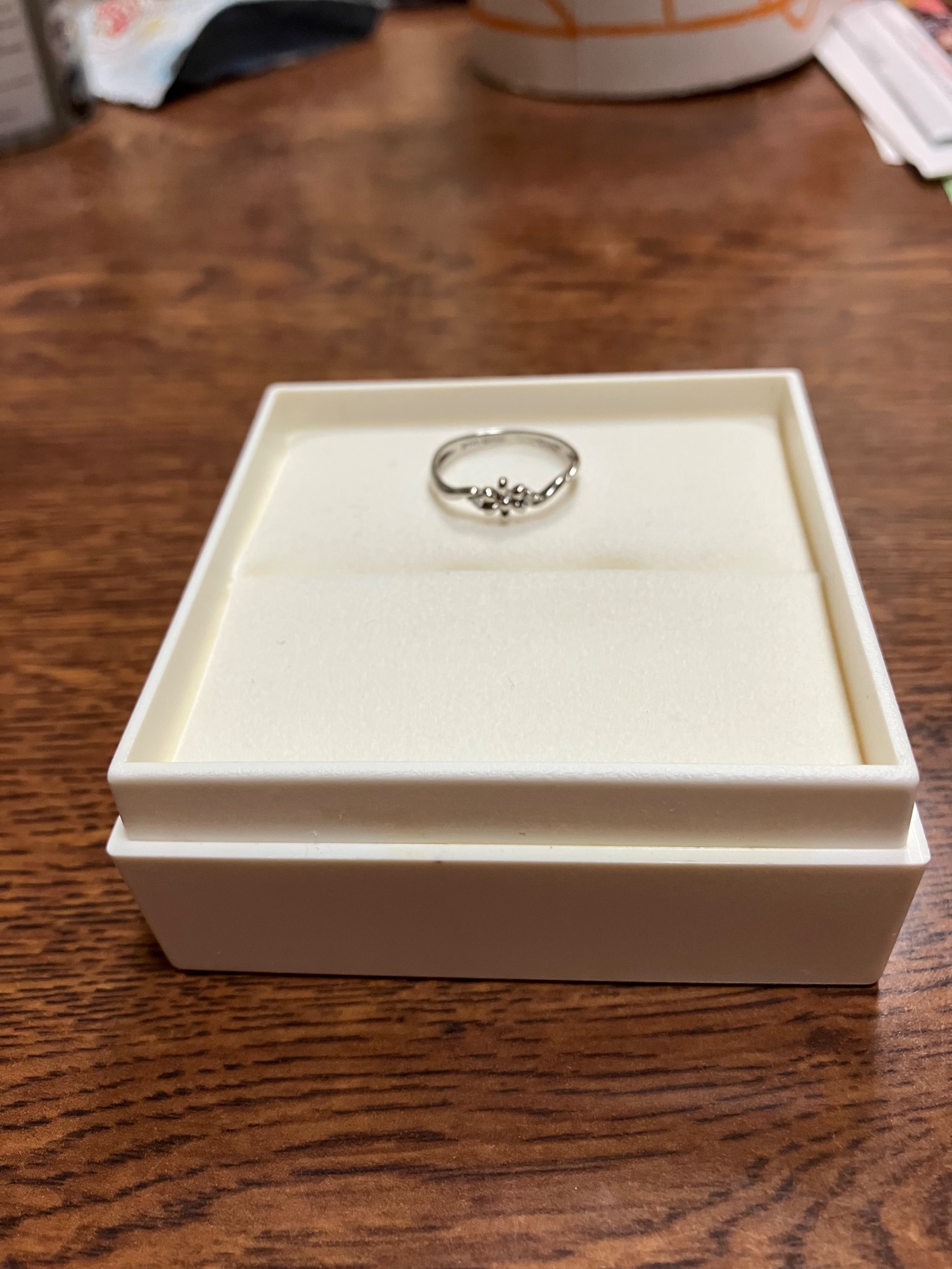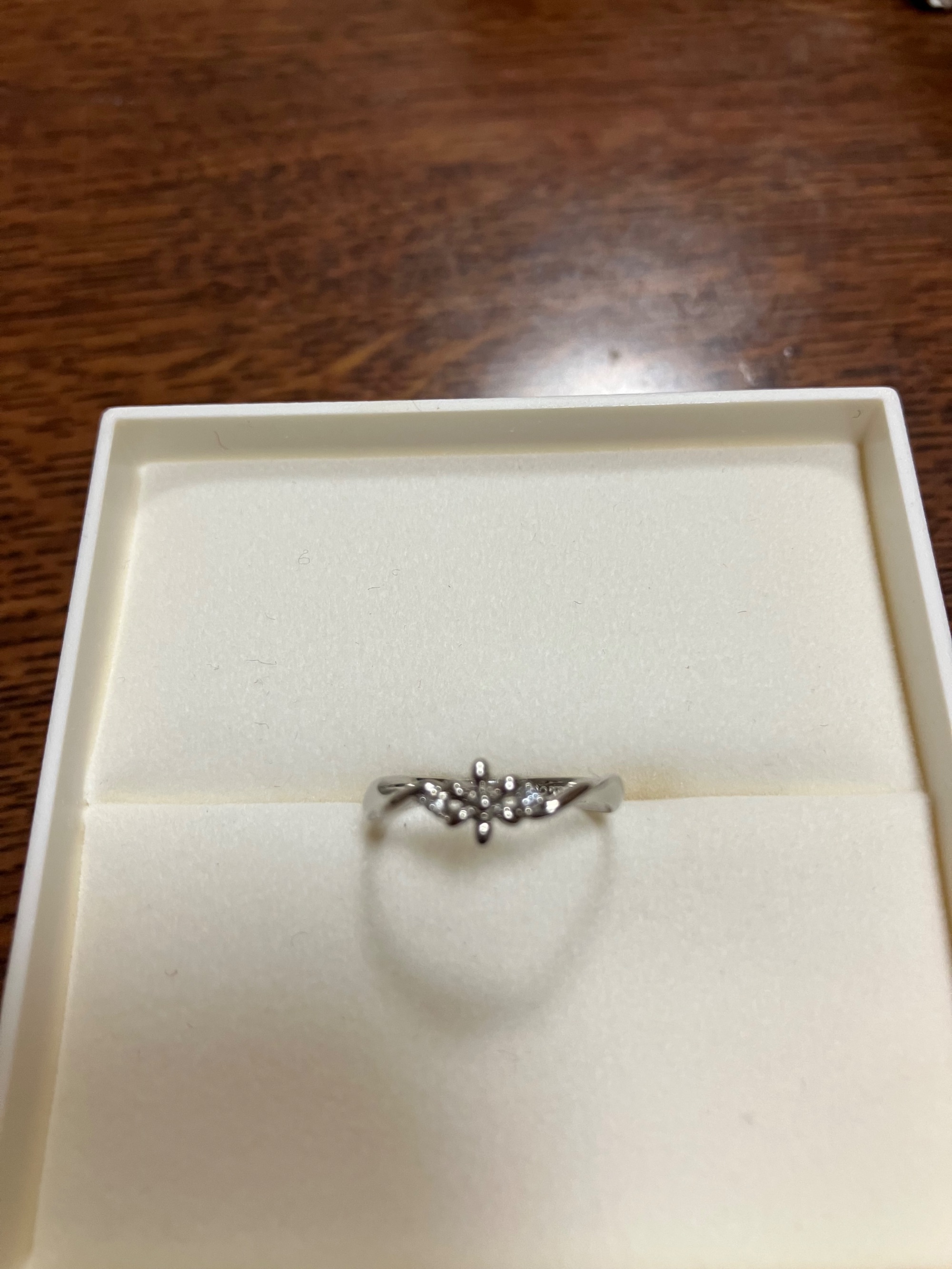 専用箱 あり お花の形が可愛くて買いました。 一応ダイヤもついているのですが、0.02KNOTなので良く見ないと分かりません。リングが歪んでるように見えるのはデザインです。