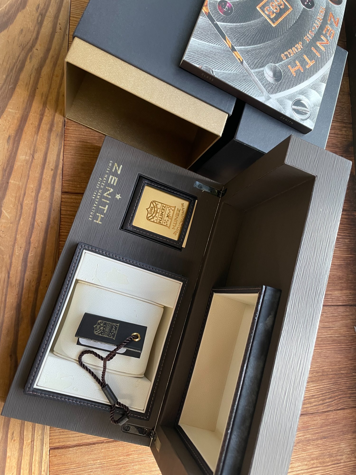 2010年3月LVMH正規品保証書・2024.5月LVMHにて正規コンプリートサービスおよびポリッシュ済・箱・取扱説明書・未使用純正皮ベルト・余りコマ有・ゼニス純正ラバーベルト装着