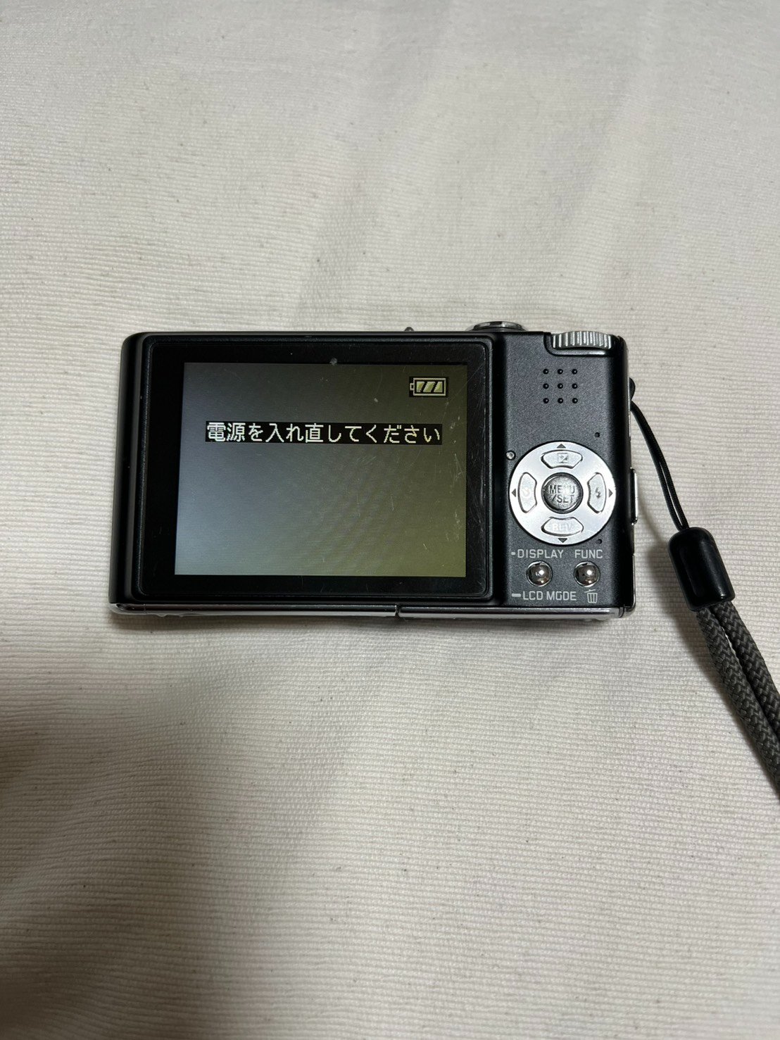動作確認したところ、レンズカバーが開かず、電源をいれてもすぐ「電源を入れな直してください」の表示になり、撮影はできない。