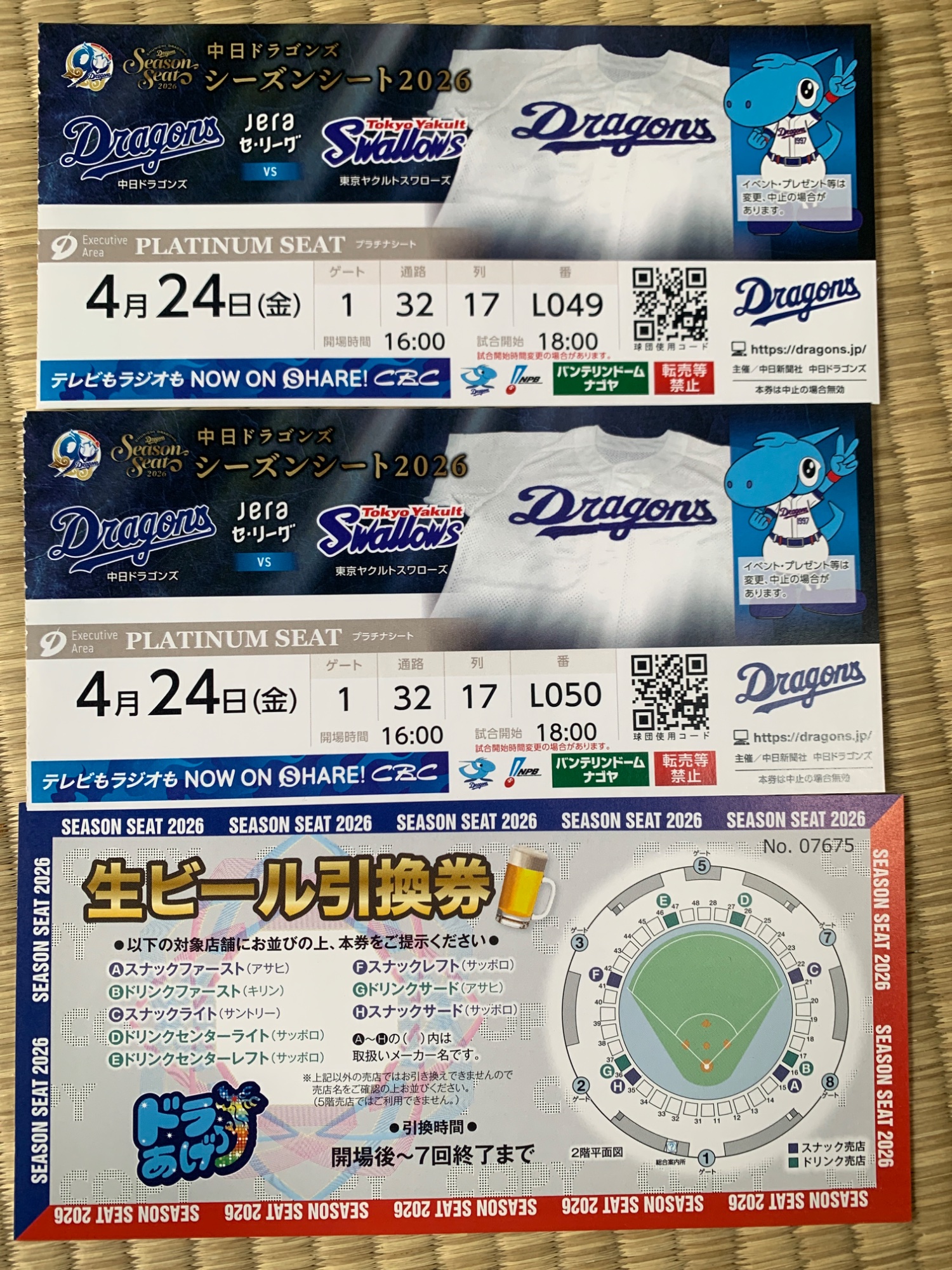 プロ野球チケット 生ビール引き換え券付