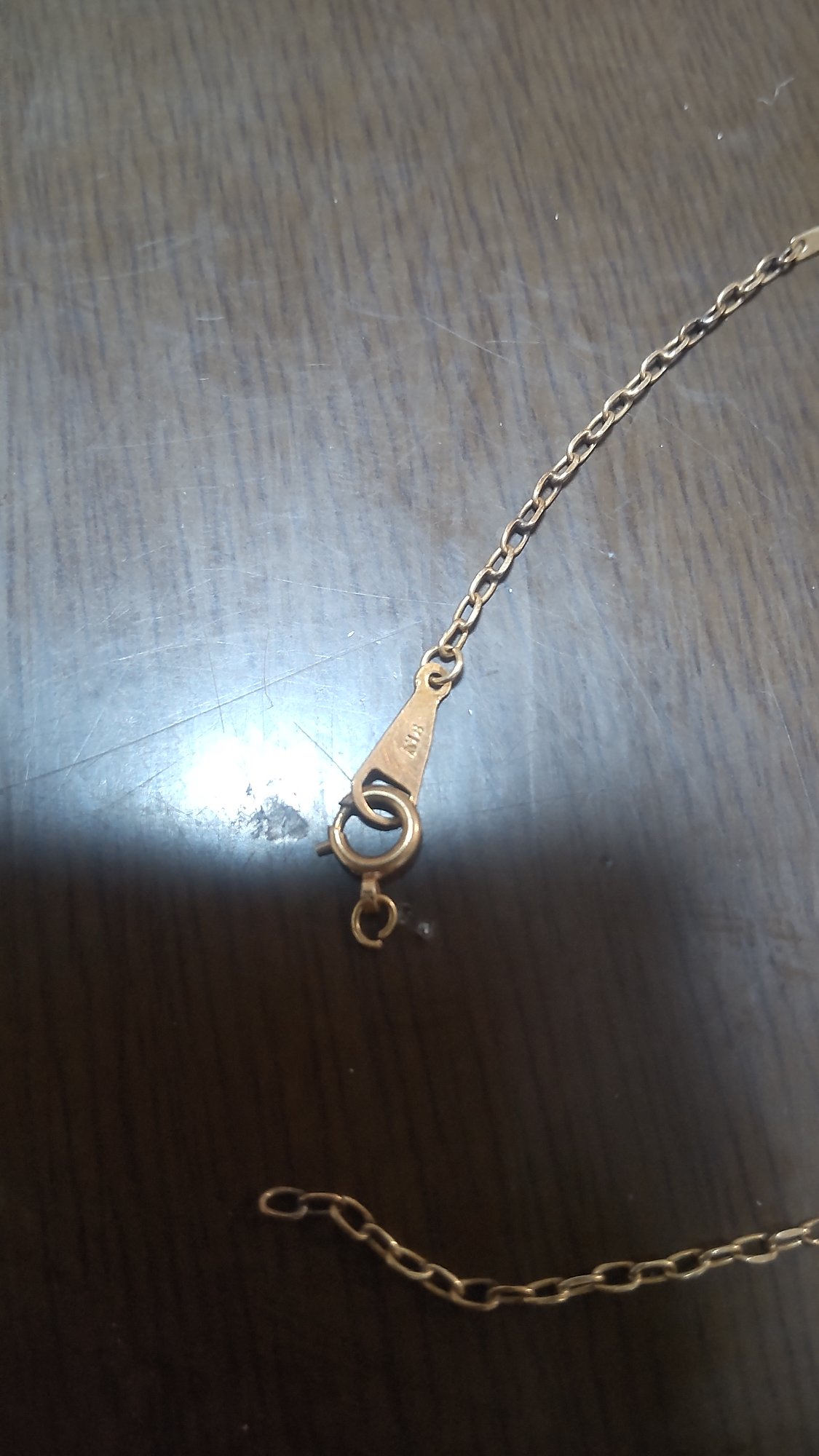端の留め具部分が欠品しており、ネックレスとしては使用出来ない。18Kの刻印あり。