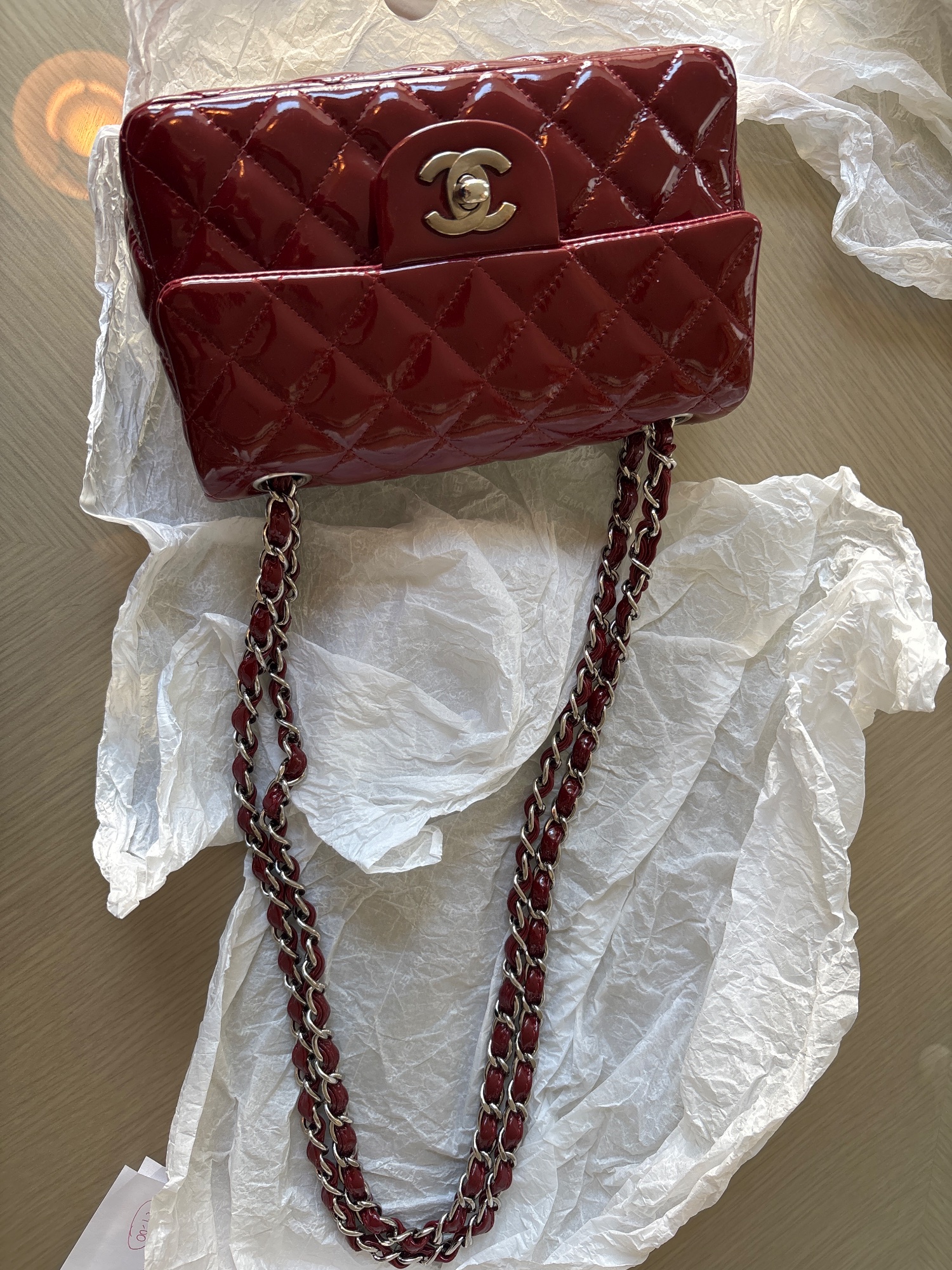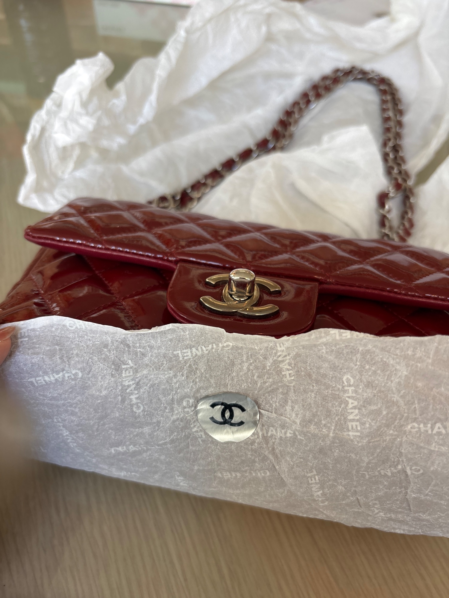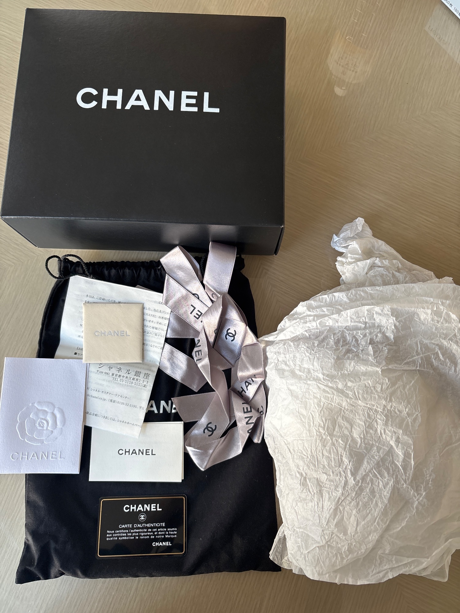 購入時のレシート、ご登録確認書、製造証明カード、エナメル商品注意書き、箱、シャネルの製品を包む薄紙、リボン、袋など全てあります。