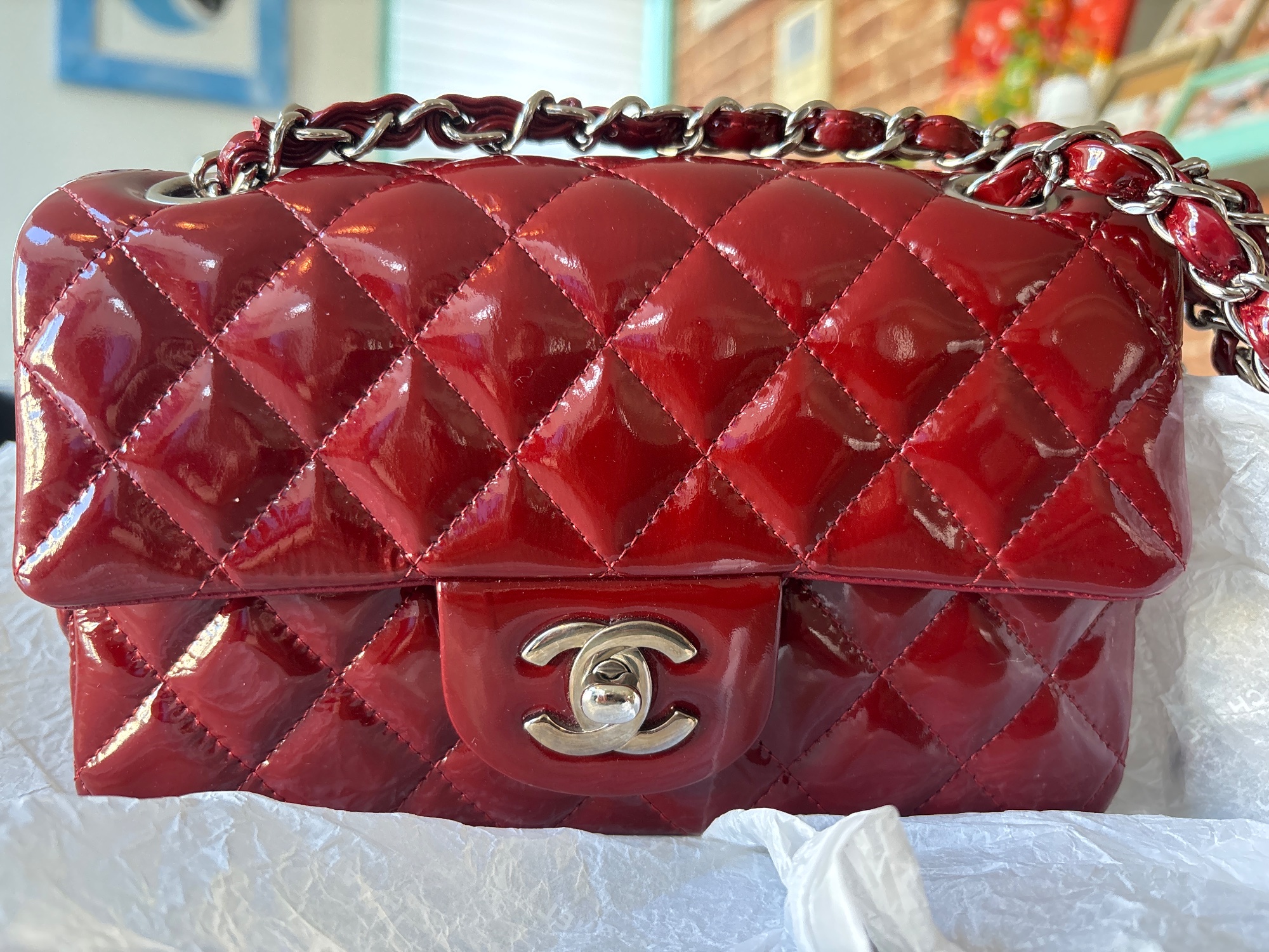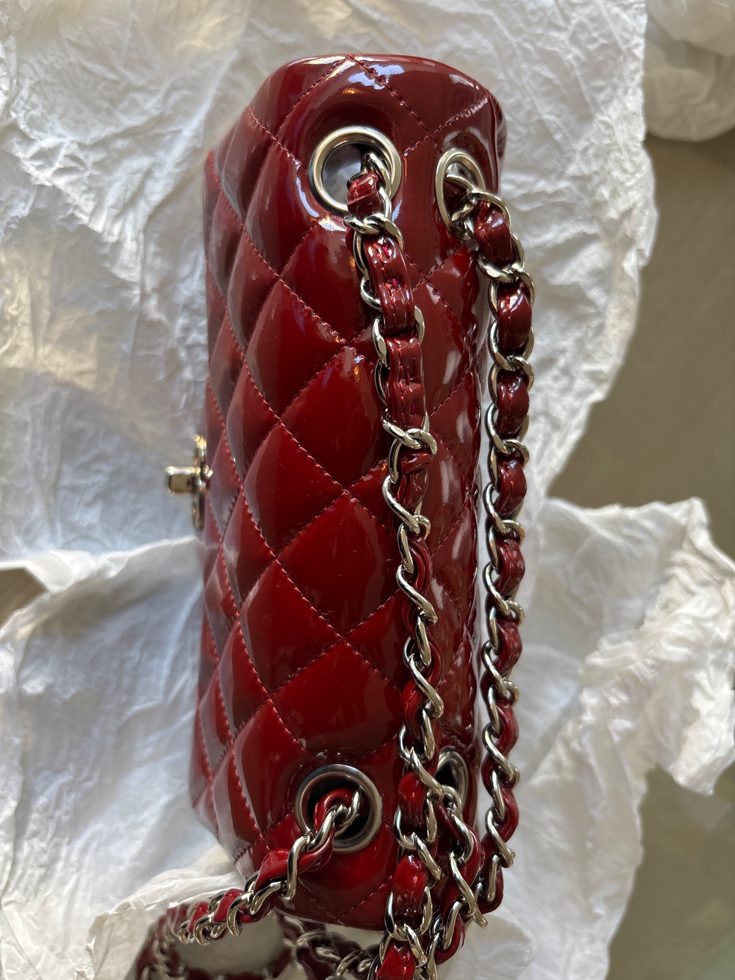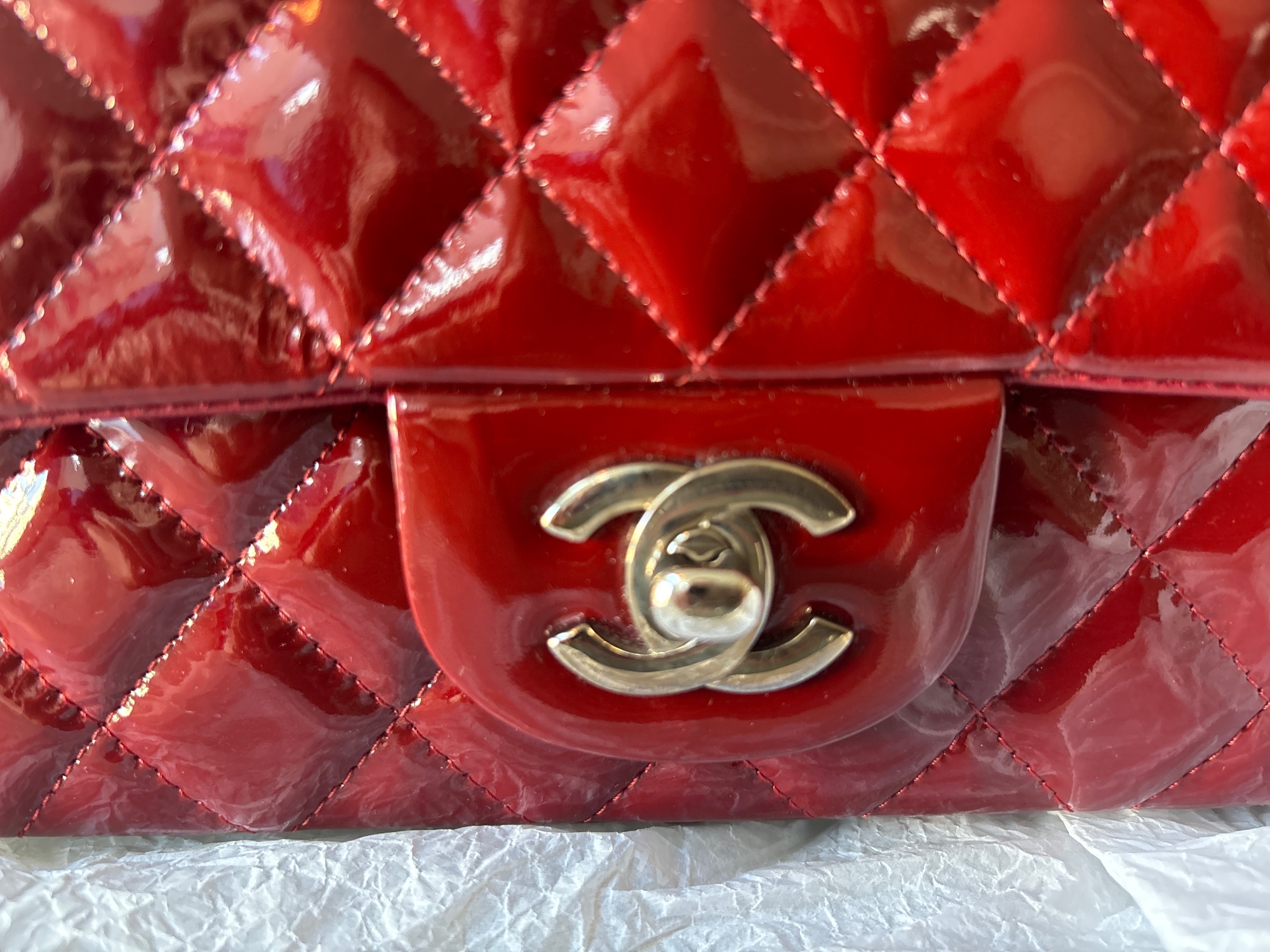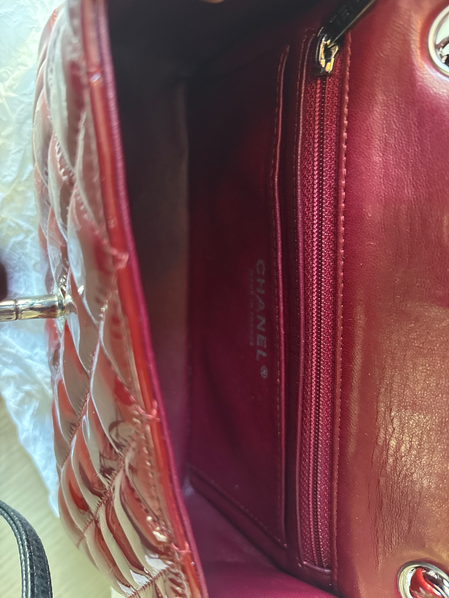 購入時のレシート、ご登録確認書、製造証明カード、エナメル商品注意書き、箱、シャネルの製品を包む薄紙、リボン、袋など全てあります。