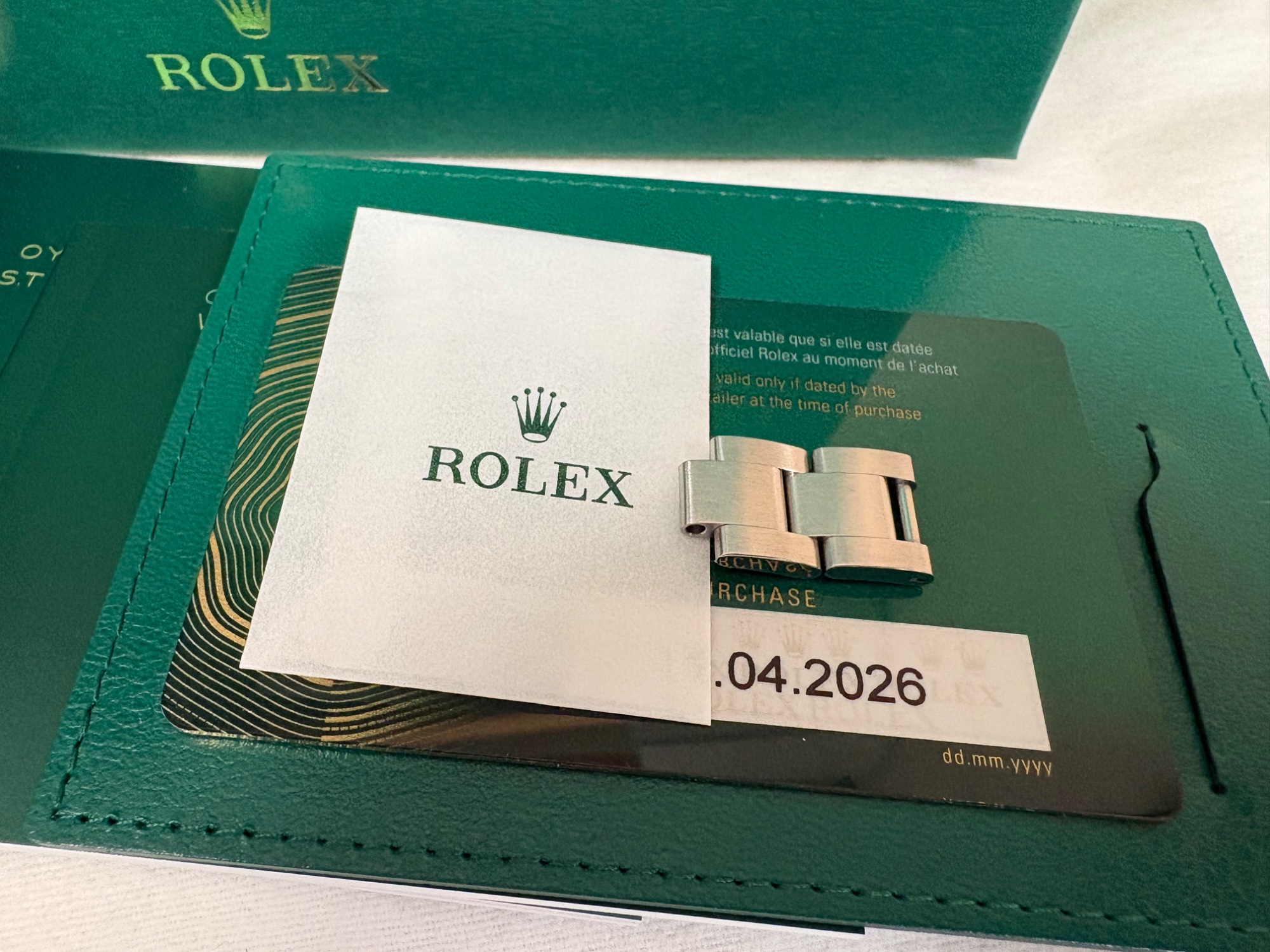国内正規ギャランティ日付2026/4/11、コマ調整済みシール無し未使用品、内外箱・ギャランティーカード・冊子2冊・グリーンタグ、余りコマ2個、装用は購入時に試着したのみです。