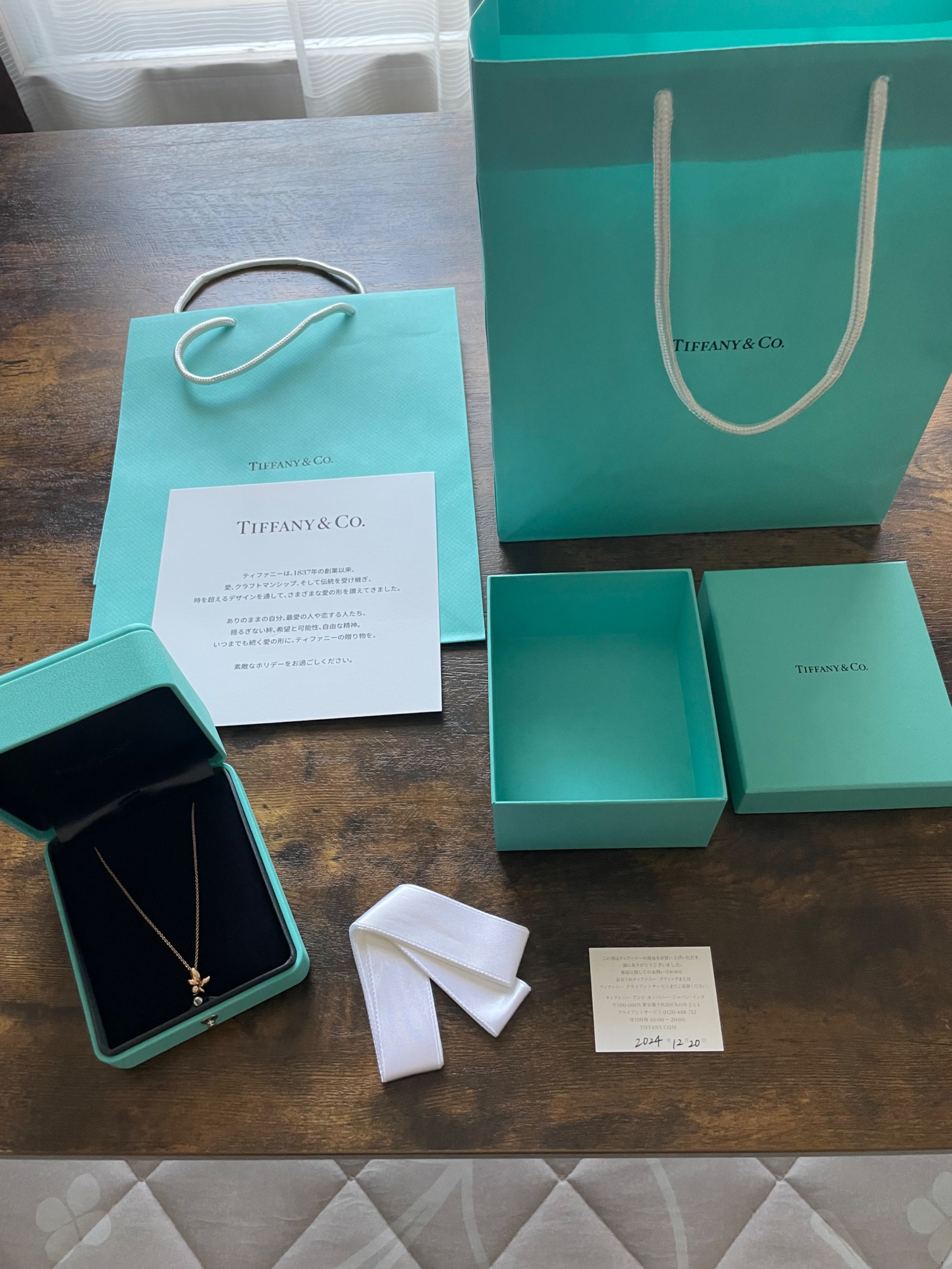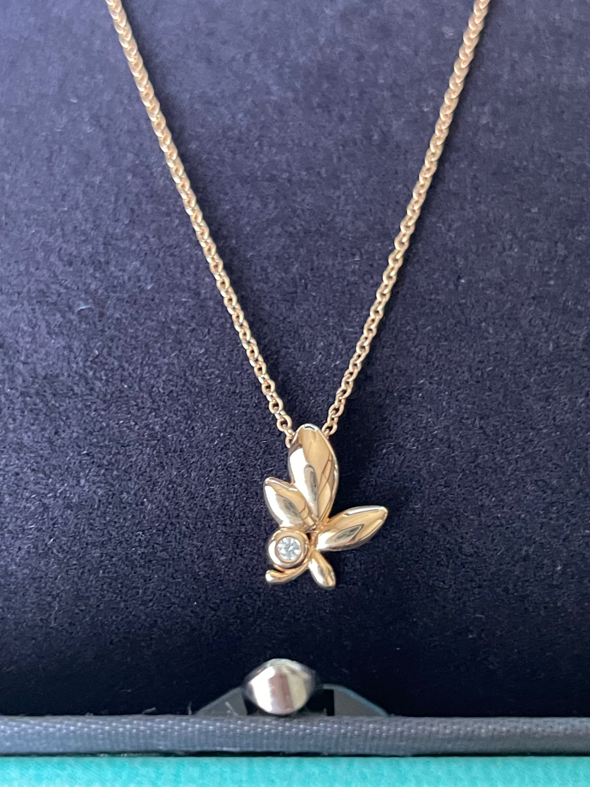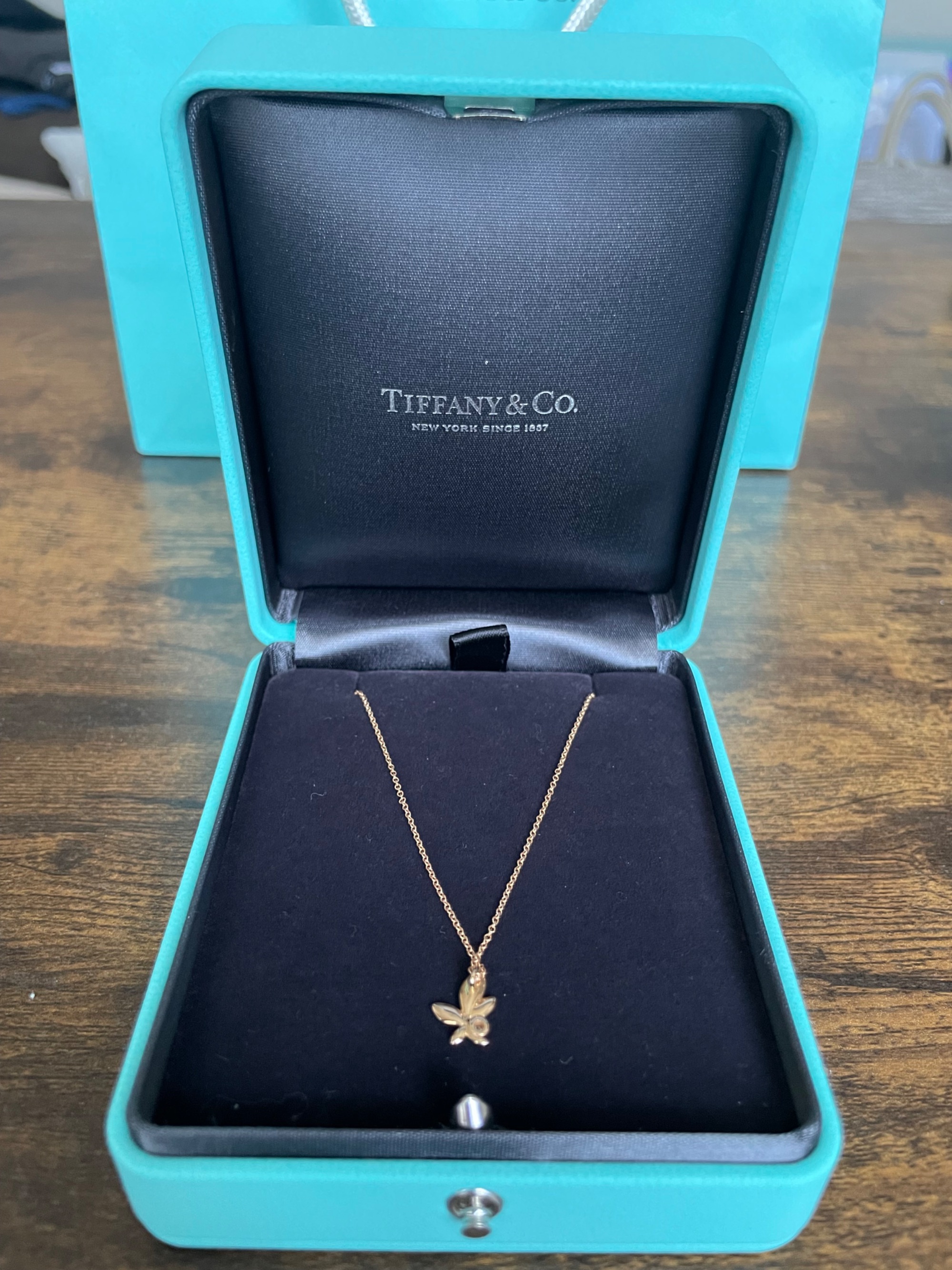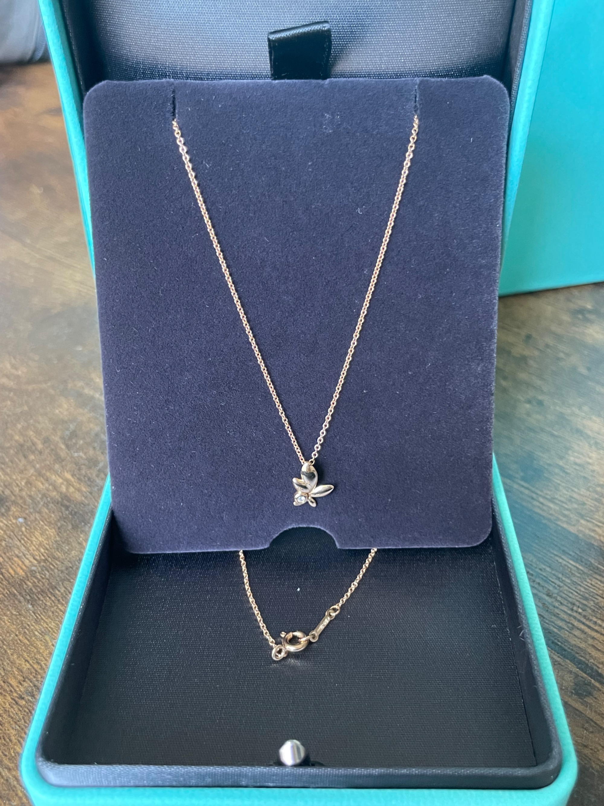 ティファニーの「オリーブリーフ」のピンクゴールドネックレスです。プリンセス丈です。