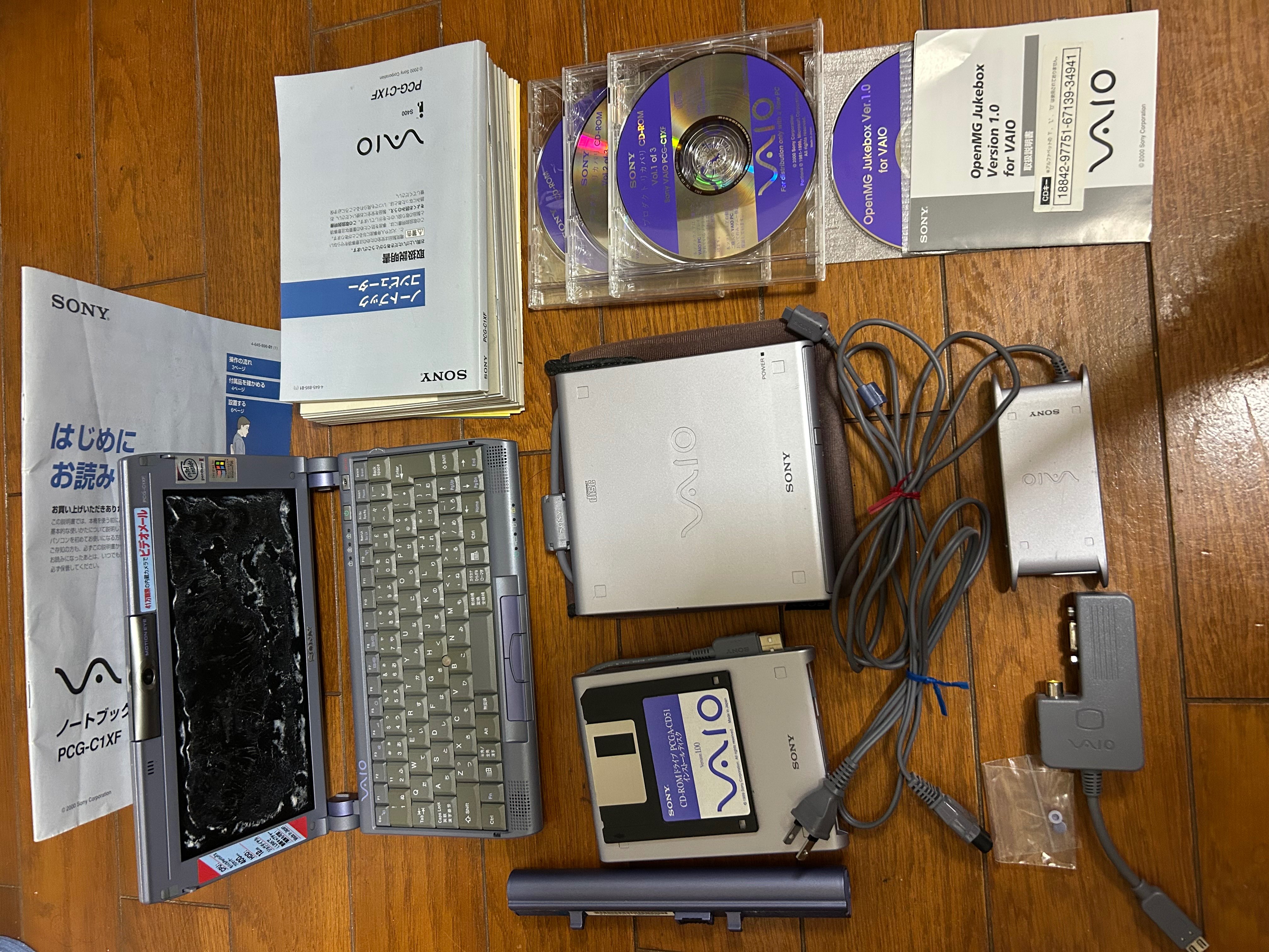 付属品あり、2000年2月購入、PCG-C1XF、説明書あり、液晶画面が白く糊っぽい、長年放置